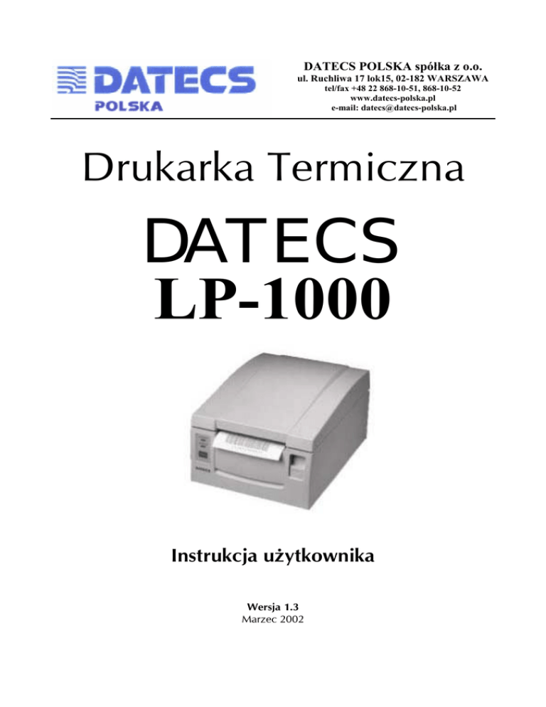 DATECS POLSKA spółka z o.o. ul. Ruchliwa 17 lok15, 02-182 WARSZAWA tel/fax +48 22 868-10-51, 868-10-52 www.datecs-polska.pl e-mail: [email protected] Drukarka Termiczna DATECS LP-1000 Instrukcja użytkownika Wersja 1.3 Marzec 2002 DATECS LP-1000 Instrukcja użytkownika SPIS TREŚCI WPROWADZENIE ................................................................................................................. 3 PARAMETRY DRUKARKI .................................................................................................. 4 STANDARDOWE WYPOSAŻENIE..................................................................................... 5 BUDOWA DRUKARKI .......................................................................................................... 5 OPIS ZŁĄCZ DRUKARKI .................................................................................................... 6 KONFIGURACJA DRUKARKI............................................................................................ 6 STOSOWANE ROLKI PAPIEROWE.................................................................................. 7 ZAKŁADANIE ROLKI PAPIEROWEJ............................................................................... 8 INFORMACJE TECHNICZNE........................................................................................... 10 ___________________________________________________________________________________________________________________ DATECS POLSKA Ltd, ul. Ruchliwa 17 lok.15, 02-182 Warszawa, Tel./Fax. (0-22) 868-10-51,868-10-52, e-mail: [email protected] 2 DATECS LP-1000 Instrukcja użytkownika WPROWADZENIE Niniejsza instrukcja przeznaczona jest dla użytkowników drukarki DATECS LP-1000. Zawiera ona wszystkie procedury pozwalające uruchomić nowo zakupioną drukarkę. Przed przystąpieniem do pracy, radzimy dokładnie przeczytać niniejszą instrukcję. UWAGI WSTĘPNE ! ! ! ! ! ! Nowo zakupioną drukarkę należy umieścić w miejscu osłoniętym przed działaniem promieni słonecznych, nie narażonym na nadmierne działanie kurzu, wilgoci i wysokiej temperatury. Nie ustawiać drukarki w pobliżu grzejników. Drukarkę należy czyścić przy użyciu czystej i miękkiej ściereczki. Nie używać do czyszczenia benzyny, rozpuszczalników lub innych aktywnych środków chemicznych. Drukarka jest zasilana zasilaczem podłączonym do sieci 220V, 50Hz. Napięcie zasilające drukarkę wynosi 24V a prąd 1.9A. Zaleca się stosowanie zasilacza oryginalnie dołączonego do drukarki. W przypadku stosowania innych zasilaczy powinny odpowiadać oryginalnym parametrom. Zasilacz drukarki nie posiada wyłącznika sieciowego, dlatego też powinien być podłączony do gniazdka znajdującego się w pobliżu drukarki i nie powinien być zasłonięty innymi sprzętami lub przedmiotami. Instalacja elektryczna (gniazdko), do którego podłączony będzie zasilacz drukarki powinna być chroniona od zwarć zainstalowanym na przewodzie fazowym bezpiecznikiem o prądzie znamionowym nie większym niż 16A. ___________________________________________________________________________________________________________________ DATECS POLSKA Ltd, ul. Ruchliwa 17 lok.15, 02-182 Warszawa, Tel./Fax. (0-22) 868-10-51,868-10-52, e-mail: [email protected] 3 DATECS LP-1000 Instrukcja użytkownika PARAMETRY DRUKARKI OPIS Wymiary Masa Zasilanie sieciowe Mechanizm drukujący Szybkość wydruku Rozdzielczość Wytrzymałość głowicy drukującej Wbudowany rozmiar czcionki Drukowane kolumny Wbudowane kody kreskowe Oprogramowanie Emulacja Port komunikacyjny Złącze Pamięć Temperatura pracy / wilgotność Temperatura przechowywania wilgotność Szerokość rolek Max średnica zewnętrzna rolki Zakładanie papieru Rodzaj papieru / LP-1000 145 x 156 x 190 [mm] – obudowa plastikowa 2 kg Zewnętrzny zasilacz 220V, 50Hz / 24V, 1.9A Termiczny 100 mm / s 8 pkt / mm, 203 dpi (pionowo i poziomo) 50 000 m A – 12 x 24 (1.5 x 3 mm); B – 9 x 16 (1.25 x 2 mm) Czcionka A – 48/36 znaki/wiersz; Czcionka B – 64/48 znaki/wiersz EAN, JAN, UPC A/E, CODE-39 / 93 / 128, ITF, CODEBAR Sterownik drukarki Windows ELTRON EPL2 RS232C - PC i waga Podłączenie szuflady 128 Kb 5°C ÷ 40°C / 35 – 85 % -20°C ÷ 60°C / 10 – 90 % 58 lub 80 [mm] 83 [mm] System easy paper setting Etykiety Drukarka DATECS LP-1000 przeznaczona jest do placówek produkcyjno-handlowych, w których istnieje potrzeba oznaczenia towaru etykietą z kodem kreskowym w celu usprawnienia identyfikacji towaru. Drukarka LP-1000 za pomocą wbudowanego portu RS-232C może współpracować z wagą elektroniczną DATECS DT-15LP, co pozwala na przyspieszenie obsługi klienta; a także z komputerem – z poziomu programu magazynowo-księgowego lub za pomocą oprogramowania komputerowego dla drukarki, istnieje możliwość wydrukowania etykiety identyfikującej dany produkt. Niewątpliwym atutem drukarki jest przede wszystkim niezawodność podzespołów, z których została wykonana. Natomiast szybki i cichy termiczny mechanizm drukujący zapewnia wysoki komfort pracy. ___________________________________________________________________________________________________________________ DATECS POLSKA Ltd, ul. Ruchliwa 17 lok.15, 02-182 Warszawa, Tel./Fax. (0-22) 868-10-51,868-10-52, e-mail: [email protected] 4 DATECS LP-1000 Instrukcja użytkownika STANDARDOWE WYPOSAŻENIE 1. 2. 3. 4. 5. 6. Drukarka DATECS LP-1000, Zasilacz 31AD z przewodem połączeniowym, Kabel komunikacyjny z komputerem, Rolka etykiet 80 [mm], Separator etykiet, Instrukcja użytkownika. BUDOWA DRUKARKI Obudowa Włącznik/ wyłącznik drukarki Pokrywa górna Przycisk otwarcia pokrywy górnej Sygnalizacja zasilania[POWER] Sygnalizacja błędu [ERROR] Przesuw papieru [FEED] ___________________________________________________________________________________________________________________ DATECS POLSKA Ltd, ul. Ruchliwa 17 lok.15, 02-182 Warszawa, Tel./Fax. (0-22) 868-10-51,868-10-52, e-mail: [email protected] 5 DAT