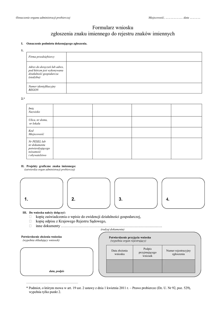 Formularz wniosku zgłoszenia znaku imiennego do rejestru znaków