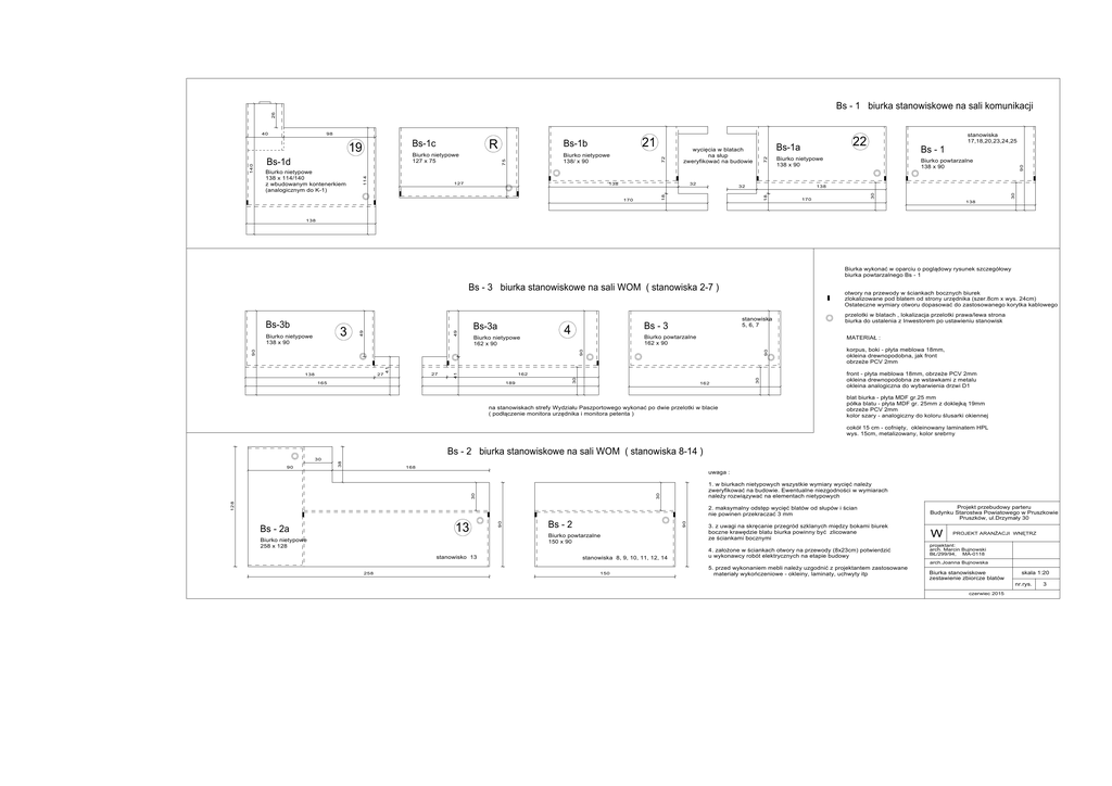 26 Bs - 1 biurka stanowiskowe na sali komunikacji 98 32 138 18 170 90 72 32 Biurko powtarzalne 138 x 90 170 30 138 Bs - 1 Biurko nietypowe 138 x 90 30 127 72 Biurko nietypowe 138/ x 90 stanowiska 17,18,20,23,24,25 22 Bs-1a wycięcia w blatach na słup zweryfikować na budowie 18 114 140 21 Bs-1b Biurko nietypowe 127 x 75 Bs-1d Biurko nietypowe 138 x 114/140 z wbudowanym kontenerkiem (analogicznym do K-1) R Bs-1c 19 75 40 138 138 Biurka wykonać w oparciu o poglądowy rysunek szczegółowy biurka powtarzalnego Bs - 1 Biurko powtarzalne 162 x 90 189 162 na stanowiskach strefy Wydziału Paszportowego wykonać po dwie przelotki w blacie ( podłączenie monitora urzędnika i monitora petenta ) 30 162 165 30 27 41 27 41 138 przelotki w blatach , lokalizacja przelotki prawa/lewa strona biurka do ustalenia z Inwestorem po ustawieniu stanowisk MATERIAŁ : 90 Biurko nietypowe 162 x 90 stanowiska 5, 6, 7 Bs - 3 4 90 Biurko nietypowe 138 x 90 Bs-3a otwory na przewody w ściankach bocznych biurek zlokalizowane pod blatem od strony urzędnika (szer.8cm x wys. 24cm) Ostateczne wymiary otworu dopasować do zastosowanego korytka kablowego 90 3 49 Bs-3b 49 Bs - 3 biurka stanowiskowe na sali WOM ( stanowiska 2-7 ) korpus, boki - płyta meblowa 18mm, okleina drewnopodobna, jak front obrzeże PCV 2mm front - płyta meblowa 18mm, obrzeże PCV 2mm okleina drewnopodobna ze wstawkami z metalu okleina analogiczna do wybarwienia drzwi D1 blat biurka - płyta MDF gr.25 mm półka blatu - płyta MDF gr. 25mm z doklejką 19mm obrzeże PCV 2mm kolor szary - analogiczny do koloru ślusarki okiennej cokół 15 cm - cofnięty, okleinowany laminatem HPL wys. 15cm, metalizowany, kolor srebrny 30 90 38 Bs - 2 biurka stanowiskowe na sali WOM ( stanowiska 8-14 ) 168 30 1. w biurkach nietypowych wszystkie wymiary wycięć należy zweryfikować na budowie. Ewentualne niezgodności w wymiarach należy rozwiązywać na elementach nietypowych Biurko nietypowe 258 x 128 stanowisko 13 Bs - 2 90 13 Bs - 2a 90 128 30 uwaga : Biurko powtarzalne 150 x 90 stanowiska 8, 9, 10, 11, 12, 14 2. maksymalny odstęp wycięć blatów od słupów i ścian nie powinen przekraczać 3 mm Projekt przebudowy parteru Budynku Starostwa Powiatowego w Pruszkowie Pruszków, ul.Drzymały 30 3. z uwagi na skręcanie przegród szklanych między bokami biurek boczne krawędzie blatu biurka powinny być zlicowane ze ściankami bocznymi W 4. założone w ściankach otwory na przewody (8x23cm) potwierdzić u wykonawcy robót elektrycznych na etapie budowy PROJEKT ARANŻACJI WNĘTRZ projektant: arch. Marcin Bujnowski BŁ/299/94, MA-0118 arch.Joanna Bujnowska 258 150 5. przed wykonaniem mebli należy uzgodnić z projektantem zastosowane materiały wykończeniowe - okleiny, laminaty, uchwyty itp Biurka stanowiskowe zestawienie zbiorcze blatów skala 1:20 nr.rys. czerwiec 2015 3