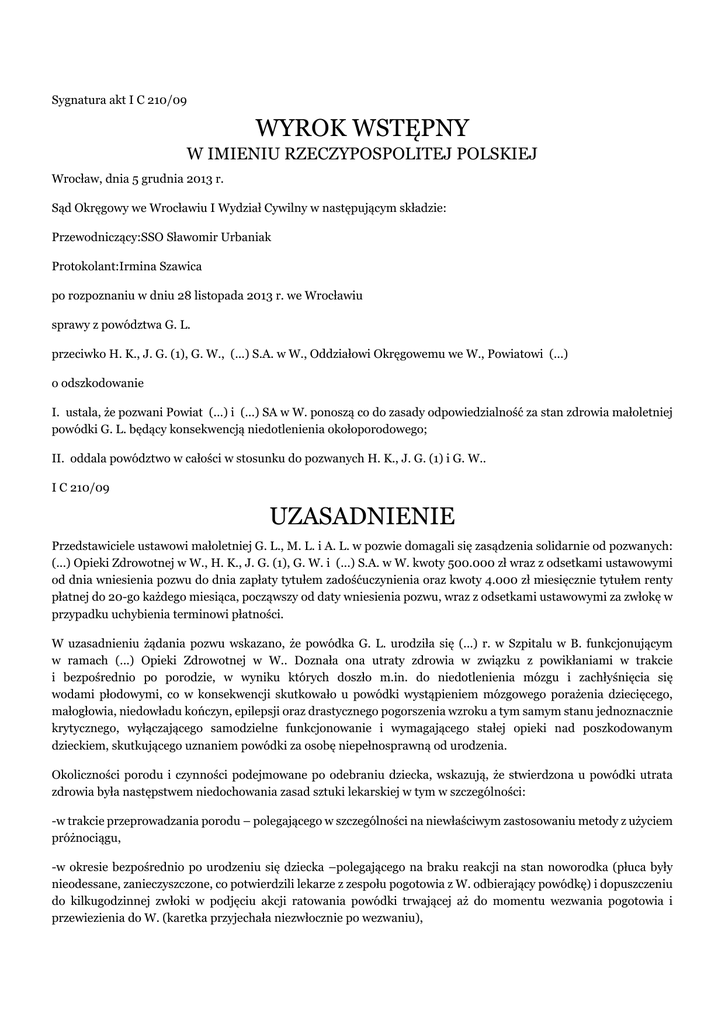 Sygnatura akt I C 210/09 WYROK WSTĘPNY W IMIENIU RZECZYPOSPOLITEJ POLSKIEJ Wrocław, dnia 5 grudnia 2013 r. Sąd Okręgowy we Wrocławiu I Wydział Cywilny w następującym składzie: Przewodniczący:SSO Sławomir Urbaniak Protokolant:Irmina Szawica po rozpoznaniu w dniu 28 listopada 2013 r. we Wrocławiu sprawy z powództwa G. L. przeciwko H. K., J. G. (1), G. W., (...) S.A. w W., Oddziałowi Okręgowemu we W., Powiatowi (...) o odszkodowanie I. ustala, że pozwani Powiat (...) i (...) SA w W. ponoszą co do zasady odpowiedzialność za stan zdrowia małoletniej powódki G. L. będący konsekwencją niedotlenienia okołoporodowego; II. oddala powództwo w całości w stosunku do pozwanych H. K., J. G. (1) i G. W.. I C 210/09 UZASADNIENIE Przedstawiciele ustawowi małoletniej G. L., M. L. i A. L. w pozwie domagali się zasądzenia solidarnie od pozwanych: (...) Opieki Zdrowotnej w W., H. K., J. G. (1), G. W. i (...) S.A. w W. kwoty 500.000 zł wraz z odsetkami ustawowymi od dnia wniesienia pozwu do dnia zapłaty tytułem zadośćuczynienia oraz kwoty 4.000 zł miesięcznie tytułem renty płatnej do 20-go każdego miesiąca, począwszy od daty wniesienia pozwu, wraz z odsetkami ustawowymi za zwłokę w przypadku uchybienia terminowi płatności. W uzasadnieniu żądania pozwu wskazano, że powódka G. L. urodziła się (...) r. w Szpitalu w B. funkcjonującym w ramach (...) Opieki Zdrowotnej w W.. Doznała ona utraty zdrowia w związku z powikłaniami w trakcie i bezpośrednio po porodzie, w wyniku których doszło m.in. do niedotlenienia mózgu i zachłyśnięcia się wodami płodowymi, co w konsekwencji skutkowało u powódki wystąpieniem mózgowego porażenia dziecięcego, małogłowia, niedowładu kończyn, epilepsji oraz drastycznego pogorszenia wzroku a tym samym stanu jednoznacznie krytycznego, wyłączającego samodzielne funkcjonowanie i wymagającego stałej opieki nad poszkodowanym dzieckiem, skutkującego uznaniem powódki za osobę niepełnosprawną od urodzenia. Okoliczności porodu i czynności podejmowane po odebraniu dziecka, wskazują, że stwierdzona u powódki utrata zdrowia była następstwem niedochowania zasad sztuki lekarskiej w tym w szczególności: -w trakcie przeprowadzania porodu – polegającego w szczególności na niewłaściwym zastosowaniu metody z użyciem próżnociągu, -w okresie bezpośrednio po urodzeniu się dziecka –polegającego na braku reakcji na stan noworodka (płuca były nieodessane, zanieczyszczone, co potwierdzili lekarze z zespołu pogotowia z W. odbierający powódkę) i dopuszczeniu do kilkugodzinnej zwłoki w podjęciu akcji ratowania powódki trwającej aż do momentu wezwania pogotowia i przewiezienia do W. (karetka przyjechała niezwłocznie po wezwaniu), -przy diagnozowaniu stanu dziecka i jej matki w trakcie ciąży – polegającego w szczególności na pominięciu zagrożonego stanu matki, w tym zatrucia w końcowym okresie, gdy pomimo stwierdzonych komplikacji i przeprowadzanej hospitalizacji, lekarz ginekolog prowadzący ciążę zaniechał wcześniejszego przeprowadzenia porodu. Istotny jest w szczególności zawarty w kartach informacyjnych z hospitalizacji w szpitalach we W., opis stanu w jakim powódka została karetką pogotowia przywieziona w dniu urodzenia, w którym wymagała ona podjęcia natychmiastowej akcji ratunkowej, a które to działania, możliwe do szybszego przeprowadzenia zostały zaniechane w okresie bezpośrednio po porodzie, podczas pobytu w Szpitalu w B., gdzie powódka przebywała od 11.30 (poród) do przyjazdu karetki wezwanej dopiero po 4 godzinach (ok. 15.30). Z zapisów tych wynika jednoznacznie jakie następstwa w zakresie utraty zdrowia powstały w początkowym okresie (których później nie udało się odwrócić), czego potwierdzeniem są zapisy w kartach informacyjnych opisujących kolejne, późniejsze hospitalizacje. Poród jak i opieka w trakcie ciąży, w szczególności hospitalizacja matki, a następnie opieka lekarska nad noworodkiem do momentu przewiezienia karetką pogotowia w dniu narodzin do Szpitala we W., odbywała się w Szpitalu w B. wchodzącym w skład pozwanego ad 1 (...) Opieki Zdrowotnej w W.. Pozwani ad 2-4 byli lekarzami uczestniczącymi w opisanych powyżej czynnościach, którzy ponoszą, zdaniem strony powodowej, solidarną odpowiedzialność za powstałą utratę zdrowia powódki. 1. Pozwana ad 2 H. K. jako lekarz pediatra, która zajmowała się dzieckiem po porodzie, przede wszystkim zaniechała niezwłocznej reakcji i podjęcia akcji ratunkowej po porodzie, pomimo krytycznego stanu powódki; 2. Pozwany ad 3 J. G. (1) jako lekarz ginekolog, który prowadził matkę w trakcie ciąży, m.in. podejmował decyzje o hospitalizacji i następnie o zwolnieniu matki ze szpitala (niewłaściwą jak się później okazało) w 36 tygodniu ciąży a jednocześnie pełnił funkcję ordynatora pozwanego ad 1; 3. pozwany ad 1 G. W. jako lekarz ginekolog, który przyjmował poród i jest odpowiedzialny za podjęcie decyzji o przeprowadzeniu porodu z zastosowaniem metody użycia próżnociągu oraz za sposób przeprowadzenia porodu. Odpowiedzialność pozwanego ad 5 (...) S.A. z siedzibą w W. wynikać miała z tego, że podmiot ten został wskazany przez pozostałych pozwanych jako towarzystwo ubezpieczeniowe obejmujące ochroną ubezpieczeniową skutki działalności medycznej w zakresie odpowiedzialności cywilnej na podstawie polisy nr (...) (polisa odpowiedzialności cywilnej zakładu opieki zdrowotnej –grupa (...)). Uzasadniając wysokość dochodzonych kwot podano, że kwoty te zostały ustalone w wysokości odpowiadającej zakresowi praktycznie całkowitej utraty zdrowia powódki jak i w przypadku renty, zwiększonym potrzebom wynikającym przede wszystkim z konieczności pokrywania kosztów leczenia, rehabilitacji (w szczególności zakupy leków, odżywek, wyjazdy), sprawowania stałej opieki wykluczającej możliwość wykonywania pracy zarobkowej przez matkę po