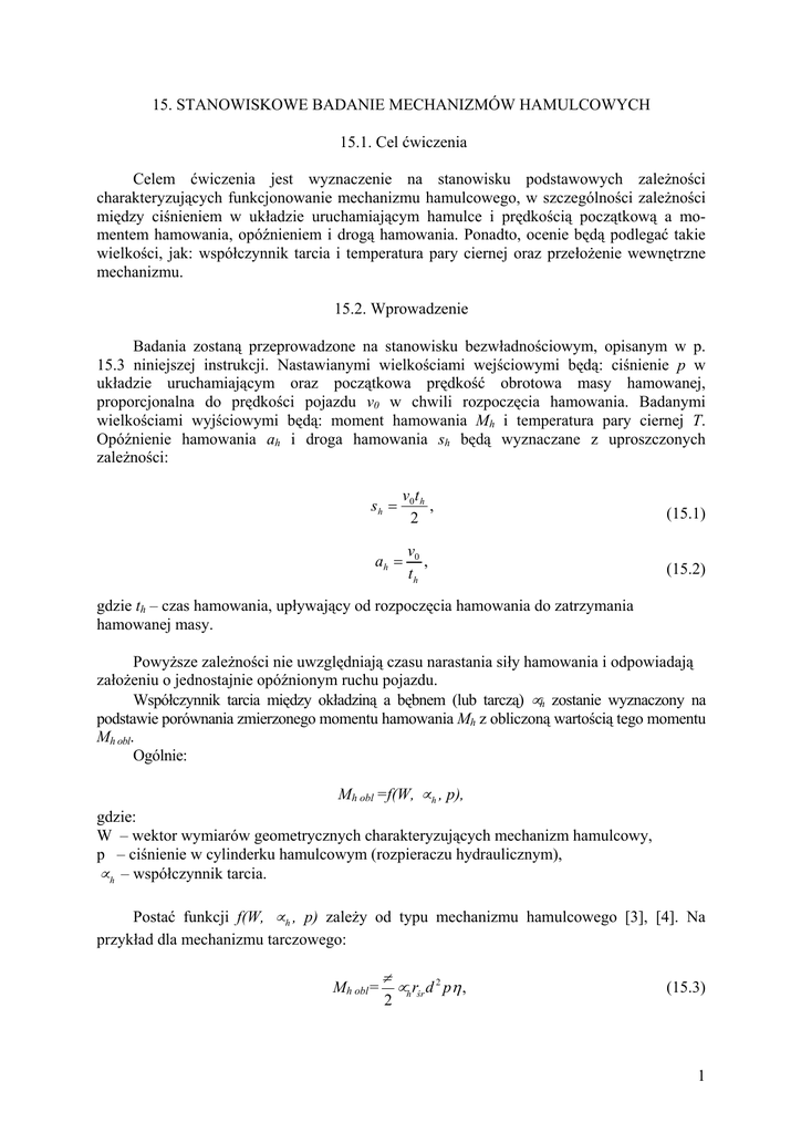 15. STANOWISKOWE BADANIE MECHANIZMÓW HAMULCOWYCH 15.1. Cel ćwiczenia Celem ćwiczenia jest wyznaczenie na stanowisku podstawowych zależności charakteryzujących funkcjonowanie mechanizmu hamulcowego, w szczególności zależności między ciśnieniem w układzie uruchamiającym hamulce i prędkością początkową a momentem hamowania, opóźnieniem i drogą hamowania. Ponadto, ocenie będą podlegać takie wielkości, jak: współczynnik tarcia i temperatura pary ciernej oraz przełożenie wewnętrzne mechanizmu. 15.2. Wprowadzenie Badania zostaną przeprowadzone na stanowisku bezwładnościowym, opisanym w p. 15.3 niniejszej instrukcji. Nastawianymi wielkościami wejściowymi będą: ciśnienie p w układzie uruchamiającym oraz początkowa prędkość obrotowa masy hamowanej, proporcjonalna do prędkości pojazdu v0 w chwili rozpoczęcia hamowania. Badanymi wielkościami wyjściowymi będą: moment hamowania Mh i temperatura pary ciernej T. Opóźnienie hamowania ah i droga hamowania sh będą wyznaczane z uproszczonych zależności: sh = v0 t h , 2 (15.1) v0 , th (15.2) ah = gdzie th – czas hamowania, upływający od rozpoczęcia hamowania do zatrzymania hamowanej masy. Powyższe zależności nie uwzględniają czasu narastania siły hamowania i odpowiadają założeniu o jednostajnie opóźnionym ruchu pojazdu. Współczynnik tarcia między okładziną a bębnem (lub tarczą) µh zostanie wyznaczony na podstawie porównania zmierzonego momentu hamowania Mh z obliczoną wartością tego momentu Mh obl. Ogólnie: Mh obl =f(W, µ h , p), gdzie: W – wektor wymiarów geometrycznych charakteryzujących mechanizm hamulcowy, p – ciśnienie w cylinderku hamulcowym (rozpieraczu hydraulicznym), µ h – współczynnik tarcia. Postać funkcji f(W, µ h , p) zależy od typu mechanizmu hamulcowego [3], [4]. Na przykład dla mechanizmu tarczowego: Mh obl= π 2 µ h rśr d 2 pη , (15.3) 1 przy czym: rśr ≈ 2 rz3 − rw3 , 3 rz2 − rw2 (15.4) oraz: d p p = ps s d p 2 , (15.5) Porównując Mh=Mh obl , można wyznaczyć µ h : µh = 2M h . π ⋅ rśr d 2 pη (15.6) We wzorach przyjęto oznaczenia: - średnica tłoka w siłowniku pneumatycznym, ds - średnica tłoczka w pompie hamulcowej, dp - średnica tłoczka zacisku hamulca tarczowego (tłoczka cylinderka hamulca bębnowego), d - średni promień tarcia, rśr - zewnętrzny, wewnętrzny promień powierzchni tarcia, rz,w - zmierzone ciśnienie w siłowniku pneumatycznym, ps - obliczone ciśnienie w pompie hamulcowej (układzie hydraulicznym) pp - zmierzony moment tarcia, Mh Mh obl - moment tarcia obliczony wg zależności (15.3), η - sprawność mechanizmu hamulcowego (tylko części mechanicznej) (η ≈ 0,98) . Przełożenie wewnętrzne mechanizmu wyznacza się z zależności: iw = Mh , rFr (15.7) gdzie: Fr – siła rozpierająca (ściskająca w hamulcu tarczowym), przy czym dla hamulca hydraulicznego: Fr = πd 2 4 p, (15.8) r – dla hamulca bębnowego promień bębna, dla hamulca tarczowego średni promień tarcia (r=rśr). 2 15.3. Urządzenie badawcze Ćwiczenie zostanie przeprowadzone na stanowisku badawczym, którego schemat przedstawiono na rys. 15.1. a) b) Rys. 15.1. Schemat stanowiska do badań hamulców: a) schemat uproszczony, b) schemat szczegółowy. • • W skład stanowiska wchodzą: hydrauliczny dwuobwodowy układ uruchamiający hamulce, wyposażony w zespół pompy hamulcowej, obecnie zabudowany mechanizm hamulca tarczowego (3); opcjonalnie może zostać dodatkowo zabudowany hamulec bębnowy (4); 3 • układ inercyjny dla prób hamowania hamulcami (3) oraz (4), składający się; z masy wirującej (20), rozpędzanej przed próbą silnikiem elektrycznym (1). Moment bezwładności masy (20) dobrany jest w taki sposób, aby energia kinetyczna tej masy (zamieniana na ciepło w procesie hamowania) była w przybliżeniu równa energii odbieranej przez hamulec jednego koła podczas hamowania rzeczywistym pojazdem. Masa (20) połączona jest z silnikiem (1) za pomocą sprzęgła jednotarczowego (19), a z hamulcami (3) oraz (4) bezpośrednio wałem; • mechanizm włączania, składający się z siłownika pneumatycznego (5), zasilanego ze zbiornika sprężonego powietrza i działającego na tłoczek pompy hamulcowej tak jak pedał hamulca, układ (17) sterowania silnikiem elektrycznym (1), ręczne zawory odcinające (7) i (8). Powietrze do zbiornika dostarczane jest przez sprężarkę. Dodatkowo zbiornik wyposażony jest w zawór upustowy; • układ pomiarowy, składający się z: czujników siły (9) oraz (10) wraz ze wzmacniaczami pomiarowymi (12) i (13), czujnika (15) prędkości obrotowej masy hamowanej (20) wraz z tarczą (2), czujnika temperatury tarczy hamulcowej - pirometru (16), elektropneumatycznego zaworu proporcjonalnego (18) - pełniącego również rolę czujnika ciśnienia w siłowniku (5). Sygnały z poszczególnych czujników są rejestrowane w funkcji czasu poprzez układ akwizycji danych komputera stanowiska pomiarowego. Na rys. 15.2 przedstawiono przykładowe przebiegi czasowe zarejestrowanych wielkości. Rys. 15.2. Przykładowe przebiegi czasowe zarejestrowanych wielkości na stanowisku do badania hamulców Uwaga. W niniejszym ćwiczeniu opisane stanowisko będzie wykorzystywane w niepełnym zakresie. 4 15.4. Sposób wykonania ćwiczenia Wykonać trzy serie prób hamowania: a) dla różnych wartości ciśnienia w siłowniku pneumatycznym (5) przy niezmiennej prędkości początkowej hamowanej masy oraz temperaturze początku hamowania b) zmieniając prędkość początkową hamowanej masy przy stałej wartości ciśnienia w siłowniku pneumatycznym (5) i stałej temperaturze początku hamowania. c) powtarzając kolejno 16-18 razy próbę hamowania przy maksymalnej prędkości początkowej i ze stałą oraz maksymalną wartością ciśnienia w siłowniku pneumatycznym (5), przy wyłączonym chłodzeniu. Podczas wszystkich prób wymienionych w punktach a, b i c pomiarom podlegają: prędkość począt