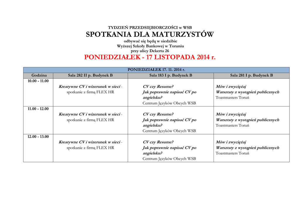 TYDZIEŃ PRZEDSIĘBIORCZOŚCI w WSB SPOTKANIA DLA MATURZYSTÓW odbywać się będą w siedzibie Wyższej Szkoły Bankowej w Toruniu przy ulicy Dekerta 26 PONIEDZIAŁEK - 17 LISTOPADA 2014 r. Godzina 10.00 - 11.00 Sala 282 II p. Budynek B Kreatywne CV i wizerunek w sieci spotkanie z firmą FLEX HR PONIEDZIAŁEK 17. 11. 2014 r. Sala 183 I p. Budynek B CV czy Resume? Jak poprawnie napisać CV po angielsku? Sala 281 I p. Budynek B Mów i zwyciężaj Warsztaty z wystąpień publicznych Toastmasters Toruń Centrum Języków Obcych WSB 11.00 - 12.00 Kreatywne CV i wizerunek w sieci spotkanie z firmą FLEX HR CV czy Resume? Jak poprawnie napisać CV po angielsku? Mów i zwyciężaj Warsztaty z wystąpień publicznych Toastmasters Toruń Centrum Języków Obcych WSB 12.00 - 13.00 Kreatywne CV i wizerunek w sieci spotkanie z firmą FLEX HR CV czy Resume? Jak poprawnie napisać CV po angielsku? Centrum Języków Obcych WSB Mów i zwyciężaj Warsztaty z wystąpień publicznych Toastmasters Toruń