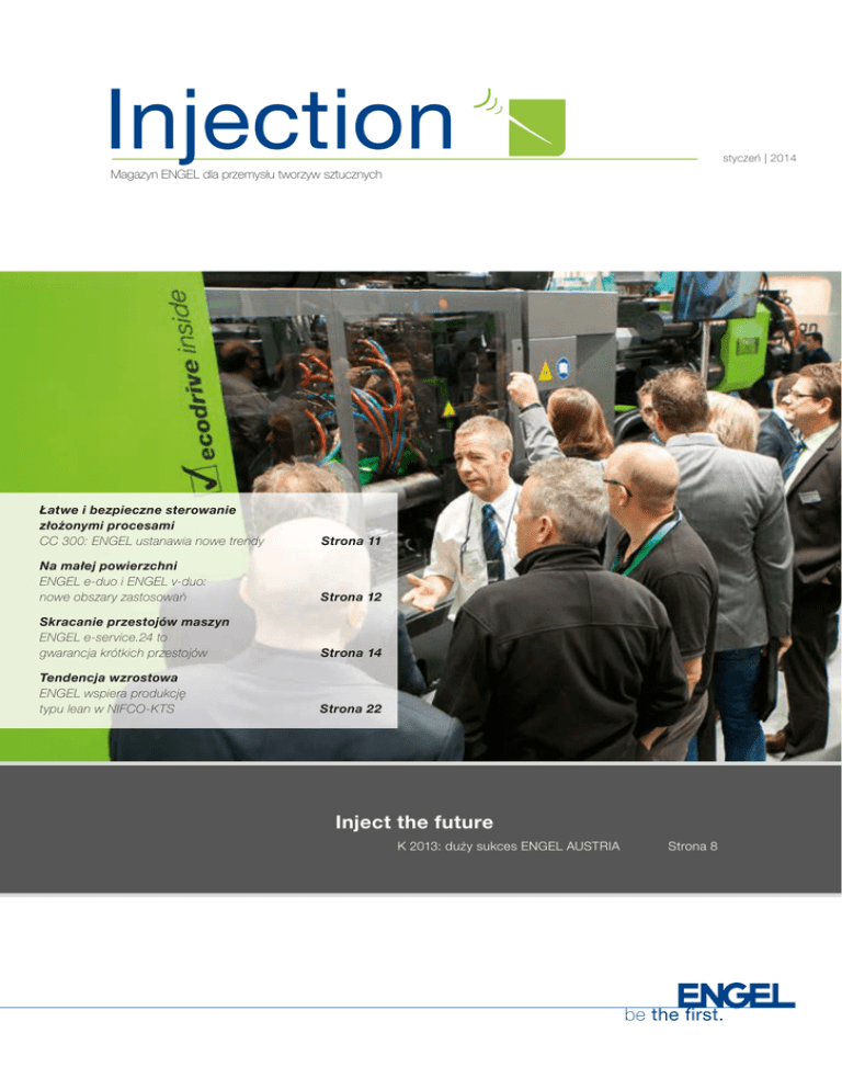 Injection styczeń | 2014 Magazyn ENGEL dla przemysłu tworzyw sztucznych Łatwe i bezpieczne sterowanie złożonymi procesami CC 300: ENGEL ustanawia nowe trendy Strona 11 Na małej powierzchni ENGEL e-duo i ENGEL v-duo: nowe obszary zastosowań Strona 12 Skracanie przestojów maszyn ENGEL e-service.24 to gwarancja krótkich przestojów Strona 14 Tendencja wzrostowa ENGEL wspiera produkcję typu lean w NIFCO-KTS Strona 22 Inject the future K 2013: duży sukces ENGEL AUSTRIA Strona 8 be the first. Człowiek i maszyna W minionych latach odnotowano znaczący wzrost wydajności wtryskarek. W odniesieniu do czasu cyklu, zużycia energii czy ich żywotności. Także efektywność tych urządzeń rośnie z roku na rok. Zapominamy niestety, o jednej bardzo ważnej rzeczy. A mianowicie, że w dalszym ciągu największy wpływ na skuteczność i efektywność maszyny ma człowiek. Stąd też tak ważna rola w tym układzie, jaką odgrywa jednos tka sterująca wtryskarki czy całego gniazda produkcyjnego. I nie tylko dlatego, że dzięki niej optymalizowane są wszystkie główne procesy i przebiegi, ale przed wszystkim dlatego, że dzięki niej operator maszyny precyzyjnie ustawia parametry dotyczące efektywności produkcji, wydajności, stabilności procesu czy też jakości produktu. Dr Peter Neumann, CEO ENGEL Holding Wraz ze stałym wzrostem kompleksowości poszczególnych procesów, wzrastają także oczekiwania w stosunku do jednostki sterującej. Postrzegamy ten trend dwojako: przez ostatnie lata położyliśmy duży nacisk na szkolenia operatorów maszyn. Efektem jest nasza mocno rozbudowana oferta szkoleniowa, zarówno u klienta lub za pośrednictwem mediów elektronicznych tak, aby stale móc pogłębiać wiedzę operatorów maszyn. Z drugiej strony, konsekwentnie pracowaliśmy nad rozwojem naszej jednostki sterującej, aby pomimo stale rosnącej ilości funkcji, była ona coraz łatwiejsza i bardziej przyjazna w obsłudze. Nowa generacja jednostek sterujących ENGEL CC 300 stała się jednym z przebojów minionych targów K. Doskonale zdajemy sobie sprawę z oczekiwań naszych klientów: obsługa sterownika musi być intuicyjna, proces cały czas pod kontrolą, a wszelkie odchylenia muszą być łatwe do zidentyfikowania. Takie są wymagania naszych klientów i tą zasadą kierowaliśmy się w trakcie prac nad CC 300: szybka identyfikacja i natychmiastowa reakcja. Efektem końcowym jest najnowocześniejsza na świecie jednostka sterująca wtryskarki. CC 300 posiada funkcjonalność smartphone’a i podobnie jak on reaguje na dotyk, co znacznie ułatwia obsługę i czyni ją bardziej komfortową. Jedyny na rynku centralny element sterujący obsługi: e-move, pozwala operatorowi w pełni panować nad maszyną i jej złożonymi procesami. Tym samym obsługa maszyny staje się tak zindywidualizowana, jak człowiek, który ją obsługuje. W wywiadzie na temat tej technologii (str. 10), zdradzamy więcej szczegółów, dotyczących możliwości i potencjału naszych jednostek sterujących nowej generacji. Życzę Państwu ciekawej lektury z nowym numerem „Injection”. STOPKA REDAKCYJNA Wydawca: ENGEL AUSTRIA GmbH | ul. Ludwig-Engel 1, A-4311 Schwertberg, www.engelglobal.com Zespół redakcyjny: Susanne Zinckgraf, ENGEL / Gerd Liebig, ENGEL (odpowiedzialny) Layout: neudesign – büro für visuelle kommunikation (agencja reklamowa) Injection jest magazynem dla klientów ENGEL. Jest publikowany regularnie w języku niemieckim, angielskim i polskim. Artykuły mogą być przedrukowywane za zgodą wydawcy i z podaniem źródła. Nowości Wydarzenia bieżące Retrospektywy 4 ENGEL na świecie. Na miejscu. Targi, wydarzenia, projekty 7 ENGEL na świecie. Ludzie. 8 K 2013 – duży sukces ENGEL AUSTRIA. 11 CC 300 – łatwe i bezpieczne sterowanie złożonymi procesami Wywiad z Gerhardem Dimmlerem und Hannesem Fritzem 12 Na małej powierzchni ENGEL eduo i ENGEL vduo: nowe obszary zastosowań 14 Skracanie przestojów maszyn ENGEL eservice.24 to gwarancja krótkich przestojów 15 Produkcja pojemników: łatwo i szybko Tara.ru wybiera wielkogabarytową wtryskarkę ENGEL duo 16 Czyste korzyści TOPOLEKO stawia na bezpieczeństwo produkcji 18 Niskie koszty jednostkowe z ENGEL combimelt Metak proponuje innowacyjne rozwiązania z tworzyw sztucznych 20 Dobry początek z 12 wtryskarkami ENGEL victory Technika bezkolumnowa podnosi wydajność w Luc & Bel 22 Tendencja wzrostowa ENGEL wspiera produkcję typu lean w NIFCOKTS ENGEL na świecie. Na miejscu. Więcej miejsca na odbiór maszyn dla klientów ENGEL po raz kolejny inwestuje w Schwertbergu Tylko półtora roku po powiększeniu terenów zakładu w kierunku południowym, ENGEL powiększa się w Schwertbergu o nową halę montażową od strony północnej. Zwiększa ona ilość miejsca dla maszyn przeznaczonych do odbioru przez klientów. Nowa hala montażowa odpowiada najnowszym trendom i została zaprojektowana dla maszyn o ciężarze do 40 ton, zgodnie z wyraźnym trendem rosnącego popytu na wtryskarki o dużych rozmiarach. E NGEL produkuje obecnie w Schwertbergu maszyny z siłą zwarcia do 650 ton. Do największych produkowanych tu maszyn należy hybrydowa wtryskarka o wysokiej wydajności ENGEL e-speed. Przez ostatnie dwa lata ENGEL zainwestował około 50 milionów euro w rozwój i modernizację swoich austriackich zakładów w Schwertbergu, St. Valentin i Dietach. Integracja procesu w najlepszym wydaniu Swiss Plastics w Lucernie Maksymalna precyzja, bezpieczeństwo w połączeniu z minimalną powierzchnią posadowienia: na targach Swiss Plastics, koniec stycznia 2014 r. w Lucernie, ENGEL prezentował, jak dzięki innowacyjnej technice wtryskowej realizować szczególnie wymagające zadania. E NGEL po raz pierwszy pojawił się z własnym stoiskiem na szwajcarskich targach tworzyw sztucznych. W trakcie trzydniowych targów, ENGEL zaprezentował na przykładzie ENGEL e-victory 160 combi, trójkomponentowej wtryskarce ze zintegrowanym wieloosiowym 