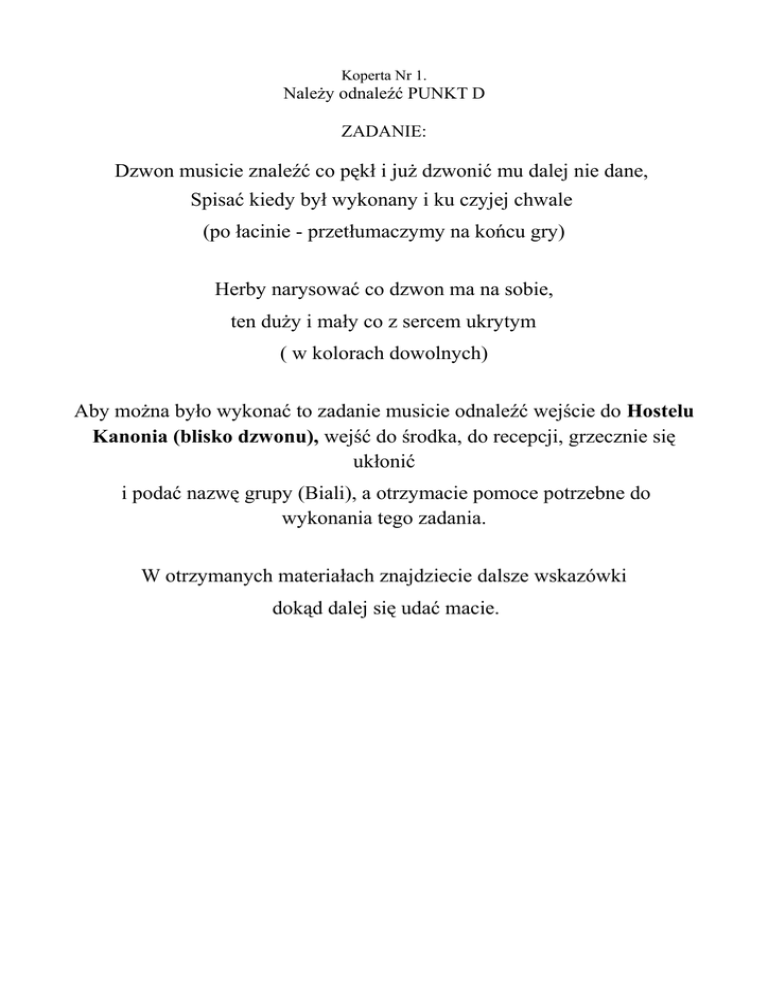 Koperta Nr 1. Należy odnaleźć PUNKT D ZADANIE: Dzwon musicie znaleźć co pękł i już dzwonić mu dalej nie dane, Spisać kiedy był wykonany i ku czyjej chwale (po łacinie - przetłumaczymy na końcu gry) Herby narysować co dzwon ma na sobie, ten duży i mały co z sercem ukrytym ( w kolorach dowolnych) Aby można było wykonać to zadanie musicie odnaleźć wejście do Hostelu Kanonia (blisko dzwonu), wejść do środka, do recepcji, grzecznie się ukłonić i podać nazwę grupy (Biali), a otrzymacie pomoce potrzebne do wykonania tego zadania. W otrzymanych materiałach znajdziecie dalsze wskazówki dokąd dalej się udać macie. Po ukończeniu zadania z dzwonem należy odnaleźć: PUNKT C ZADANIE: Należy odnaleźć ulicę o nazwie: „Kamienne schodki” Trzeba policzyć ile schodków jest od ulicy Krzywe Koło do ulicy Brzozowej, odszukać dalszą część schodków i policzyć je dalej od ulicy Brzozowej do ulicy Bugaj, a następnie obliczyć ile jest razem wszystkich kamiennych schodków. Zadanie Specjalne Do wykonania na końcu Kamiennych Schodków: ZAGADKA: Pośród rzeźb różnych, rzeźba - ni ryba, ni ptak to, w listowiu ukryta nagrodę Wam da. Po zakończeniu zadania należy wrócić schodkami do ulicy Krzywe Koło (po drodze policzyć jeszcze raz schodki – sprawdzić czy dobrze Wam wyszła ich suma) Na górze, po ukończeniu zadania, możecie otworzyć kopertę nr 2. TU ZAPISZCIE ILOŚĆ SCHODKÓW ................ koperta nr 2 Należy odnaleźć PUNKT B ZADANIE: Drużyna musi odnaleźć na mapie punkt B i dotrzeć tam. Podpowiedź: gospodynią tam Syrenka. Gdy na miejsce dotrzecie Pokłonić się pięknie Syrence musicie, pozna żeście spragnieni i wody Wam da J Zadaniem jest znalezienie naczynia (butelki, woreczka itp.), do którego musicie nalać trochę wody z jednej z pomp w pobliżu Syrenki. Nabranej wody musicie pilnować i donieść ją do końca gry. WODA Z POMP NIE NADAJE SIĘ DO PICIA !!!!!! Po wykonaniu zadania możecie otworzyć kopertę nr 3. koperta nr 3 PUNKT A PUNKT A Pomnik Jana Kilińskiego ZADANIE: Ulice: Podwale, Rycerska lub Piekarska wiodą Do pomnika męża wielkiego, z uniesioną szablą stojącego. Tymi drogami dotrzeć tam możecie, Przy zegarze zodiaków gościa tego znajdziecie. Zadaniem Waszym będzie poznać Pana tego I opisać kim był on, i co zrobił dobrego. Z trzema przechodniami wywiad dziennikarski przeprowadzić macie Jak mądrze coś powiedzą to faceta poznacie J (można użyć kartki i długopisu lub dyktafonu) Drużyna, która zbierze najwięcej informacji wygrywa ! ! ! Po wykonaniu tego zadania możecie otworzyć kopertę nr 4. Znajdźcie punkt E Adres: Warszawskie Centrum Informacji Turystycznej Plac Zamkowy 1/13; 00-262 Warszawa Wejdźcie do środka i poproście o informację dla Białych. Koperta nr 5 PUNKT E Zadaniem jest znaleźć schody ruchome przy trasie W-Z (były to pierwsze ruchome schody w Warszawie) Schodami trzeba zjechać na dół. Na dole, przy wyjściu z tunelu schodów znajduje się budka telefoniczna Orange, trzeba podejść do telefonu i czekać aż zadzwoni. Dobrze trzeba słuchać bo dzwoni bardzo cicho „pikając”. Gdy usłyszycie pikanie telefonu jedna osoba musi podnieść słuchawkę i odebrać telefon, wtedy dowiecie się więcej J Finał zabawy: Organizator stoi na tarasie widokowym Kościoła Św. Anny i widzi z góry dzieci przy budce telefonicznej. Dzwoni na numer budki (należy zawsze sprawdzić wcześniej czy telefon w budce jest sprawny) i przekazuje dzieciom informację: Gratulacje, Dotarliście do końca gry. Spójrzcie do tyłu, na górę. Widzicie jasną wieżę? Pomachajcie mi. Wjedźcie z powrotem schodami na górę i znajdźcie wejście na taras widokowy wieży, czekam tu na Was. Wejście na taras widokowy jest płatne, należy wcześniej opłacić wejście dla wszystkich dzieci.