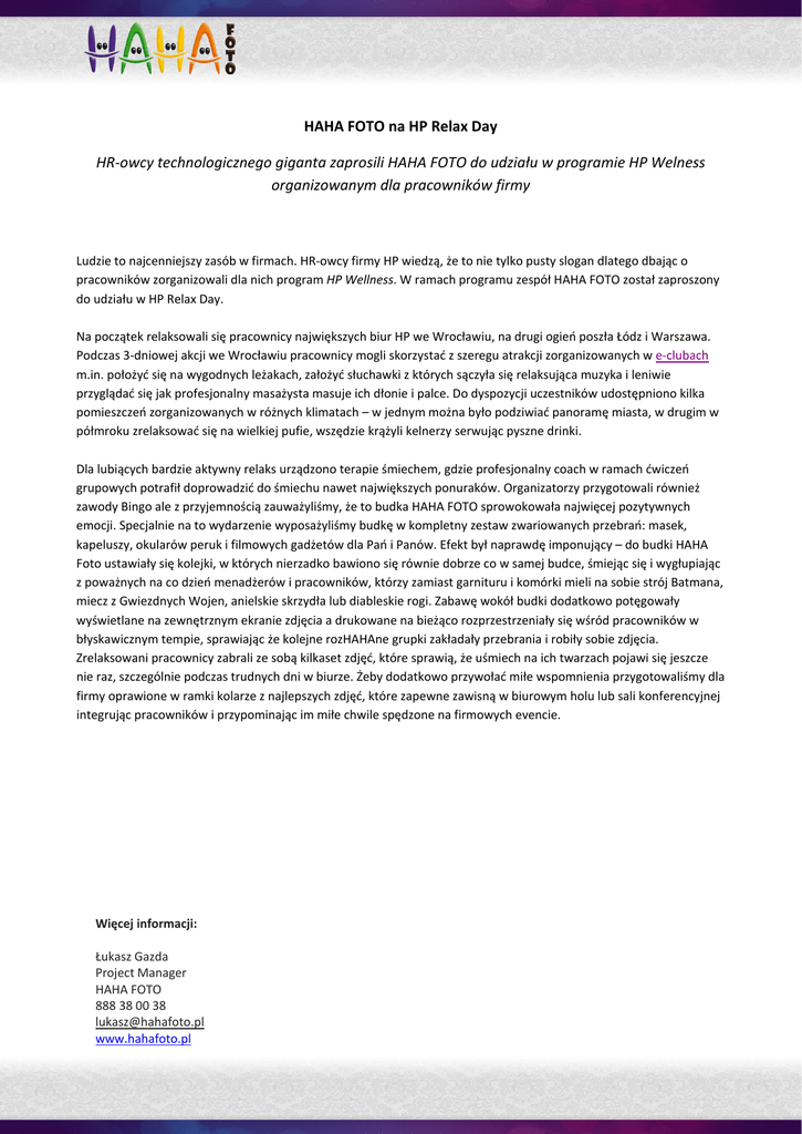 HAHA FOTO na HP Relax Day HR-owcy technologicznego giganta zaprosili HAHA FOTO do udziału w programie HP Welness organizowanym dla pracowników firmy Ludzie to najcenniejszy zasób w firmach. HR-owcy firmy HP wiedzą, że to nie tylko pusty slogan dlatego dbając o pracowników zorganizowali dla nich program HP Wellness. W ramach programu zespół HAHA FOTO został zaproszony do udziału w HP Relax Day. Na początek relaksowali się pracownicy największych biur HP we Wrocławiu, na drugi ogień poszła Łódz i Warszawa. Podczas 3-dniowej akcji we Wrocławiu pracownicy mogli skorzystać z szeregu atrakcji zorganizowanych w e-clubach m.in. położyć się na wygodnych leżakach, założyć słuchawki z których sączyła się relaksująca muzyka i leniwie przyglądać się jak profesjonalny masażysta masuje ich dłonie i palce. Do dyspozycji uczestników udostępniono kilka pomieszczeń zorganizowanych w różnych klimatach – w jednym można było podziwiać panoramę miasta, w drugim w półmroku zrelaksować się na wielkiej pufie, wszędzie krążyli kelnerzy serwując pyszne drinki. Dla lubiących bardzie aktywny relaks urządzono terapie śmiechem, gdzie profesjonalny coach w ramach ćwiczeń grupowych potrafił doprowadzić do śmiechu nawet największych ponuraków. Organizatorzy przygotowali również zawody Bingo ale z przyjemnością zauważyliśmy, że to budka HAHA FOTO sprowokowała najwięcej pozytywnych emocji. Specjalnie na to wydarzenie wyposażyliśmy budkę w kompletny zestaw zwariowanych przebrań: masek, kapeluszy, okularów peruk i filmowych gadżetów dla Pań i Panów. Efekt był naprawdę imponujący – do budki HAHA Foto ustawiały się kolejki, w których nierzadko bawiono się równie dobrze co w samej budce, śmiejąc się i wygłupiając z poważnych na co dzień menadżerów i pracowników, którzy zamiast garnituru i komórki mieli na sobie strój Batmana, miecz z Gwiezdnych Wojen, anielskie skrzydła lub diableskie rogi. Zabawę wokół budki dodatkowo potęgowały wyświetlane na zewnętrznym ekranie zdjęcia a drukowane na bieżąco rozprzestrzeniały się wśród pracowników w błyskawicznym tempie, sprawiając że kolejne rozHAHAne grupki zakładały przebrania i robiły sobie zdjęcia. Zrelaksowani pracownicy zabrali ze sobą kilkaset zdjęć, które sprawią, że uśmiech na ich twarzach pojawi się jeszcze nie raz, szczególnie podczas trudnych dni w biurze. Żeby dodatkowo przywołać miłe wspomnienia przygotowaliśmy dla firmy oprawione w ramki kolarze z najlepszych zdjęć, które zapewne zawisną w biurowym holu lub sali konferencyjnej integrując pracowników i przypominając im miłe chwile spędzone na firmowych evencie. Więcej informacji: Łukasz Gazda Project Manager HAHA FOTO 888 38 00 38 [email protected] www.hahafoto.pl 2