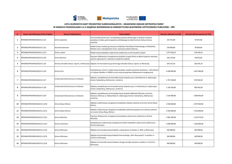LISTA ZŁOŻONYCH KART PROJEKTÓW SUBREGIONALNYCH – KRAKOWSKI OBSZAR METROPOLITARNY W RAMACH PODDZIAŁANIA 4.3.2 GŁĘBOKA MODERNIZACJA ENERGETYCZNA BUDYNKÓW UŻYTECZNOŚCI PUBLICZNEJ - SPR LP Numer identyfikacyjny Karty Projektu Nazwa Projektodawcy Wartość całkowita (w PLN) Wartość dofinansowania (w PLN) 155 762,00 93 457,00 150 000,00 90 000,00 1 077 620,32 578 520,32 163 375,00 98 025,00 376 537,29 183 676,73 4 500 000,00 2 667 000,00 1 707 240,00 870 692,00 Głęboka, kompleksowa termomodernizacja budynku przy ul. Sienkiewicza 5, obejmująca branże: budowlaną, elektryczną i sanitarną 1 138 160,00 580 462,00 Tytuł projektu 1 RPOWM/SPR/KOM/2015/4.3.2/1 Gmina Łapanów Termomodernizacja wraz z przebudową systemu grzewczego w budynku świetlicy wiejskiej w Grabiu, gmina Łapanów wchodzącego w skład Centrum Kultury Gminy Łapanów 2 RPOWM/SPR/KOM/2015/4.3.2/2 Aerolub Krakowski Modernizacja instalacji grzewczej w budynkach Aeroklubu Krakowskiego w Pobiedniku Wielkim wraz z dociepleniem ścian i wymianą stolarki okiennej 3 RPOWM/SPR/KOM/2015/4.3.2/3 Gmina Lubień Modernizacja budynków użyteczności publicznej na terenie gminy Lubień Poprawa efektywności energetycznej budynku Urzędu Gminy w Bochni poprzez wymianę systemu ogrzewania i częściowe ocieplenie budynku 4 RPOWM/SPR/KOM/2015/4.3.2/4 Gmina Bochnia 5 RPOWM/SPR/KOM/2015/4.3.2/5 Gminny Ośrodek Kultury i Sportu w Wiśniowej Głęboka Termomodernizacja Gminnego Ośrodka Kultury i Sportu w Wiśniowej 6 RPOWM/SPR/KOM/2015/4.3.2/6 Gmina Pcim Kompleksowy remont i modernizacja budynku zespołu placówek oświatowo - kulturalnych w Trzebuni (działka nr 10992) w celu znacznej poprawy efektywności energetycznej 7 RPOWM/SPR/KOM/2015/4.3.2/7 Uniwersytet Ekonomiczny w Krakowie Głęboka, kompleksowa termomodernizacja budynku przy ul.Sienkiewicza 4, obejmująca branże: budowlaną, elektryczną i sanitarną 8 RPOWM/SPR/KOM/2015/4.3.2/8 9 RPOWM/SPR/KOM/2015/4.3.2/9 Uniwersytet Ekonomiczny w Krakowie Głęboka, kompleksowa termomodernizacja budynku Biblioteki Głównej na terenie Kampusu UEK przy ul. Rakowickiej 27, obejmująca branże: budowlaną, elektryczną i sanitarną 3 154 600,00 1 608 846,00 10 RPOWM/SPR/KOM/2015/4.3.2/10 Gmina Nowy Wiśnicz Głęboka modernizacja energetyczna budynków edukacji szkolnej na terenie Gminy Nowy Wiśnicz 3 450 600,00 2 070 360,00 11 RPOWM/SPR/KOM/2015/4.3.2/11 Gmina Nowy Wiśnicz Głęboka modernizacja energetyczna budynków administracyjnych oraz ochrony zdrowia na terenie Gminy Nowy Wiśnicz 2 350 000,00 1 410 000,00 12 RPOWM/SPR/KOM/2015/4.3.2/12 Gmina Miechów Poprawa efektywności energetycznej budynków użyteczności publicznej w Gminie Miechów 3 584 290,98 2 150 574,59 13 RPOWM/SPR/KOM/2015/4.3.2/13 Gmina Iwanowice Kompleksowa modernizacja energetyczna dwóch budynków użyteczności publicznej w Gminie Iwanowice 2 600 000,00 1 560 000,00 14 RPOWM/SPR/KOM/2015/4.3.2/14 Gmina Wiśniowa Głęboka termomodernizacja budynku urzędu gminy na działce nr 2031 w Wiśniowej 550 000,00 285 000,00 15 RPOWM/SPR/KOM/2015/4.3.2/15 Gmina Wiśniowa Głęboka termomodernizacja budynku komunalnego „Dom Nauczyciela” na działce nr 2115/2 w Wiśniowej 350 000,00 180 000,00 16 RPOWM/SPR/KOM/2015/4.3.2/16 Gmina Wiśniowa Głęboka termomodernizacja budynku starego ośrodka zdrowia na działce nr 2111/2 w Wiśniowej 300 000,00 180 000,00 Uniwersytet Ekonomiczny w Krakowie 17 RPOWM/SPR/KOM/2015/4.3.2/17 Gmina Wiśniowa Głęboka termomodernizacja budynku Zespołu Placówek Oświatowych na działce nr 852 w Lipniku 430 000,00 258 000,00 18 RPOWM/SPR/KOM/2015/4.3.2/18 Gmina Rzezawa Termomodernizacja budynku Zespołu Szkół w Dąbrówce, gmina Rzezawa 770 950,00 368 310,00 19 RPOWM/SPR/KOM/2015/4.3.2/19 Gmina Koszyce Kompleksowa modernizacja energetyczna zespołu budynków użyteczności publicznej w Gminie Koszyce 1 000 000,00 600 000,00 20 RPOWM/SPR/KOM/2015/4.3.2/20 Powiat Krakowski Modernizacja energetyczna budynku Zespołu Szkół i Placówek Oświatowych w Skale wraz z wyminą źródła ciepła. 2 413 424,00 1 448 054,40 21 RPOWM/SPR/KOM/2015/4.3.2/21 Zgromadzenie Sióstr Misjonarek Apostolstwa Głęboka modernizacja energetyczna budynku Sióstr Pallotynek przy ulicy Cechowej 135 w Katolickiego (Siostry Pallotynki) Prowincja Krakowie Polska 2 124 070,00 1 274 442,00 22 RPOWM/SPR/KOM/2015/4.3.2/22 Ośrodek Kultury Kraków – Nowa Huta Kultura ciepła i ekologiczna - termomodernizacja klubów kultury 300 000,00 180 000,00 23 RPOWM/SPR/KOM/2015/4.3.2/23 Samodzielny Publiczny Zaklad Opieki Zdrowotnej w Bochni Szpital Powiatowy im. Bł. Marty Wieckiej w Bochni Termomodernizacja obiektów Samodzielnego Publicznego Zakładu Opieki Zdrowotnej "Szpital Powiatowy" im. Bł. Marty Wieckiej w Bochni 1 510 512,01 880 496,86 24 RPOWM/SPR/KOM/2015/4.3.2/24 Szpital Św. Anny w Miechowie Modernizacja energetyczna kompleksu budynków szpitala Św. Anny w Miechowie 2 930 690,00 1 745 261,64 25 RPOWM/SPR/KOM/2015/4.3.2/25 Klasztor Sióstr Dominikanek „Na Gródku” Termomodernizacja budynku wraz z dociepleniem ścian i wymianą stolarki okiennej w kamienicy należącej do Klasztoru Dominikanek „Na Gródku” na ul. Mikołajskiej 17, 19 w Krakowie 300 000,00 180 000,00 26 RPOWM/SPR/KOM/2015/4.3.2/26 Gmina Gdów Termomodernizacja budynku Szkoły Podstawowej przy ul. Myślenickiej w Gdowie oraz poprawa efektywności energetycznej w Gimnazjum w Gdowie 861 000,00 420 000,00 27 RPOWM/SPR/KOM/2015/4.3.2/27 Gmina Nowy Wiśnicz Głęboka modernizacja energetyczna budynku przedszkola w Starym Wiśniczu 350 000,00 210 000,00 28 RPOWM/SPR/KOM/2015/4.3.2/28 Gmina Nowy Wiśnicz Głęboka modernizacja energetyczna budynków użyteczności publicznej związanej ze spędzaniem czasu wolnego na terenie Gminy Nowy Wiśnicz 1 270 000,00 762 000,00 29 RPOWM/SPR/KOM/2015/4.3.2/29 Związek Międzygminny d.s. Gazyfikacji, Rozwoju Terenów Wiejskich i Ochrony Środowiska w Proszowicach Podniesienie efektywności energetycznej obiekt