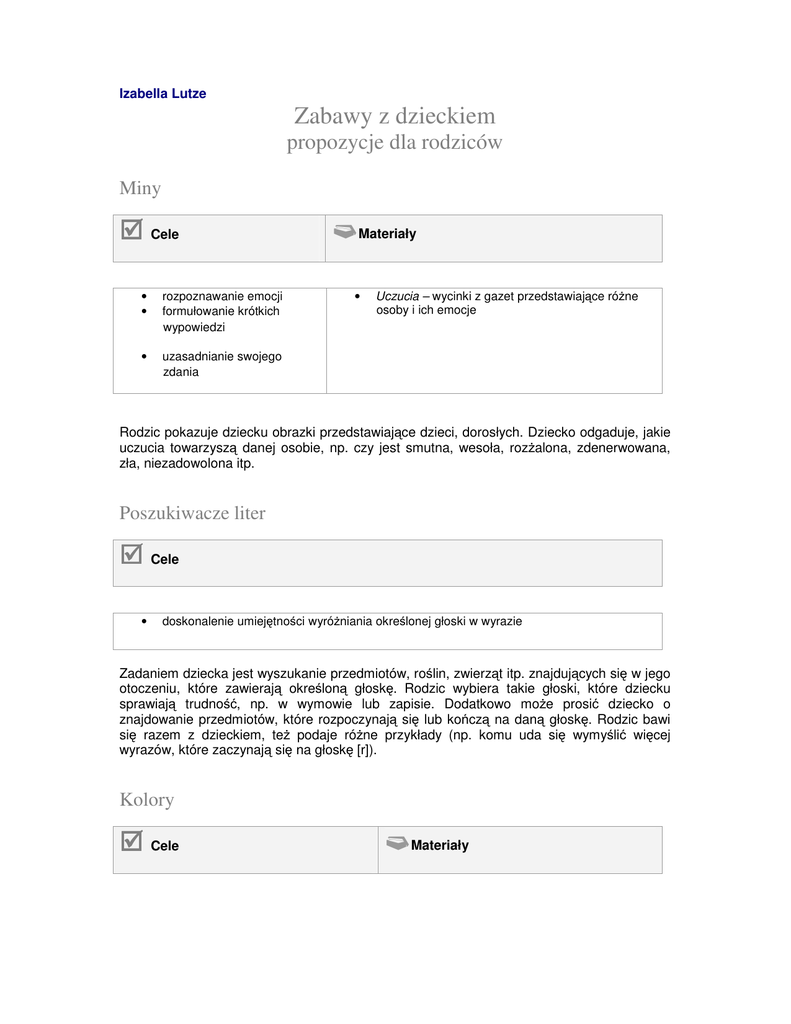 Izabella Lutze Zabawy z dzieckiem propozycje dla rodziców Miny Cele • • rozpoznawanie emocji formułowanie krótkich wypowiedzi • uzasadnianie swojego zdania Materiały • Uczucia – wycinki z gazet przedstawiające róŜne osoby i ich emocje Rodzic pokazuje dziecku obrazki przedstawiające dzieci, dorosłych. Dziecko odgaduje, jakie uczucia towarzyszą danej osobie, np. czy jest smutna, wesoła, rozŜalona, zdenerwowana, zła, niezadowolona itp. Poszukiwacze liter Cele • doskonalenie umiejętności wyróŜniania określonej głoski w wyrazie Zadaniem dziecka jest wyszukanie przedmiotów, roślin, zwierząt itp. znajdujących się w jego otoczeniu, które zawierają określoną głoskę. Rodzic wybiera takie głoski, które dziecku sprawiają trudność, np. w wymowie lub zapisie. Dodatkowo moŜe prosić dziecko o znajdowanie przedmiotów, które rozpoczynają się lub kończą na daną głoskę. Rodzic bawi się razem z dzieckiem, teŜ podaje róŜne przykłady (np. komu uda się wymyślić więcej wyrazów, które zaczynają się na głoskę [r]). Kolory Cele Materiały • doskonalenie sprawności fizycznej dziecka • utrwalanie nazw zwierząt • piłka Jest to odmiana gry w kolory. Dziecko podaje nazwy zwierząt, które są koloru białego, zielonego, Ŝółtego itp. W czasie podawania nazw dorosły i dziecko rzucają do siebie piłkę. Kim jestem? Cele • rozwijanie sprawności fizycznej dziecka Dziecko i dorosły naśladują chód lub dźwięki wydawane przez zwierzęta i odgadują nawzajem, co to za zwierzę. Dawno temu… Cele • rozwijanie wyobraźni dziecka • doskonalenie umiejętności budowania wypowiedzi ustnej Dorosły opowiada dziecku niedokończoną historyjkę: Dawno temu Ŝyła sobie dziewczynka, która miała na imię Baja. Dziewczynka mieszkała w zaczarowanym królestwie, w którym wszystkie zamki i budowle były koloru fioletowego. Pewnego dnia, kiedy szła do szkoły, spotkała ją czerwona Ŝaba i powiedziała… Zadaniem dziecka jest dokończenie historii. Dorosły moŜe zachęcić dziecko do wymyślenia własnej niedokończonej historii, którą tym razem on kończy. Zagubione miesiące Cele • utrwalenie nazw miesięcy oraz kolejności ich występowania Dorosły wymienia dziecku według kolejności miesiące, zawsze jeden z nich, pomijając, np. styczeń, marzec, kwiecień. Następnie pyta dziecko, jakiego miesiąca brakuje. Takie same zagadki moŜe próbować zadawać dziecko dorosłemu. Zakupy Cele • doskonalenie umiejętności liczenia • zainteresowanie dziecka wykonywaniem czynności matematycznych Przed wyjściem na zakupy rodzic mówi dziecku określoną liczbę produktów, które muszą razem kupić (w zakresie 10). Dziecko stara się zapamiętać listę zakupów. W drodze do sklepu przypominają ją sobie i jednocześnie liczą – jeden to jogurty, dwa to ser itp. Zagadki Cele • • • doskonalenie umiejętności formułowania wypowiedzi zadawania pytań i odpowiadania na nie rozwijanie wyobraźni i zainteresowania otaczającym światem Dorosły zadaje dziecku zagadki: • Wymień wszystko, co lata (np. samolot, mucha, pszczoła, latawiec, balon itp.). • Wymień wszystko, co pływa (np. statek, łódź, człowiek, ryba, kaczka itp.). • Wymień wszystko, co chodzi (np. człowiek, zegar, Ŝuk, kot itp.). • Wymień rzeczy, które są koloru zielonego. • Wymień te wyrazy, które składają się z dwóch sylab (np. ma-ma, Ŝa-ba itp.).