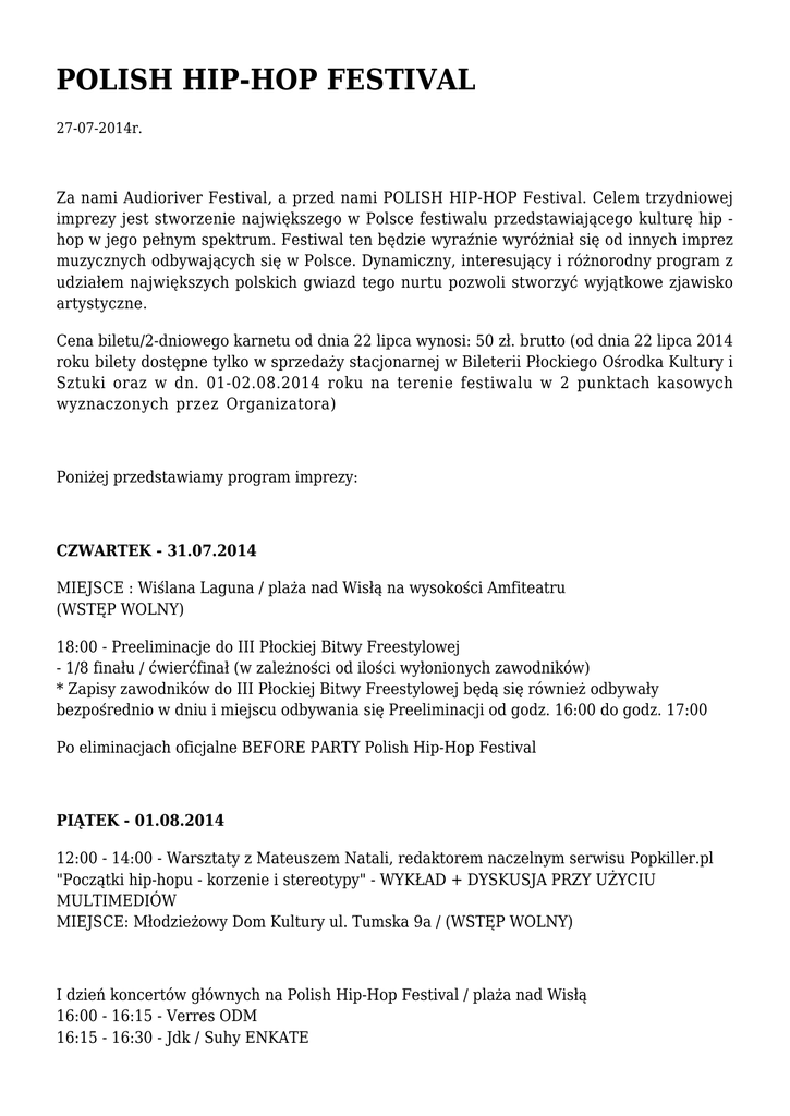 POLISH HIP-HOP FESTIVAL 27-07-2014r. Za nami Audioriver Festival, a przed nami POLISH HIP-HOP Festival. Celem trzydniowej imprezy jest stworzenie największego w Polsce festiwalu przedstawiającego kulturę hip hop w jego pełnym spektrum. Festiwal ten będzie wyraźnie wyróżniał się od innych imprez muzycznych odbywających się w Polsce. Dynamiczny, interesujący i różnorodny program z udziałem największych polskich gwiazd tego nurtu pozwoli stworzyć wyjątkowe zjawisko artystyczne. Cena biletu/2-dniowego karnetu od dnia 22 lipca wynosi: 50 zł. brutto (od dnia 22 lipca 2014 roku bilety dostępne tylko w sprzedaży stacjonarnej w Bileterii Płockiego Ośrodka Kultury i Sztuki oraz w dn. 01-02.08.2014 roku na terenie festiwalu w 2 punktach kasowych wyznaczonych przez Organizatora) Poniżej przedstawiamy program imprezy: CZWARTEK - 31.07.2014 MIEJSCE : Wiślana Laguna / plaża nad Wisłą na wysokości Amfiteatru (WSTĘP WOLNY) 18:00 - Preeliminacje do III Płockiej Bitwy Freestylowej - 1/8 finału / ćwierćfinał (w zależności od ilości wyłonionych zawodników) * Zapisy zawodników do III Płockiej Bitwy Freestylowej będą się również odbywały bezpośrednio w dniu i miejscu odbywania się Preeliminacji od godz. 16:00 do godz. 17:00 Po eliminacjach oficjalne BEFORE PARTY Polish Hip-Hop Festival PIĄTEK - 01.08.2014 12:00 - 14:00 - Warsztaty z Mateuszem Natali, redaktorem naczelnym serwisu Popkiller.pl "Początki hip-hopu - korzenie i stereotypy" - WYKŁAD + DYSKUSJA PRZY UŻYCIU MULTIMEDIÓW MIEJSCE: Młodzieżowy Dom Kultury ul. Tumska 9a / (WSTĘP WOLNY) I dzień koncertów głównych na Polish Hip-Hop Festival / plaża nad Wisłą 16:00 - 16:15 - Verres ODM 16:15 - 16:30 - Jdk / Suhy ENKATE 16:30 - 16:50 - Arow 17:00 - GODZINA W 17:05 - 17:35 - Ńemy 17:40 - 18:10 - Diset 18:15 - 19:00 - Tau 19:05 - 19:50 - Spinache 19:55 - 20:05 - Beat Box - Biciu 20:10 - 20:40 - Półfinał bitwy freestylowej 20:45 - 21:30 – Sitek/ Buszu/ DJ Prox 21:35 - 22:20 - Sobota 22:25 - 23:25 - Rasmentalism 23:30 - 00:25 - Vnm 00:30 - 01:25 - Eldo 01:30 - 02:30 - Tede MIEJSCE : Plaża nad Wisłą ( WSTĘP ZA OKAZANIEM 2-DNIOWEGO KARNETU WYMIENNEGO NA OPASKĘ) SOBOTA - 02.08.2014 11:00 - 13:00 - Warsztaty z Mateuszem Natali, redaktorem naczelnym serwisu Popkiller.pl "Newschool w natarciu – nowa fala w amerykańskim rapie" - WYKŁAD + DYSKUSJA PRZY UŻYCIU MULTIMEDIÓW MIEJSCE: Młodzieżowy Dom Kultury ul. Tumska 9a / (WSTĘP WOLNY) II dzień koncertów głównych na Polish Hip-Hop Festival / plaża nad Wisłą 15:00 - 15:30 - DJ'S SET 15:30 - 15:45 - 2Na 15:45 - 16:05 - Steciu x Van x Veritas 16:05 - 16:25 - Beer Beer 16:30 - 17:00 - Czeski 17:05 - 17:45 – TomB / Blejk 17:50 - 18:30 - Kuba Knap / LJ Karwel 18:35 - 19:05 - Sztigar Bonko 19:10 - 19:50 - Planet ANM / Eljot Sounds 19:50 - 20:00 – Sportowiec SCh 20:00 - 20:30 - Finał bitwy freestylowej 20:35 - 21:30 - Te-Tris/Pogz 21:35 - 22:20 - Quebonafide 22:25 - 23:25 - Ten Typ Mes 23:30 - 00:30 - JWP/BC 00:35 - 01:30 - Molesta Ewenement 01:35 - 02:30 - Kaliber 44 MIEJSCE : Plaża nad Wisłą ( WSTĘP ZA OKAZANIEM 2-DNIOWEGO KARNETU WYMIENNEGO NA OPASKĘ) NIEDZIELA - 03.08.2014 Oficjalne AFTER PARTY Polish Hip-Hop Festival MIEJSCE : Wiślana Laguna / plaża nad Wisłą na wysokości Amfiteatru (WSTĘP WOLNY) Źródło: plhhfestival.pl