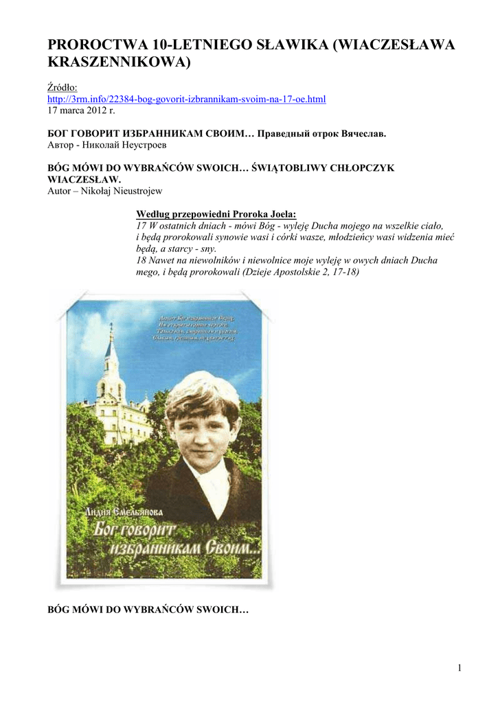 PROROCTWA 10-LETNIEGO SŁAWIKA (WIACZESŁAWA KRASZENNIKOWA) Źródło: http://3rm.info/22384-bog-govorit-izbrannikam-svoim-na-17-oe.html 17 marca 2012 r. БОГ ГОВОРИТ ИЗБРАННИКАМ СВОИМ… Праведный отрок Вячеслав. Автор - Николай Неустроев BÓG MÓWI DO WYBRAŃCÓW SWOICH… ŚWIĄTOBLIWY CHŁOPCZYK WIACZESŁAW. Autor – Nikołaj Nieustrojew Według przepowiedni Proroka Joela: 17 W ostatnich dniach - mówi Bóg - wyleję Ducha mojego na wszelkie ciało, i będą prorokowali synowie wasi i córki wasze, młodzieńcy wasi widzenia mieć będą, a starcy - sny. 18 Nawet na niewolników i niewolnice moje wyleję w owych dniach Ducha mego, i będą prorokowali (Dzieje Apostolskie 2, 17-18) BÓG MÓWI DO WYBRAŃCÓW SWOICH… 1 1. 10-LETNI PROROK SŁAWIK KRASZENNIKOW, FAKTY Z JEGO ŻYCIA I MISJI Sławik Kraszennikow, zwany też Czebarkulskim (od miasta Czebarkul, w którym wzrastał, umarł i jest pochowany), Uralskim lub Syberyjskim, w Polsce jest nieznany. Nie ma o nim filmów, nie przetłumaczono książek z języka rosyjskiego. W Rosji wśród prostego ludu prawosławnego obserwuje się kult tego świątobliwego, 10-letniego proroka. Jego grób w małym mieście na Uralu, Czebarkulu, przykryty szklaną konstrukcją (której szkic narysował on sam w swoim zeszycie na kilka lat przed śmiercią i której zdjęcie zamieszczono poniżej – od tłum.), odwiedzają setki tysięcy wiernych, którzy modląc się za jego pośrednictwem do Pana Boga, szukają tutaj ratunku i pomocy dla swoich chorób i dolegliwości fizycznych i psychicznych. I bardzo często ich błagania są wysłuchane, wyjeżdżają uzdrowieni na ciele i duszy, umocnieni w wierze. Sławik znany jest też w środowiskach prawosławnych za granica, na przykład w Kosowie, gdzie na pamiątkę dnia jego śmierci odprawiane są nabożeństwa, śpiewane akatysty ku jego czci. Stanowisko Rosyjskiej Cerkwi Prawosławnej Natomiast władze Rosyjskiej Cerkwi Prawosławnej nie uznały 10-letniego proroka i na wszelkie sposoby walczą z „jego kultem”. Szef Komisji Synodalnej do Spraw Kanonizacji Metropolita Krutitski i Kołomieński Juwenaliusz uznał za niezgodny z duchem Cerkwi kult „świętego chłopca Sławika” (ros. - "святого отрока Славика" – nazwa „otrok” stosuje się, szczególnie w literaturze religijnej w odniesieniu do chłopców w wieku od 7 do 12 lat - od. tłum.), który rozprzestrzenił się w Czelabińsku, informuje Interfax-Religia. "Z doświadczenia Cerkwi wiemy, jak łatwo podobne błędy kuszą ludzi prostych i naiwnych, i odcinając od Ciała Cerkwi, prowadzą ich do śmierci" - powiedział Władyka. Przypomniał, że Metropolita Czelabińsko – Złatousowski Hiob według wyników badań kwestii czczenia Sławika oświadczył, że jest ono obce „duchowi i nauczaniu Cerkwi Chrystusowej." "Powodem tego jest ogromna żądza popularności, duma i duchowa ślepota tych błądzących zacofanych umysłowo w swoich przesądach „fanatyków świętego chłopca” - powiedział Metropolita Juwenaliusz. Autor atrykułu o Sławiku – Nikołaj Nieustrojew (Kiemierowo, 2010 rok) tak pisze o nieprzychylnym stanowisku Cerkwi: „W sprawie fenomenu chłopczyka Sławika rozmawiałem z pewnym moim znajomym archimandrytą, opinii którego wierzę. Jak wielu innych, on również początkowo z wątpliwościami traktował te wszystkie cuda, ale po przeprowadzonym badaniu, łącznie ze spotkaniami z matką i ludźmi, którzy uzyskali od Sławika pomoc, jego wątpliwości się rozwiały. A kłamstwa, które leja na tego świątobliwego chłopczyka z diecezji – to tylko elementarna zazdrość, że tak wielu przyjeżdżających tutaj ludzi do nich z pieniędzmi nie przychodzi”. Oprócz książki „BÓG MÓWI DO WYBRAŃCÓW SWOICH”…(ros. - „БОГ ГОВОРИТ ИЗБРАННИКАМ СВОИМ”…) , będącej tematem opracowania pt. są jeszcze inne publikacje i filmy 2 video. Wszystko zaczęło się od książki „Ach, mamo, mamuśku… (ros. -«Ах, мама, маменька…») Giennadija Pawłowicza Bystrowa (wydana w latach 2001-2002), napisana ze słów matki Sławika. Sama Walentina Kraszennikowa napisała dwie książki: „Cuda i przepowiednie chłopczyka Sławika” (ros. - «Чудеса и предсказания отрока Славика») i „Posłany przez Boga” (ros. - «Посланный Богом». Lidia Jemieljanowa napisała dwie inne: „Chłopczyk Wiaczesław (ros. - «Отрок Вячеслав») oraz „BÓG MÓWI DO WYBRAŃCÓW SWOICH”… (ros. - „БОГ ГОВОРИТ ИЗБРАННИКАМ СВОИМ”…). W książkach tych podaje się liczne świadectwa o niezwykłych darach i zdolnościach chłopczyka, o jego objawieniach po śmierci i o cudach, które uczynił. W latach 2010 – 2011 zostały wydane na DVD 4-odcinkowe 2 filmy dokumentalne „Rosyjski Anioł. Chłopczyk Wiaczesław (ros. «Русский ангел. Отрок Вячеслав» - reżyser Siergiej Bogdanow). Podczas opracowania korzystano głównie z książek „Bóg mówi do wybrańców swoich” i „Cuda i przepowiednie chłopczyka Sławikia”. Film pierwszy Format DVD, 4 części, 15.65 GB, czas 8 h 18 min. ROSYJSKI ANIOŁ. Chłopczyk Wiaczesław (Siergiej Bogdanow), [2010 r., dokumentalny, DVD5] РУССКИЙ АНГЕЛ. Отрок Вячеслав (Сергей Богданов) [2010 г., документальный, DVD5] РУССКИЙ АНГЕЛ. Отрок Вячеслав (фильм первый): DVD5: http://rutracker.org/forum/viewtopic.php?t=3032911 Film drugi Format DVD, 4 części, 15.67 GB, czas 10 h 32 min. ROSYJSKI ANIOŁ. Chłopczyk Wiaczesław (FILM DRUGI) (Siergiej Bogdanow), [2011 r. dokumentalny, DVD5] РУССКИЙ АНГЕЛ. Отрок Вячеслав (фильм второй) (Сергей Богданов) [2011г., документальный, DVD5] РУССКИЙ 