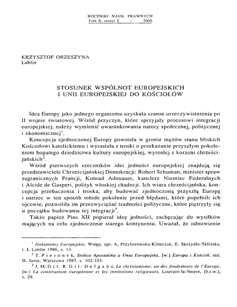 R O C Z N IK I To m X, NAUK PRAWNYCH zeszyt 2______- ______ 2000 KRZYSZTOF ORZESZYNA Lublin S T O S U N E K W S P Ó L N O T E U R O P E JS K IC H I U N II E U R O P E JS K IE J D O K O Ś C IO Ł Ó W Idea Europy jako jednego organizm u uzyskała szanse urzeczyw istnienia po II wojnie światowej. W śród przyczyn, które sprzyjały procesow i integracji europejskiej, należy wym ienić uw arunkow ania natury społecznej, politycznej i e k o n o m icz n ej1. K oncepcja zjednoczonej Europy powstała w gronie m ężó w stanu bliskich Kościołowi katolickiem u i wyrastała z troski o przekazanie przyszłym p o k o le niom bogatego dziedzictwa kultury europejskiej, w yrosłej z korzeni ch rześci jańsk ich 2. Wśród pierw szych rzeczników idei jedności europejskiej znajdują się przedstawiciele Chrześcijańskiej Demokracji: Robert S chum an, m inister spraw zagranicznych Francji, Konrad Adenauer, kanclerz Niem iec Federalnych i Alcide de Gasperi, polityk włoskiej chadecji. Ich w iara chrześcijańska, kon cepcja przebaczenia i troska, aby budować zjedn oczoną przyszłą Europę i ustrzec w ten sposób m łode pokolenie przed błędam i, które popełnili ich ojcowie, pozw oliła im przezw yciężać trudności polityczne, które piętrzyły się . . .. T u początku budow ania tej integracji- . Także papież Pius XII popierał ideę jedn ości, zachęcając do w ysiłków m ających na celu zjednoczenie starego kontynentu. U w ażał, że odnow ienie 1 D okum enty Europejskie, W stęp, opr. A. Przyborow ska-K lim czak, E. Skrzydło-T efelska, t. I, Lublin 1996, s. 13. 2 T. P i e r o n e k, Stolica A postolska a Unia E uropejska, [w:] Europa i K ościół, red. H. Juros, W arszaw a 1997, s. 102-103. 3 J. M. G i 1, R. G i 1 - D e 1 g a d o, Le christianism e, un des fo n d em en ts de l ’E urope, [w:] La construction européenne et les institutions religieuses, Louvain-la-N euve, [b.r.w.], s. 29. chrześcijańskiej tożsam ości E uropy stanowi tytuł pierw szeństwa w odniesieniu do innych kontynentów i p odstaw ę jej szczególnej odpowiedzialności za św iatow y pokój. W ydarzenia w ojenne pozwalały mu sformułować postulat, by Europa zjednoczyła w jakiejś form ie wchodzące w jej skład narody4. W maju 1950 r. Robert S chum an przedstawił projekt pow ołania ponad narodow ego ugrupow ania gospodarczego, które poprzez utworzenie strefy w olnego handlu doprow adziłoby do pow stania wspólnego rynku p od staw o wych surow ców - w ęgla i stali. D zięki temu planowi sześć państw: Belgia, Francja, Holandia, L uksem burg, R FN i W łochy podpisały w dniu 18 IV 1951 r. w Paryżu traktat ustanaw iający E uropejską W spólnotę W ęgla i Stali (EW W iS). Zachęco ne sukcesam i W spó lno ty W ęgla i Stali w dniu 25 III 1957 r. pań stwa tw orzące EW W iS podpisały dwa Traktaty Rzym skie (= TWE): jeden ustanaw iający E u rop ejską W spólnotę Energii Atom owej (EU RA T O M ), drugi E uro pejską W spólnotę G o sp odarczą (EW G) '. W celu pogłębienia integracji ekonom icznej państw i powiązania jej ze zbliżeniem o charakterze politycznym został przyjęty Jednolity Akt Europejski (= JAE), który wszedł w życie 1 VII 1987 r. Jego postanowienia zmieniły niektóre postanow ienia Traktatów W spólnot. Akt zawiera także postanowienia au tonom iczne nie podlegające w łączeniu do Traktatów założycielskich doty czące Europejskiej W spółpracy Politycznej, Rady Europejskiej i Unii E uro pejskiej. K olejny etap w procesie integracji wyznaczył Traktat o Unii Europejskiej (= TU E ) podpisany dnia 7 II 1992 r. w Maastricht. U nia E uropejska po w ołana do życia na mocy tego Traktatu nie zastępuje W sp óln ot Europejskich, które nadal funkcjonują, zachowując sw ą organiza cy jn ą odrębność i m iędzyna rodo w ą podm iotow ość prawną. Unia Europejska nie jest państw em . W yrażany jest pogląd, że Unia nie ma własnej osobowości praw nej, lecz jest o rganizacją m iędzynarodow ą, grupującą oprócz piętnastu państw , trzy W spólnoty E uropejskie, które same nie są członkam i U nii6. B ardziej trafna w ydaje się opinia, że Unia Europejska jest strukturą sui g en eris, od m ien n ą od tradycyjnych organizacji m iędzynarodow ych'. " P i e r o n e k , art. cyt., s. 104. J M. A h 1 t, Praw o europejskie, W arszaw a 19982, s. 1-2. 6 Tam że, s. 4. 7 D okum enty Europejskie, t. I, s. 16. Struktura Unii opiera się na trzech filarach. Pierwszy tw o rz ą trzy W sp ó l noty, drugi wspólna polityka zagraniczna i bezpieczeństw a, a trzeci w sp ó ł praca w zakresie wym iaru sprawiedliw ości i spraw w ew nętrznych. W ejście w życie Traktatu z M aastricht w dniu 1 XI 1993 r. nie zakończyło procesu integracji europejskiej. P rzew idziana w art. N, ust. 2 T U E K o nferen cja przeglądowa Traktatu rozpoczęła się w maju 1996 r. w T u ry n ie 8. W czasie Rady Europejskiej w N oordw ijk w maju 1997 r. zadecydow ano, że Konferencja zakończy się podczas kolejnego szczytu w A m sterdam ie. Tam też prace nad Traktatem uznano za zakończone, ale wobec braku ostatecznego tekstu w dniach 16 i 17 VI 1997 r. przyjęto i parafow ano jed y n ie jeg o p ro pozycję, odkładając ostateczne jego podpisanie na październik tego sam ego roku. Ostateczny tekst Traktatu A m sterdam skiego (= TA) różni się od jego wersji przyjętej przez Radę E uropejską w A m sterdam ie. Prace nad „prawnym zredagow aniem ” tekstu trwały aż do chwili podpisania Traktatu w dniu 2 X 1997 r. w A m sterdam ie9. Zbliżanie Kościołów, w tym Kościoła katolickiego, do Unii Europejskiej było drogą długą. Stolica Apostolska początkow o ograniczała się do akredy towania nuncjusza przy Kom isji Europejskiej w Brukseli. W obec odm iennych i często złożonych interesów Kościołów lokalnych państw członkow skich, zakres funkcji i zadań nuncjusza nie mógł zadowolić Rady K onferencji E pis kopatów Europy (CCEE). Rada ta wyłoniła więc K 