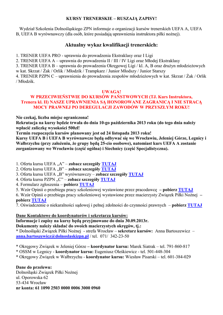 KURSY TRENERSKIE – RUSZAJĄ ZAPISY! Wydział Szkolenia Dolnośląskiego ZPN informuje o organizacji kursów trenerskich UEFA A, UEFA B, UEFA B wyrównawczy (dla osób, które posiadają uprawnienia instruktora piłki nożnej). Aktualny wykaz kwalifikacji trenerskich: 1. TRENER UEFA PRO - uprawnia do prowadzenia Ekstraklasy oraz I Ligi 2. TRENER UEFA A – uprawnia do prowadzenia II / III / IV Ligi oraz Młodej Ekstraklasy 3. TRENER UEFA B – uprawnia do prowadzenia Okręgowej Ligi / kl. A, B oraz drużyn młodzieżowych w kat. Skrzat / Żak / Orlik / Młodzik / Trampkarz / Junior Młodszy / Junior Starszy 4. TRENER PZPN C – uprawnienia do prowadzenia zespołów młodzieżowych w kat. Skrzat / Żak / Orlik / Młodzik. UWAGA! W PRZECIWIEŃSTWIE DO KURSÓW PAŃSTWOWYCH (TJ. Kurs Instruktora, Trenera kl. II) NASZE UPRAWNIENIA SĄ HONOROWANE ZAGRANICĄ I NIE STRACĄ MOCY PRAWNEJ PO DEREGULACJI ZAWODÓW W PRZYSZŁYM ROKU! Nie czekaj, liczba miejsc ograniczona! Rekrutacja na kursy będzie trwała do dnia 10-go października 2013 roku (do tego dnia należy wpłacić zaliczkę wysokości 500zł! Termin rozpoczęcia kursów planowany jest od 24 listopada 2013 roku! Kursy UEFA B i UEFA B wyrównawcze będą odbywać się we Wrocławiu, Jeleniej Górze, Legnicy i Wałbrzychu (przy założeniu, że grupy będą 25-cio osobowe), natomiast kurs UEFA A zostanie zorganizowany we Wrocławiu (część ogólna) i Siechnicy (część Specjalistyczna). 1. Oferta kursu UEFA „A” – zobacz szczegóły TUTAJ 2. Oferta kursu UEFA „B” – zobacz szczegóły TUTAJ 3. Oferta kursu UEFA „B” wyrównawczy – zobacz szczegóły TUTAJ 4. Oferta kursu PZPN „C” – zobacz szczegóły TUTAJ 4. Formularz zgłoszenia – pobierz TUTAJ 5. Wzór Opinii o przebiegu pracy szkoleniowej wystawione przez pracodawcę – pobierz TUTAJ 6. Wzór Opinii o przebiegu pracy szkoleniowej wystawione przez macierzysty Związek Piłki Nożnej – pobierz TUTAJ 7. Oświadczenie o niekaralności sądowej i pełnej zdolności do czynności prawnych – pobierz TUTAJ Dane Kontaktowe do koordynatorów i sekretarza kursów: Informacje i zapisy na kursy będą przyjmowane do dnia 30.09.2013r. Dokumenty należy składać do swoich macierzystych okręgów, tj.: * Dolnośląski Związek Piłki Nożnej - strefa Wrocław – sekretarz kursów: Anna Bartoszewicz – [email protected] / tel. 071/ 342-23-50 * Okręgowy Związek w Jeleniej Górze – koordynator kursu: Marek Siatrak – tel. 791-860-817 * OSSM w Legnicy - koordynator kursu: Eugeniusz Oleśkiewicz - tel. 501-448-304 * Okręgowy Związek w Wałbrzychu - koordynator kursu: Wiesław Pisarski – tel. 601-384-029 Dane do przelewu: Dolnośląski Związek Piłki Nożnej ul. Oporowska 62 53-434 Wrocław nr konta: 61 1090 2503 0000 0006 3000 0960