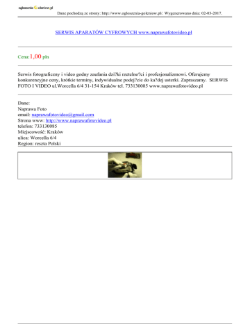 Dane pochodzą ze strony: http://www.ogloszenia-goleniow.pl/. Wygenerowano dnia: 02-03-2017. SERWIS APARATÓW CYFROWYCH www.naprawafotovideo.pl Cena:1,00 pln Serwis fotograficzny i video godny zaufania dzi?ki rzetelno?ci i profesjonalizmowi. Oferujemy konkurencyjne ceny, krótkie terminy, indywidualne podej?cie do ka?dej usterki. Zapraszamy. SERWIS FOTO I VIDEO ul.Worcella 6/4 31-154 Kraków tel. 733130085 www.naprawafotovideo.pl Dane: Naprawa Foto email: [email protected] Strona www: http://www.naprawafotovideo.pl telefon: 733130085 Miejscowość: Kraków ulica: Worcella 6/4 Region: reszta Polski