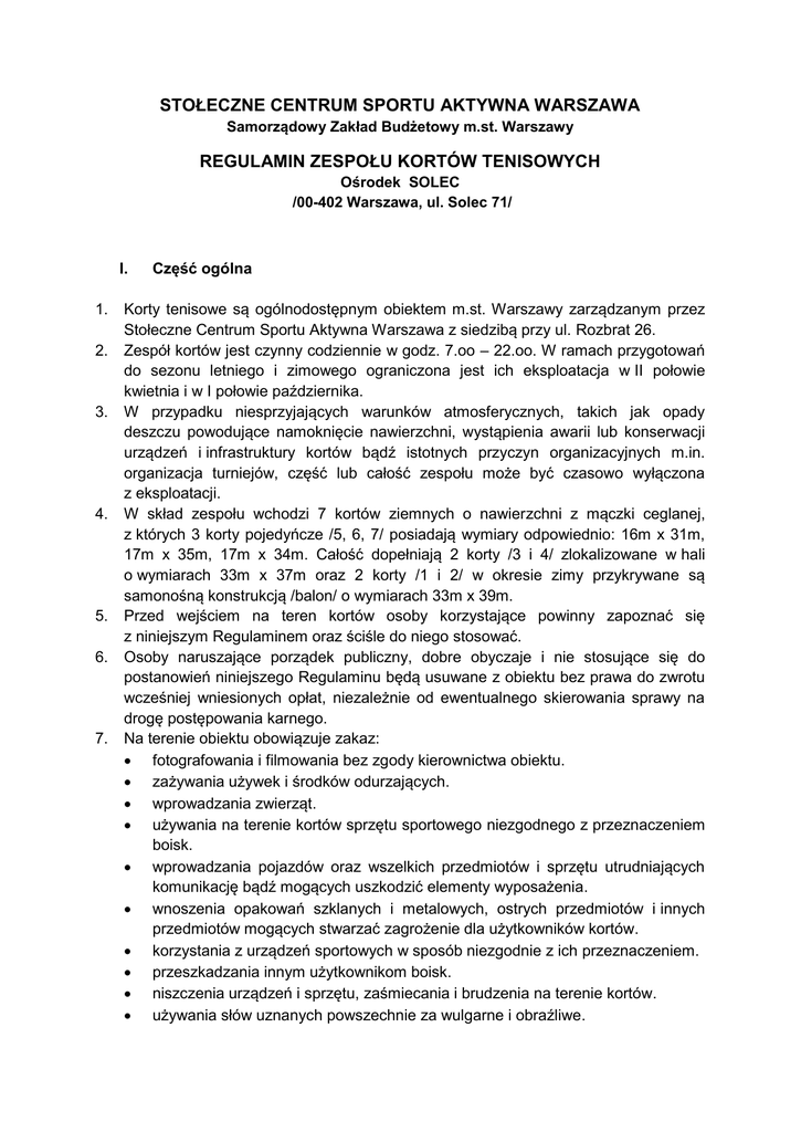 STOŁECZNE CENTRUM SPORTU AKTYWNA WARSZAWA Samorządowy Zakład Budżetowy m.st. Warszawy REGULAMIN ZESPOŁU KORTÓW TENISOWYCH Ośrodek SOLEC /00-402 Warszawa, ul. Solec 71/ I. 1. 2. 3. 4. 5. 6. 7. Część ogólna Korty tenisowe są ogólnodostępnym obiektem m.st. Warszawy zarządzanym przez Stołeczne Centrum Sportu Aktywna Warszawa z siedzibą przy ul. Rozbrat 26. Zespół kortów jest czynny codziennie w godz. 7.oo – 22.oo. W ramach przygotowań do sezonu letniego i zimowego ograniczona jest ich eksploatacja w II połowie kwietnia i w I połowie października. W przypadku niesprzyjających warunków atmosferycznych, takich jak opady deszczu powodujące namoknięcie nawierzchni, wystąpienia awarii lub konserwacji urządzeń i infrastruktury kortów bądź istotnych przyczyn organizacyjnych m.in. organizacja turniejów, część lub całość zespołu może być czasowo wyłączona z eksploatacji. W skład zespołu wchodzi 7 kortów ziemnych o nawierzchni z mączki ceglanej, z których 3 korty pojedyńcze /5, 6, 7/ posiadają wymiary odpowiednio: 16m x 31m, 17m x 35m, 17m x 34m. Całość dopełniają 2 korty /3 i 4/ zlokalizowane w hali o wymiarach 33m x 37m oraz 2 korty /1 i 2/ w okresie zimy przykrywane są samonośną konstrukcją /balon/ o wymiarach 33m x 39m. Przed wejściem na teren kortów osoby korzystające powinny zapoznać się z niniejszym Regulaminem oraz ściśle do niego stosować. Osoby naruszające porządek publiczny, dobre obyczaje i nie stosujące się do postanowień niniejszego Regulaminu będą usuwane z obiektu bez prawa do zwrotu wcześniej wniesionych opłat, niezależnie od ewentualnego skierowania sprawy na drogę postępowania karnego. Na terenie obiektu obowiązuje zakaz: fotografowania i filmowania bez zgody kierownictwa obiektu. zażywania używek i środków odurzających. wprowadzania zwierząt. używania na terenie kortów sprzętu sportowego niezgodnego z przeznaczeniem boisk. wprowadzania pojazdów oraz wszelkich przedmiotów i sprzętu utrudniających komunikację bądź mogących uszkodzić elementy wyposażenia. wnoszenia opakowań szklanych i metalowych, ostrych przedmiotów i innych przedmiotów mogących stwarzać zagrożenie dla użytkowników kortów. korzystania z urządzeń sportowych w sposób niezgodnie z ich przeznaczeniem. przeszkadzania innym użytkownikom boisk. niszczenia urządzeń i sprzętu, zaśmiecania i brudzenia na terenie kortów. używania słów uznanych powszechnie za wulgarne i obraźliwe. 8. stwarzania wszelkich sytuacji niebezpiecznych dla zdrowia i życia osób korzystających z kompleksu. Wejście na teren boiska wielofunkcyjnego lub korzystanie z jego urządzeń jest równoznaczne z akceptacją zapisów niniejszego Regulaminu. II. Odpłatność za korzystanie z kortów Opłata za korzystanie z kortu pobierana jest z góry za 55 minut zajęć według obowiązującego cennika; wejście na kort - nie wcześniej niż na 5 minut przed planowaną rezerwacją. 10. Kontroli czasu korzystania dokonuje odpowiedzialny pracownik Ośrodka. 11. Czas pobytu na korcie mierzony jest od momentu wejścia do momentu zejścia z kortu i obejmuje uporządkowanie kortu poprzez zasiatkowanie nawierzchni. Za pobyt krótszy opłata nie jest zwracana. 9. III. Rezerwacje kortów 12. Rezerwacji kortów można dokonać od poniedziałku do piątku w godz. 7.oo-22.oo. a w niedzielę w godz. 9.oo-21.oo. osobiście na terenie obiektu w recepcji lub telefonicznie pod numerem 22 621 68 63. 13. Rezerwacji stałej można dokonać po wniesieniu opłaty za minimum miesięczny okres korzystania z kortu. Rezerwacje pojedyncze przyjmowane są na dzień następny i kolejny. 14. W przypadku rezerwacji nieuregulowanej, opłatę należy wnieść najpóźniej przed wejściem na kort. 15. Rezerwacja wygasa w przypadku niewykorzystania kortu powyżej 10 min. od pierwotnego terminu rozpoczęcia rezerwacji. 16. Opłata wniesiona za rezerwację niewykorzystaną, nieodwołaną lub odwołaną nieskutecznie - min. 24 godz., nie jest zwracana. IV. Zasady korzystania z kortów 17. Korzystać z kortów mogą osoby: które opłaciły bilet wstępu na kort, w wieku poniżej 18 lat wyłącznie pod opieką dorosłych. 18. Osoby korzystające z kortu winny posiadać przy sobie ważny bilet wstępu i okazywać go do kontroli. 19. Zakaz korzystania z kortów mają osoby: będące pod wpływem alkoholu lub środków odurzających. zachowujące się w sposób zagrażający innym osobom. z przeciwskazaniami medycznymi do uprawiania gry w tenisa. nieprzestrzegające niniejszego Regulaminu. 20. Z obiektu należy korzystać w stroju sportowym i obuwiu przystosowanym do gry w tenisa ziemnego na płaskiej podeszwie bez ostrych krawędzi. 21. Organizowanie i prowadzenie zajęć tenisowych oraz zawodów przez osoby fizyczne i prawne wymaga zawarcia z SCS Aktywna Warszawa odrębnej umowy na prowadzenie takiej działalności. Do prowadzenia indywidualnej, zarobkowej nauki i doskonalenia gry w tenisa niezbędne jest posiadanie Karty Trenerskiej. Prowadzenie działalności na jej podstawie wymaga spełnienia określonych warunków i wniesienia dodatkowej opłaty. 22. Korzystanie z koszyków na piłki tenisowe oraz innych pojemników służących do przechowywania piłek tenisowych mogących pomieścić więcej niż 8 piłek tenisowych dozwolone jest jedynie w przypadku prowadzenia zajęć lub zawodów przez osoby fizyczne i prawne posiadające Kartę Trenerską. 23. Za stan zdrowia i bezpieczeństwo osób uczestniczących w zajęciach zorganizowanych odpowiada organizator lub instruktor. 24. Osoby korzystające z kortu robią to na własną odpowiedzialność i ponoszą ryzyko związane z amatorskim uprawianiem sportu. W przypadku osób poniżej 18 lat odpowiedzialność taką ponoszą rodzice lub opiekunowie prawni. 25. Zaleca się szczególną ostrożność osobom noszącym okulary korekcyjne i szkła kontaktowe. Korzystanie z nich w czasie gry odbywa się na ryzyko i odpowiedzialność 
