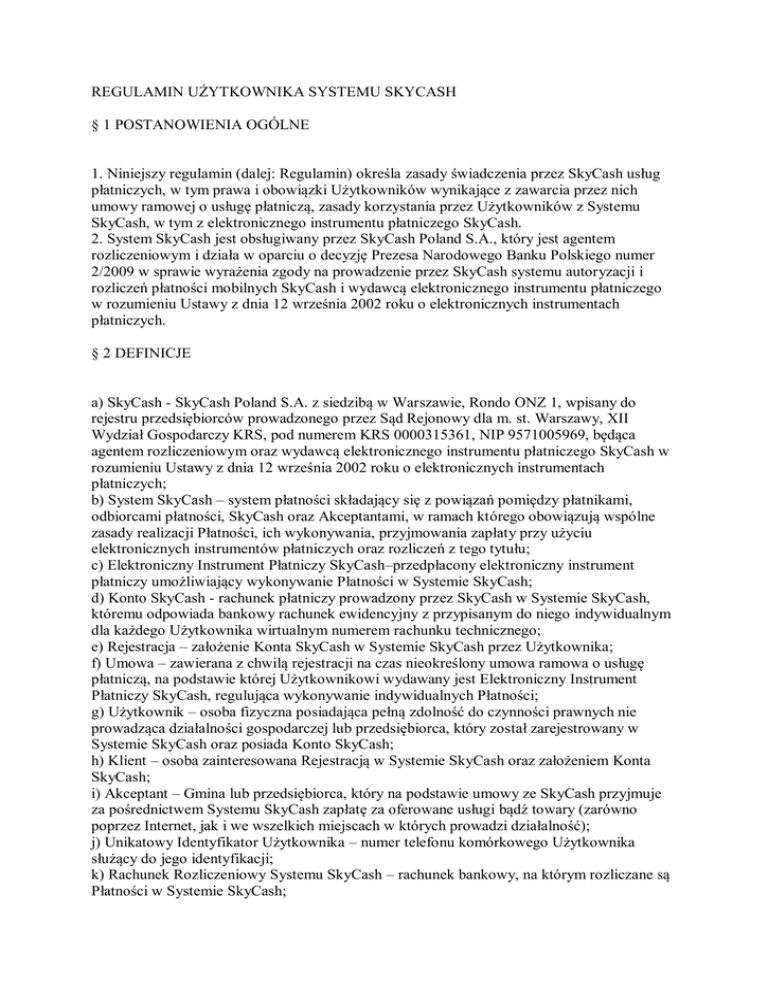 REGULAMIN UŻYTKOWNIKA SYSTEMU SKYCASH § 1 POSTANOWIENIA OGÓLNE 1. Niniejszy regulamin (dalej: Regulamin) określa zasady świadczenia przez SkyCash usług płatniczych, w tym prawa i obowiązki Użytkowników wynikające z zawarcia przez nich umowy ramowej o usługę płatniczą, zasady korzystania przez Użytkowników z Systemu SkyCash, w tym z elektronicznego instrumentu płatniczego SkyCash. 2. System SkyCash jest obsługiwany przez SkyCash Poland S.A., który jest agentem rozliczeniowym i działa w oparciu o decyzję Prezesa Narodowego Banku Polskiego numer 2/2009 w sprawie wyrażenia zgody na prowadzenie przez SkyCash systemu autoryzacji i rozliczeń płatności mobilnych SkyCash i wydawcą elektronicznego instrumentu płatniczego w rozumieniu Ustawy z dnia 12 września 2002 roku o elektronicznych instrumentach płatniczych. § 2 DEFINICJE a) SkyCash - SkyCash Poland S.A. z siedzibą w Warszawie, Rondo ONZ 1, wpisany do rejestru przedsiębiorców prowadzonego przez Sąd Rejonowy dla m. st. Warszawy, XII Wydział Gospodarczy KRS, pod numerem KRS 0000315361, NIP 9571005969, będąca agentem rozliczeniowym oraz wydawcą elektronicznego instrumentu płatniczego SkyCash w rozumieniu Ustawy z dnia 12 września 2002 roku o elektronicznych instrumentach płatniczych; b) System SkyCash – system płatności składający się z powiązań pomiędzy płatnikami, odbiorcami płatności, SkyCash oraz Akceptantami, w ramach którego obowiązują wspólne zasady realizacji Płatności, ich wykonywania, przyjmowania zapłaty przy użyciu elektronicznych instrumentów płatniczych oraz rozliczeń z tego tytułu; c) Elektroniczny Instrument Płatniczy SkyCash–przedpłacony elektroniczny instrument płatniczy umożliwiający wykonywanie Płatności w Systemie SkyCash; d) Konto SkyCash - rachunek płatniczy prowadzony przez SkyCash w Systemie SkyCash, któremu odpowiada bankowy rachunek ewidencyjny z przypisanym do niego indywidualnym dla każdego Użytkownika wirtualnym numerem rachunku technicznego; e) Rejestracja – założenie Konta SkyCash w Systemie SkyCash przez Użytkownika; f) Umowa – zawierana z chwilą rejestracji na czas nieokreślony umowa ramowa o usługę płatniczą, na podstawie której Użytkownikowi wydawany jest Elektroniczny Instrument Płatniczy SkyCash, regulująca wykonywanie indywidualnych Płatności; g) Użytkownik – osoba fizyczna posiadająca pełną zdolność do czynności prawnych nie prowadząca działalności gospodarczej lub przedsiębiorca, który został zarejestrowany w Systemie SkyCash oraz posiada Konto SkyCash; h) Klient – osoba zainteresowana Rejestracją w Systemie SkyCash oraz założeniem Konta SkyCash; i) Akceptant – Gmina lub przedsiębiorca, który na podstawie umowy ze SkyCash przyjmuje za pośrednictwem Systemu SkyCash zapłatę za oferowane usługi bądź towary (zarówno poprzez Internet, jak i we wszelkich miejscach w których prowadzi działalność); j) Unikatowy Identyfikator Użytkownika – numer telefonu komórkowego Użytkownika służący do jego identyfikacji; k) Rachunek Rozliczeniowy Systemu SkyCash – rachunek bankowy, na którym rozliczane są Płatności w Systemie SkyCash; l) Bank Rozliczeniowy – bank, który prowadzi Rachunek Rozliczeniowy Systemu SkyCash; m) Rachunek Bankowy Użytkownika – rachunek bankowy niepowiązany z Rachunkiem Rozliczeniowym Systemu SkyCash, który służy do przekazywania środków pieniężnych do systemu SkyCash i na który Użytkownik może przekazywać środki z Systemu SkyCash; n) Autoryzacja – zgoda Użytkownika na wykonanie Płatności; o) PIN - czterocyfrowy kod służący do potwierdzenia Zlecenia Płatniczego w systemie SkyCash; p) Zlecenie Płatnicze – skierowane do SkyCash oświadczenie Użytkownika zawierające polecenie wykonania Płatności; q) Płatność – transfer środków pieniężnych dokonywany za pośrednictwem Systemu SkyCash; r) SkyCash Mobile - aplikacja na telefon komórkowy darmowo dostarczana Użytkownikom przez SkyCash, wcelu korzystania z aplikacji Klient powinien posiadać telefon komórkowy spełniający parametry techniczne udostępnione na stronie internetowej SkyCash; s) SkyCash Web - wersja Systemu SkyCash dostępna poprzez Internet, wcelu korzystania zeSkyCash WebKlient powinien zapewnić we własnym zakresie: hardware, połączenie z siecią Internet i przeglądarkę internetową; t) BOK SkyCash - Biuro Obsługi Klienta SkyCash, callcenter prowadzone przez SkyCash; u) Konsultant - pracownik BOK SkyCash; v) Formatka Reklamacyjna - elektroniczny formularz widoczny w SkyCash Web, służący do zgłaszania reklamacji przez Użytkowników, który zawiera zestaw informacji niezbędnych do prawidłowej obsługi reklamacji; w) Tabela Opłat i Prowizji -stanowiąca załącznik do Regulaminu Tabela, obejmująca zestawienie wszystkich opłat i prowizji pobieranych w ramach systemu SkyCash.Tabela Opłat i Prowizji zawiera również zestawienie usług, które są darmowe w ramach Systemu SkyCash; x) Premium SMS - płatny SMS, pozwalający na zasilenie Konta SkyCash; y) Zamknięcie Konta SkyCash – czynność techniczna polegająca na zakończeniu prowadzenia Konta SkyCash Użytkownika dokonywana przez SkyCash po wygaśnięciu Umowy i wycofaniu przez Użytkownika wszystkich środków zgromadzonych uprzednio na tym Koncie. § 3 REJESTRACJA 1. W celu dokonania Rejestracji Klient podaje zaszyfrowanym kanałem internetowym udostępnionym przez SkyCash (SkyCash Mobile, SkyCash Web) następujące dane: a. nazwę Użytkownika; b. numer telefonu komórkowego Użytkownika; c. adres e-mail Użytkownika (nie może to być adres skrzynki, do której dostęp z poziomu telefonu jest niezabezpieczony). 2. Zabronione jest wykorzystywanie w nazwie Użytkownika nazw lub nazwisk innych osób oraz słów powszechnie uznawanych za obelżywe. 3. W przypadku utraty PIN-u na podany w trakcie Rejestracji adres e-mail wysłane zostanie przypomnienie. SkyCash nie odpowiada za utratę 
