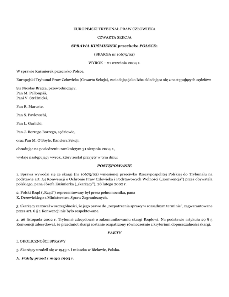 EUROPEJSKI TRYBUNAŁ PRAW CZŁOWIEKA CZWARTA SEKCJA SPRAWA KUŚMIEREK przeciwko POLSCE1 (SKARGA nr 10675/02) WYROK – 21 września 2004 r. W sprawie Kuśmierek przeciwko Polsce, Europejski Trybunał Praw Człowieka (Czwarta Sekcja), zasiadając jako Izba składająca się z następujących sędziów: Sir Nicolas Bratza, przewodniczący, Pan M. Pellonpää, Pani V. Strážnická, Pan R. Maruste, Pan S. Pavlovschi, Pan L. Garlicki, Pan J. Borrego Borrego, sędziowie, oraz Pan M. O’Boyle, Kanclerz Sekcji, obradując na posiedzeniu zamkniętym 31 sierpnia 2004 r., wydaje następujący wyrok, który został przyjęty w tym dniu: POSTĘPOWANIE 1. Sprawa wywodzi się ze skargi (nr 10675/02) wniesionej przeciwko Rzeczypospolitej Polskiej do Trybunału na podstawie art. 34 Konwencji o Ochronie Praw Człowieka i Podstawowych Wolności („Konwencja”) przez obywatela polskiego, pana Józefa Kuśmierka („skarżący"), 28 lutego 2002 r. 2. Polski Rząd („Rząd”) reprezentowany był przez pełnomocnika, pana K. Drzewickiego z Ministerstwa Spraw Zagranicznych. 3. Skarżący zarzucał w szczególności, że jego prawo do „rozpatrzenia sprawy w rozsądnym terminie”, zagwarantowane przez art. 6 § 1 Konwencji nie było respektowane. 4. 26 listopada 2002 r. Trybunał zdecydował o zakomunikowaniu skargi Rządowi. Na podstawie artykułu 29 § 3 Konwencji zdecydował, że przedmiot skargi zostanie rozpatrzony równocześnie z kryterium dopuszczalności skargi. FAKTY I. OKOLICZNOŚCI SPRAWY 5. Skarżący urodził się w 1943 r. i mieszka w Bielawie, Polska. A. Fakty przed 1 maja 1993 r. 6. Pomiędzy 18 i 21 lutego 1992 r. „Ekspres Sudecki”, lokalna gazeta, opublikowała listy pewnych M. W. i A. P. Autorzy oskarżyli skarżącego, w tym czasie wiceburmistrza Bielawy, o oszustwo i nazwali go „kłamcą”. 7. 6 marca 1992 r. skarżący wniósł do Sądu Rejonowego w Dzierżoniowie oskarżenie prywatne, zarzucając M. W. i A. P. zniesławienie. 8. Proces rozpoczął się 18 maja 1992 r. Sąd odroczył rozprawę z powodu nieobecności jednego z oskarżonych. 9. Dalsze rozprawy zostały wyznaczone na 8 i 30 czerwca, 20 lipca, 20 sierpnia i 22 września 1992 r., 11 lutego i 28 kwietnia 1993 r., ale większość z nich była odraczana z powodu nieobecności stron lub ich prawników. B. Fakty po 1 maja 1993 r. 10. 20 maja 1993 r. sąd odroczył rozprawę, ponieważ nie stawili się oskarżeni. 11.Kolejna rozprawa, wyznaczona na 24 czerwca 1993 r., nie odbyła się z powodu nieobecności ławnika. 12. Dalsze rozprawy, wyznaczone na 8 lipca 1993 r., 25 marca 1994 r., 31 maja i 14 czerwca 1995 r., zostały odroczone z powodu nieobecności oskarżonych, ich obrońcy, świadka i skarżącego. Sąd postanowił nałożyć karę pieniężną na jednego za świadków, który się nie stawił. 13.Na rozprawie 29 czerwca 1995 r. obrońca oskarżonych poinformował sąd, że nie będzie ich już reprezentować. 14. 20 lipca 1995 r. odroczono rozprawę z powodu nieobecności oskarżonych. Sąd zarządził nadzór policyjny wobec obu pozwanych w celu zapewnienia właściwego toku postępowania. 15. 18 października 1995 r. sąd zniósł nadzór policyjny w odniesieniu do M. W. 16. Rozprawa wyznaczona na 1 marca 1996 r. została odroczona, ponieważ oskarżeni i świadek nie stawili się przed sądem. Sąd wydał postanowienie o tymczasowym aresztowaniu A. P. w celu zapewnienia jego obecności na rozprawach. 17. Rozprawa wyznaczona na 29 marca 1996 r. została odroczona, ponieważ nie stawili się M. W., świadek i skarżący. 18. 4 kwietnia 1996 r. M. W. wniósł o wyłączenie z postępowania wszystkich sędziów Sądu Rejonowego w Dzierżoniowie. Wniosek ten został oddalony, jako bezzasadny, przez Sąd Wojewódzki w Wałbrzychu 24 maja 1996 r. 19. Na rozprawie 5 kwietnia 1996 r. Sąd Rejonowy w Dzierżoniowie postanowił przeprowadzić postępowanie dowodowe na nowo z powodu zmiany składu orzekającego. Uchylił także areszt w stosunku do A. P. i postanowił o objęciu go nadzorem policyjnym. 20.Rozprawy wyznaczone na 26 września i 10 października 1996 r. zostały odroczone z powodu nieobecności M. W. i jego obrońcy. 21.24 października 1996 r. odbyła się rozprawa przed sądem. 22.Kolejna rozprawa wyznaczona na 7 listopada 1996 r. została odroczona z powodu nieobecności A. P. Sąd zarządził doprowadzenie go przez policję na następną rozprawę. 23. Na rozprawie 15 listopada 1996 r. obrońca M. W. zwrócił się do sądu o czas na zapoznanie się z dokumentacją sprawy i o odroczenie rozprawy. 24. Następnie postępowanie zostało zawieszone z powodu choroby pełnomocnika skarżącego. 25. Rozprawa wyznaczona na 29 stycznia 1998 r. została odroczona z powodu nieobecności M. W., jego obrońcy i świadka. 26.Sąd podjął postępowanie na rozprawie 19 lutego 1998 r. Nałożył też karę pieniężną na jednego ze świadków, który się nie stawił. 27. 6 marca 1998 r. sąd stwierdził, iż postępowanie M. W. czyni niemożliwym rozpatrzenie sprawy i postanowił rozszerzyć postawione mu zarzuty. Tego samego dnia obrońca M. W. odmówił dalszego reprezentowania go. 28.Rozprawa wyznaczona na 19 marca 1998 r. została odroczona z powodu nieobecności świadka. 29.Rozprawa wyznaczona na 9 kwietnia 1998 r. została odwołana z powodu nieobecności sędziego. 30. 23 kwietnia 1998 r. Sąd Rejonowy w Dzierżoniowie uznał M. W. winnym zarzucanych mu czynów i nakazał mu opublikowanie oficjalnych przeprosin dla skarżącego w lokalnej gazecie. Warunkowo umorzył postępowanie wobec A. P. 31.Obaj oskarżeni wnieśli apelację od tego wyroku. 32.27 października 1998 r. Sąd Wojewódzki w Wałbrzychu uchylił wyrok pierwszej instancji i przekazał sprawę do ponownego rozpatrzenia. 33.3 marca 1999 r. Sąd Rejonowy w Dzierżoniowie umorzył postępowanie przeciwko obu pozwanym, ponieważ nastąpiło przedawnienie karalności. 34.9 marca 1999 r. skarżący wniósł zażalenie na to postanowienie. 35. Spr