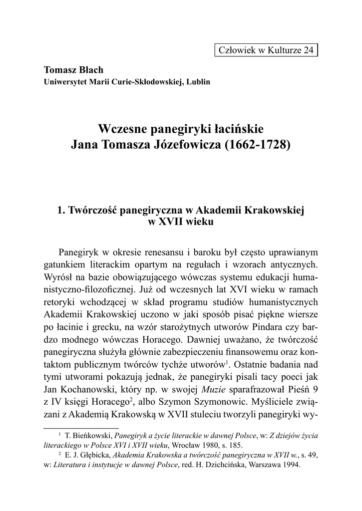 Człowiek w Kulturze 24 Tomasz Błach Uniwersytet Marii Curie-Skłodowskiej, Lublin Wczesne panegiryki łacińskie Jana Tomasza Józefowicza (1662-1728) 1. Twórczość panegiryczna w Akademii Krakowskiej w XVII wieku Panegiryk w okresie renesansu i baroku był często uprawianym gatunkiem literackim opartym na regułach i wzorach antycznych. Wyrósł na bazie obowiązującego wówczas systemu edukacji humanistyczno-filozoficznej. Już od wczesnych lat XVI wieku w ramach retoryki wchodzącej w skład programu studiów humanistycznych Akademii Krakowskiej uczono w jaki sposób pisać piękne wiersze po łacinie i grecku, na wzór starożytnych utworów Pindara czy bardzo modnego wówczas Horacego. Dawniej uważano, że twórczość panegiryczna służyła głównie zabezpieczeniu finansowemu oraz kontaktom publicznym twórców tychże utworów1. Ostatnie badania nad tymi utworami pokazują jednak, że panegiryki pisali tacy poeci jak Jan Kochanowski, który np. w swojej Muzie sparafrazował Pieśń 9 z IV księgi Horacego2, albo Szymon Szymonowic. Myśliciele związani z Akademią Krakowską w XVII stuleciu tworzyli panegiryki wy T. Bieńkowski, Panegiryk a życie literackie w dawnej Polsce, w: Z dziejów życia literackiego w Polsce XVI i XVII wieku, Wrocław 1980, s. 185. 2 E. J. Głębicka, Akademia Krakowska a twórczość panegiryczna w XVII w., s. 49, w: Literatura i instytucje w dawnej Polsce, red. H. Dzichcińska, Warszawa 1994. 1 412 Tomasz Błach sławiające przede wszystkim wiedzę, którą uosabiała sama krakowska Alma Mater jako Pallas Atena. Poza Janem Tomaszem Józefowiczem sławnymi w XVII wieku akademickimi panegirystami byli: Wawrzyniec Śmieszkowic, Tomasz Canevesi czy Jan Rachtamowicz-Cynerski, będący nauczycielem ojca przyszłego króla Polski Jana III Sobieskiego, Jakuba. Panegiryki krakowskie dzielą się na dwie grupy. Pierwsza to dzieła odnoszące się do ważnych uroczystości państwowych, takich jak wielkie zwycięstwa królów czy hetmanów, bądź wydarzeń dotyczących konkretnych uroczystości religijnych, np. przeniesienia relikwii, ślubów zakonnych. Drugą grupę panegiryków tworzą te, które wychwalają znamienite uroczystości odbywające się w Uniwersytecie Krakowskim. Panegiryki Jana Tomasza Józefowicza wpisują się w tę pierwszą grupę. Za przykład może tu posłużyć Panegirycus nomini et Honori […] Constantini Josephi Zielinski […], który to utwór dotyczy lwowskiego ingresu arcybiskupa Konstantego Zielińskiego, mającego miejsce w 1700 roku. Wiele swoich panegiryków kanonik lwowski poświęcił życiu zakonników i błogosławionych, którzy byli blisko związani z ukochanym przez autora Lwowem, np. o św. Janie z Dukli. Gatunek literacki jakim był panegiryk miał zatem swoich kontynuatorów pomimo, iż w XVII wieku znaczenie Akademii Krakowskiej zmalało w związku z wieloma podróżami poznawczo-edukacyjnymi młodzieży magnackiej na południe i zachód Europy. Rodziny magnackie wolały kontynuować edukację w uniwersytetach włoskich, bądź niemieckich, gdzie powoli pod wpływem nauk matematyczno-przyrodniczych odchodzono od scholastyki. Należy również pamiętać o skali zniszczeń jakie dotknęły Kraków, w tym także Uniwersytet Krakowski, w czasie „potopu” szwedzkiego, gdy okupanci na czele z generał-majorem Paulem Wirtzem obciążali uczelnię znacznymi sumami, mającymi utrzymywać szwedzką załogę miasta. W ciągu XVII stulecia kolejni królowie Polski nie wspierali finansowo w sposób szczególny krakowskiej Alma Mater. Dodatkowym czynnikiem, który powodował niechęć do studiowania w Uniwersytecie Krakowskim, zwłaszcza wśród młodzieży różnowierczej, byli pozostający w więk- Wczesne panegiryki łacińskie Jana Tomasza Józefowicza 413 szości katoliccy wykładowcy nauczający w duchu Soboru Trydenckiego. 2. Społeczna działalność Jana Tomasza Józefowicza W niniejszym artykule omówiona zostanie problematyka wczesnych panegiryków Jana Tomasza Józefowicza, lwowianina związanego z Akademią Krakowską. Wybrane utwory obrazują charakterystyczne dla jego twórczości elementy filozofii i teologii. Omówione panegiryki z okresu, gdy był on profesorem filozofii w latach 16841693 w krakowskiej Alma Mater są najbardziej reprezentatywne dla lwowskiego historyka i kronikarza. W następnych bowiem latach, będąc kanonikiem kapituły lwowskiej, swoją twórczość pisarską Józefowicz koncentrował już na pisaniu Roczników miasta Lwowa tomy dodatkowe […]3 – dzieła dotyczącego historii arcybiskupstwa lwowskiego i miasta Lwowa. Panegiryki zaś napisane w latach dziewięćdziesiątych XVII wieku oraz w pierwszym dziesięcioleciu XVIII wieku odnoszą się do bieżących spraw kapituły lwowskiej, np. wyboru Konstantego Józefa Zielińskiego na stanowisko arcybiskupa, bądź poświęcone są osobom z kręgu lwowskiego życia monastycznego. Przyjrzyjmy się sylwetce Jana Tomasza Józefowicza. Pochodził on ze znanej we Lwowie w XVII wieku rodziny ormiańskiej, która zajmowała się działalnością kupiecką. Dziadek Jana Tomasza – Mikołaj Józefowicz był znanym lwowskim aptekarzem. W czasie, gdy Lwów w 1648 roku oblegany był przez armię kozacko-tatarską Chmielnickiego pomagał on obsługiwać artylerię forteczną4. Ojciec Jana Tomasza Józefowicza – Stanisław, będąc mieszczaninem lwowskim prowadził działalność kredytową na dużą skalę, co przyczyniło się m.in. do zakupu przez niego kamienicy przy rynku głównym we J.T. Józefowicz, Annalium urbis Leopolienis tomus extravagans […], rkps Zakł. Nar. im. Ossolińskich, 147/III, 1769. 4 A. Keckowa, Józefowicz Stanisław, w: „Polski Słownik Biograficzny”, t. 11, 1964-1965, s. 306. 3 414 Tomasz Błach Lwowie. Pozycja, jaką zajmował Stanisław Józefowicz pozwoliła mu poślubić w 1652 roku wnuczkę Urbana Della Rippa, Teresę Della Rippa Ubaldynównę. Z okazji ich małżeństwa Jan Rorajski napisał panegiry