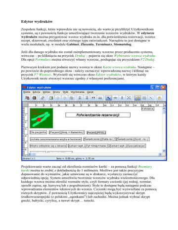Edytor wydruków Zespołem funkcji, które wprawdzie nie są nowością, ale warto je przybliŜyć UŜytkownikom systemu, są z pewnością funkcje umoŜliwiające tworzenie wzorców wydruków. W edytorze wydruków moŜna przygotować wzorce wydruku m.in. dla potwierdzenia rezerwacji, wzorce recept, skierowań, zwolnień oraz róŜnego typu zaświadczeń. Narzędzie to jest dostępne w wielu modułach, np. w module Gabinet, Zlecenia, Terminarz, Stomatolog. Jeśli dla danego wydruku nie został zaimplementowany wzorzec przez producenta systemu, wówczas – po kliknięciu na przycisk Drukuj – pojawia się okno Wybieranie wzorca wydruku. Dla opcji Formularz moŜna stworzyć własny wzorzec, posługując się przyciskiem F2 Dodaj. Pierwszym krokiem jest podanie nazwy wzorca w oknie Karta wzorca wydruku. Następnie – po powrocie do poprzedniego okna - naleŜy zaznaczyć wprowadzoną nazwę i kliknąć na przycisk F7 Wzorzec. Wyświetli się wówczas okno Edytor wydruków, w którym kaŜdy UŜytkownik moŜe stworzyć wzorzec zgodny z własnymi preferencjami. Projektowanie warto zacząć od określenia rozmiarów kartki – za pomocą funkcji Rozmiary kartki moŜna to zrobić z dokładnością do 1 milimetra. MoŜliwe jest takŜe precyzyjne dopasowanie do wymiarów, jakie ustawione są w drukarce, wystarczy zaznaczyć odpowiednią opcję. System umoŜliwia tworzenie wzorców wydruku wielostronicowego. Dla kaŜdego wzorca moŜna określić rozmaite style, czyli formaty czcionki (jej rodzaj, rozmiar, sposób zapisu, np. kursywą lub z pogrubieniem). Style te dostępne będą następnie podczas wprowadzania elementów tekstowych do wzorca. Czcionki mogą być wyświetlane za pomocą róŜnych skryptów. Z pewnością UŜytkownicy najczęściej będą wykorzystywać skrypt środkowoeuropejski (z polskimi „ogonkami”) lub zachodni. MoŜna jednak wybrać skrypt grecki, bałtycki, cyrylicę, a nawet skrypt… turecki. UŜytkownik moŜe wprowadzić szereg rozmaitych elementów, zarówno tekstowych (tekst stały, zmienny), graficznych (bitmapy, linie, ramki), jak i w postaci kodów kreskowych. Wprowadzenie zmiennej sprawia, Ŝe wydruk kaŜdorazowo zostanie uzupełniony aktualnymi danymi. Funkcja wstawiająca bitmapy pozwala umieścić na wydruku na przykład logo placówki słuŜby zdrowia. Rodzaje zmiennych zaleŜne są od typu tworzonego wzorca. Mogą one na przykład określać: • gabinet kierujący, • gabinet wykonujący, • lekarza kierującego, • lekarza prowadzącego, • lekarza wykonującego, • pacjenta, • podmiot kierujący, • podmiot wykonujący, • poradnię kierującą, • poradnię wykonującą, • świadczenie, • usługę, • usługę refundowaną, • zlecenia wykonywane w ramach umów specjalnych. Wprowadzenie zmiennej sprawia, Ŝe wydruk kaŜdorazowo zostanie uzupełniony aktualnymi danymi. Funkcja wstawiająca bitmapy pozwala umieścić na wydruku na przykład logo placówki słuŜby zdrowia. W przypadku projektowania wzorca wydruku recepty UŜytkownik ma moŜliwość wstawienia w formie kodu paskowego informacji o numerze PESEL pacjenta, numerze recepty oraz wszystkich danych świadczeniodawcy, jakie wymagane są na mocy rozporządzenia Ministra Zdrowia w sprawie recept lekarskich z dnia 17 maja 2007 roku. Narzędzie zaopatrzone zostało równieŜ w tradycyjne funkcje edytorskie, znane chociaŜby z programu MS Word. Zaimplementowano w nim ponadto funkcje pozwalające na dokładne umieszczanie elementów na wzorcu: linijkę, siatkę oraz funkcje pozwalające na automatyczne wyrównanie elementów do wskazanej strony wydruku. W efekcie moŜna uzyskać na przykład taki wydruk wręczany pacjentowi jako poświadczenie zarezerwowania wizyty: Gotowy wzorzec moŜna wyeksportować do pliku. Zamiast projektowania w edytorze, moŜliwe jest zaimportowanie do niego dowolnego wzorca wydruku pod warunkiem jednak, Ŝe będzie miał on rozszerzenie *edw. Szczegółowe omówienie poszczególnych funkcji znalazło się w instrukcji do modułu Gabinet.