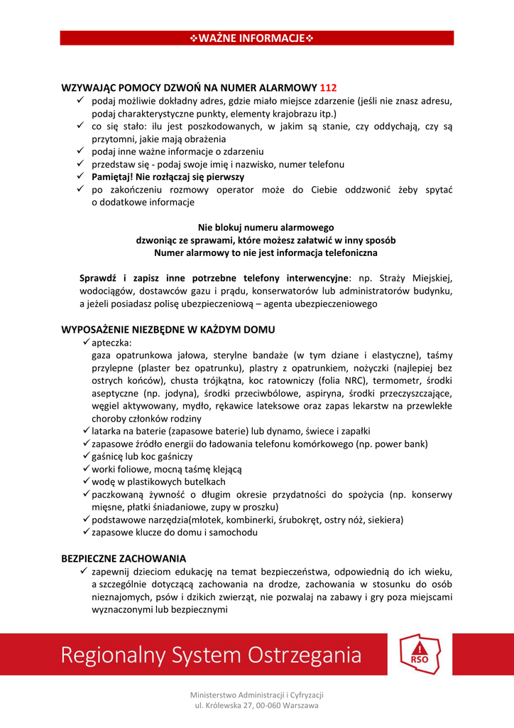 WAŻNE INFORMACJE WZYWAJĄC POMOCY DZWOŃ NA NUMER ALARMOWY 112 podaj możliwie dokładny adres, gdzie miało miejsce zdarzenie (jeśli nie znasz adresu, podaj charakterystyczne punkty, elementy krajobrazu itp.) co się stało: ilu jest poszkodowanych, w jakim są stanie, czy oddychają, czy są przytomni, jakie mają obrażenia podaj inne ważne informacje o zdarzeniu przedstaw się - podaj swoje imię i nazwisko, numer telefonu Pamiętaj! Nie rozłączaj się pierwszy po zakończeniu rozmowy operator może do Ciebie oddzwonić żeby spytać o dodatkowe informacje Nie blokuj numeru alarmowego dzwoniąc ze sprawami, które możesz załatwić w inny sposób Numer alarmowy to nie jest informacja telefoniczna Sprawdź i zapisz inne potrzebne telefony interwencyjne: np. Straży Miejskiej, wodociągów, dostawców gazu i prądu, konserwatorów lub administratorów budynku, a jeżeli posiadasz polisę ubezpieczeniową – agenta ubezpieczeniowego WYPOSAŻENIE NIEZBĘDNE W KAŻDYM DOMU apteczka: gaza opatrunkowa jałowa, sterylne bandaże (w tym dziane i elastyczne), taśmy przylepne (plaster bez opatrunku), plastry z opatrunkiem, nożyczki (najlepiej bez ostrych końców), chusta trójkątna, koc ratowniczy (folia NRC), termometr, środki aseptyczne (np. jodyna), środki przeciwbólowe, aspiryna, środki przeczyszczające, węgiel aktywowany, mydło, rękawice lateksowe oraz zapas lekarstw na przewlekłe choroby członków rodziny latarka na baterie (zapasowe baterie) lub dynamo, świece i zapałki zapasowe źródło energii do ładowania telefonu komórkowego (np. power bank) gaśnicę lub koc gaśniczy worki foliowe, mocną taśmę klejącą wodę w plastikowych butelkach paczkowaną żywność o długim okresie przydatności do spożycia (np. konserwy mięsne, płatki śniadaniowe, zupy w proszku) podstawowe narzędzia(młotek, kombinerki, śrubokręt, ostry nóż, siekiera) zapasowe klucze do domu i samochodu BEZPIECZNE ZACHOWANIA zapewnij dzieciom edukację na temat bezpieczeństwa, odpowiednią do ich wieku, a szczególnie dotyczącą zachowania na drodze, zachowania w stosunku do osób nieznajomych, psów i dzikich zwierząt, nie pozwalaj na zabawy i gry poza miejscami wyznaczonymi lub bezpiecznymi Ministerstwo Administracji i Cyfryzacji ul. Królewska 27, 00-060 Warszawa naucz dzieci dzwonienia na numer alarmowy 112 oraz jak zachować się, gdy się zgubią, dzieci powinny znać adres zamieszkania i numer telefonu kontaktowego do rodziców jeśli przebywasz w miejscu gdzie jest ryzyko, że dziecko może się zgubić ( duże skupiska ludzi np. plaża, centrum handlowe, imprezy masowe itp., ewakuacja, sytuacja zagrożenia) wyposaż dziecko w kartkę lub opaskę zawierającą dane dziecka i numer telefonu, w ostateczności napisz numer telefonu długopisem na zewnętrznej części dłoni każdy człowiek starszy lub niepełnosprawny powinien posiadać zalaminowaną kartę z numerem telefonu do kontaktu w razie wypadku i informacjami na temat stanu swojego zdrowia oraz przyjmowanych leków przygotuj oraz trzymaj w miejscu znanym wszystkim domownikom rodzinny plan na wypadek sytuacji kryzysowej przemyśl, jakie zagrożenia mogą ciebie dotyczyć czego możesz w ich przypadku potrzebować przygotuj kartkę z ważnymi numerami kontaktowymi wyznacz bezpieczne miejsce spotkania poza domem na czyją pomoc możesz liczyć i czy możesz komuś pomóc zapoznaj domowników z umiejscowieniem głównych zaworów gazu, wody oraz wyłącznikiem prądu W DOMU leki i środki chemiczne przechowuj w bezpiecznym, niedostępnym dla dzieci miejscu, zawsze w dobrze oznakowanych opakowaniach niebezpieczne narzędzia i materiały łatwopalne przechowuj z zachowaniem środków ostrożności nie używaj uszkodzonych urządzeń elektrycznych, dbaj o sprawność gniazdek elektrycznych schody i korytarze muszą dobrze oświetlone i zaopatrzone w poręcze zabezpiecz brzegi wykładzin, dywanów lub innych przykryć podłogowych przed odstawaniem od podłogi dbaj o sprawność zamków i klamek w drzwiach, oknach i drzwiach balkonowych, sprawdzaj stan barierek na balkonach; zabezpiecz okna i drzwi przed przypadkowym otwarciem lub zamknięciem np. przy przeciągu, silnym wietrze nie lekceważ przeglądów instalacji gazowej i kominowej, dbaj o sprawność przewodów wentylacyjnych W KUCHNI naczynia stawiaj tak, aby ich rączki nie wystawały poza obręb płyty grzejnej ani mebli; nie stawiaj na brzegu szafek lub stołu naczyń z gorącymi potrawami nie pozostawiaj włączonej kuchenki bez dozoru, jeśli opuszczasz kuchnie podczas gotowania, nastaw minutnik Ministerstwo Administracji i Cyfryzacji ul. Królewska 27, 00-060 Warszawa zabezpiecz noże, ostre przedmioty, urządzenia elektryczne przed dostępem dzieci, ogranicz dostęp dzieci do kuchni w czasie gotowania nie trzymaj materiałów łatwopalnych w pobliżu źródeł ognia kontroluj stan urządzeń zasilanych gazem jeśli ogniem zajmie się rozlany tłuszcz albo zawartość patelni, nigdy nie gaś takiego pożaru wodą; załóż rękawice ochronne i przykryj patelnię pokrywką albo skorzystaj z koca gaśniczego – odetniesz dopływ tlenu, który jest potrzebny płomieniowi dbaj oto by podłoga w kuchni nie była śliska (np. rozlany płyn, dywaniki) W ŁAZIENCE nie napełniaj wanny wyłącznie gorącą wodą nie pozostawiaj bez nadzoru odkręconych kranów wyposaż brodzik prysznica w uchwyt do trzymania się i matę przeciwślizgową w trakcie używania urządzeń elektrycznych zachowaj ostrożność w celu uniknięcia porażenia prądem sprawdź czy maty lub dywaniki nie przesuwają się po śliskiej podłodze łazienki nie pozostawiaj małych dzieci samych w łazience. W GARAŻU I W OGRODZIE środki chemiczne trzymaj w dobrze oznakowanych pojemnikach, nie używaj pojemników po napojach lub żywności, aby uniknąć pomyłki wszystkie potencjalnie niebezpieczne substancje, np. farby, rozpuszczalniki, paliwo, środki czystości, przechowuj w bezpiecznym miejscu, 