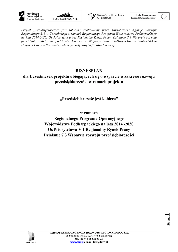 Projekt „Przedsiębiorczość jest kobieca” realizowany przez Tarnobrzeską Agencję Rozwoju Regionalnego S.A. w Tarnobrzegu w ramach Regionalnego Programu Województwa Podkarpackiego na lata 2014-2020, Oś Priorytetowa VII Regionalny Rynek Pracy, Działanie 7.3 Wsparcie rozwoju przedsiębiorczości, na podstawie Umowy z Województwem Podkarpackim - Wojewódzkim Urzędem Pracy w Rzeszowie, pełniącym rolę Instytucji Pośredniczącej. BIZNESPLAN dla Uczestniczek projektu ubiegających się o wsparcie w zakresie rozwoju przedsiębiorczości w ramach projektu „Przedsiębiorczość jest kobieca” Strona 1 w ramach Regionalnego Programu Operacyjnego Województwa Podkarpackiego na lata 2014 -2020 Oś Priorytetowa VII Regionalny Rynek Pracy Działanie 7.3 Wsparcie rozwoju przedsiębiorczości TARNOBRZESKA AGENCJA ROZWOJU REGIONALNEGO S.A. ul. Sandomierska 25, 39-400 Tarnobrzeg tel./fax +48 15 822 00 22 www.tarr.ple-mail: [email protected] Spis treści 1.2 CHARAKTERYSTYKA PLANOWANEGO PRZEDSIĘWZIĘCIA ...................................................... 3 II. POTENCJAŁ I WYKSZTAŁCENIE UCZESTNICZKI PROJEKTU .................................................... 4 2.1 KWALIFIKACJE I DOŚWIADCZENIE ZWIĄZANE Z PLANOWANĄ DZIAŁALNOŚCIĄ GOSPODARCZĄ ...................................................................................................................................... 4 2.2 ZASOBY PLANOWANE DO WYKORZYSTANIA DO DZIAŁALNOŚCI GOSPODARCZEJ .......... 5 2.3 PODJĘTE DZIAŁANIA CELEM ZAŁOŻENIA DZIAŁALNOŚCI GOSPODARCZEJ ...................... 5 2.4 INFORMACJA NA TEMAT PLANOWANEGO ZATRUDNIANIA PRACOWNIKÓW ..................... 5 III. ZNAJOMOŚĆ RYNKU I KONKURENCJI ................................................................................................ 6 3.1 OPIS OFERTY I JEJ POZYCJA NA RYNKU ........................................................................................................... 6 3.2 RYNEK I KLIENCI .............................................................................................................................................. 7 3.3 DYSTRYBUCJA I PROMOCJA ............................................................................................................................. 8 3.4 KONKURENCJA NA RYNKU ............................................................................................................................... 8 IV. OPŁACALNOŚĆ I EFEKTYWNOŚĆ PRZEDSIĘWZIĘCIA ............................................................... 9 4.1 PRZEWIDYWANE WYDATKI .............................................................................................................. 9 4.2 UZASADNIENIE KONIECZNOŚCI PONIESIENIA WYDATKÓW ................................................. 10 4.4 HARMONOGRAM RZECZOWO-FINANSOWY WYDATKOWANIA ŚRODKÓW FINANSOWYCH NA ROZWÓJ PRZEDSIĘBIORCZOŚCI ................................................................ 10 4.5 PROGNOZA CEN PLANOWANYCH PRODUKTÓW, USŁUG, TOWARÓW ................................. 11 4.9 SZCZEGÓŁOWY OPIS ZAŁOŻEŃ PRZYJĘTYCH DO KALKULACJI KOSZTÓW ..................... 13 V. WYSOKOŚĆ WNIOSKOWANEGO WSPARCIA POMOSTOWEGO ................................................ 13 Strona 2 VI. ZAŁĄCZNIKI ........................................................................................................................................ 14 TARNOBRZESKA AGENCJA ROZWOJU REGIONALNEGO S.A. ul. Sandomierska 25, 39-400 Tarnobrzeg tel./fax +48 15 822 00 22 www.tarr.ple-mail: [email protected] I. POMYSŁ NA BIZNES 1.1 Informacje ogólne o Uczestniczce projektu Imię i nazwisko Adres zamieszkania PESEL NIP Tel. kontaktowy E-mail Przewidywana nazwa działalności Planowana data rozpoczęcia działalności gospodarczej Przedmiot i zakres działalności gospodarczej /według PKD/ Forma prawna działalności gospodarczej Lokalizacja siedziby działalności gospodarczej Łączna kwota wnioskowanych bezzwrotnych środków na rozwój przedsiębiorczości /dotacji inwestycyjnej/ Strona 3 1.2 Charakterystyka planowanego przedsięwzięcia Krótka charakterystyka pomysłu biznesowego wraz z identyfikacją jego zagrożeń (ograniczeń). TARNOBRZESKA AGENCJA ROZWOJU REGIONALNEGO S.A. ul. Sandomierska 25, 39-400 Tarnobrzeg tel./fax +48 15 822 00 22 www.tarr.ple-mail: [email protected] II. POTENCJAŁ I WYKSZTAŁCENIE UCZESTNICZKI PROJEKTU 2.1 Kwalifikacje i doświadczenie związane z planowaną działalnością gospodarczą Wykształcenie Doświadczenie zawodowe Informacje na temat doświadczeniu zawodowego Uczestniczki projektu, które mogą być przydatne lub wymagane przy planowanej działalności gospodarczej. Należy podać nazwę pracodawcy, zajmowane stanowisko oraz okres zatrudnienia. W przypadku osób, które prowadziły wcześniej działalność gospodarczą należy obowiązkowo podać następujące informacje na temat tej działalności: formę prawną, branżę, rodzaj oferowanych produktów/usług/towarów oraz okres prowadzenia działalności. Ukończone kursy i szkolenia Informacje o ukończonych kursach bądź szkoleniach, które mogą być przydatne lub wymagane przy planowanej działalności gospodarczej. Należy podać nazwę instytucji organizującej kurs/szkolenie, tytuł kursu/szkolenia oraz rok ukończenia kursu/szkolenia. Strona 4 Inne umiejętności TARNOBRZESKA AGENCJA ROZWOJU REGIONALNEGO S.A. ul. Sandomierska 25, 39-400 Tarnobrzeg tel./fax +48 15 822 00 22 www.tarr.ple-mail: [email protected] 2.2 Zasoby planowane do wykorzystania do działalności gospodarczej W punkcie tym należy wymienić zasoby posiadane przez Uczestniczkę projektu, które będą wykorzystywane do założenia i prowadzenia planowanej działalności gospodarczej. 2.3 Podjęte działania celem założenia działalności gospodarczej W punkcie tym należy opisać działania podjęte przez Uczestniczkę projektu w celu założenia planowanej działalności gospodarczej. Strona 5 2.4 Informacja na t