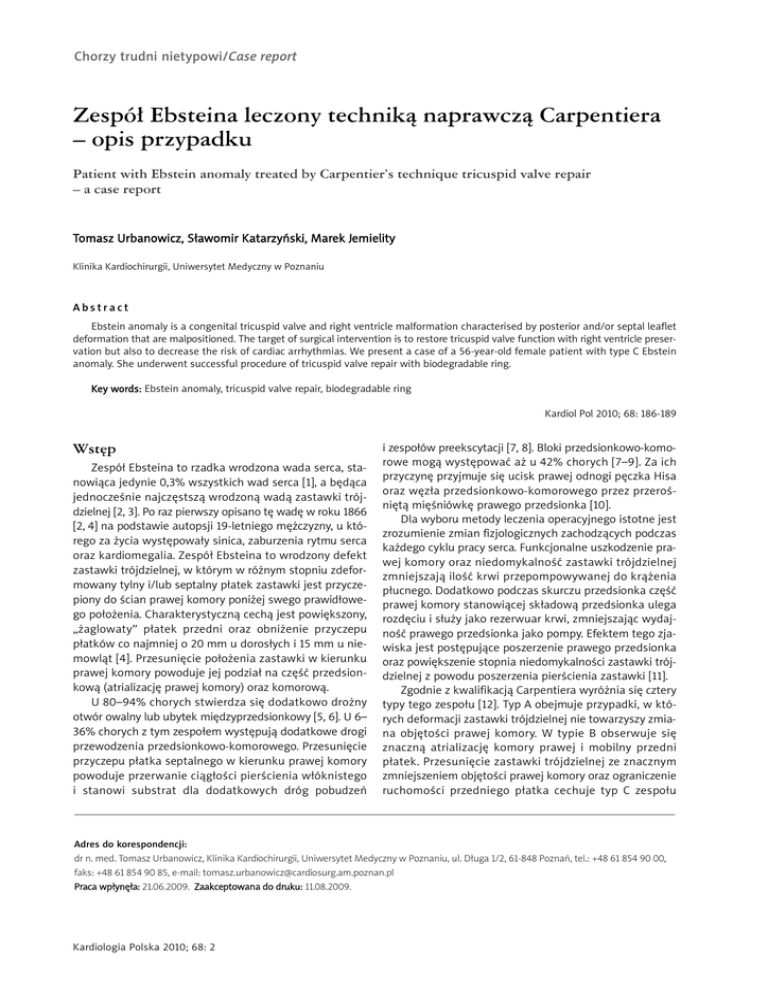 Chorzy trudni nietypowi/Case report Zespół Ebsteina leczony techniką naprawczą Carpentiera – opis przypadku Patient with Ebstein anomaly treated by Carpentier’s technique tricuspid valve repair – a case report Tomasz Urbanowicz, Sławomir Katarzyński, Marek Jemielity Klinika Kardiochirurgii, Uniwersytet Medyczny w Poznaniu Abstract Ebstein anomaly is a congenital tricuspid valve and right ventricle malformation characterised by posterior and/or septal leaflet deformation that are malpositioned. The target of surgical intervention is to restore tricuspid valve function with right ventricle preservation but also to decrease the risk of cardiac arrhythmias. We present a case of a 56-year-old female patient with type C Ebstein anomaly. She underwent successful procedure of tricuspid valve repair with biodegradable ring. Key words: Ebstein anomaly, tricuspid valve repair, biodegradable ring Kardiol Pol 2010; 68: 186-189 Wstęp Zespół Ebsteina to rzadka wrodzona wada serca, stanowiąca jedynie 0,3% wszystkich wad serca [1], a będąca jednocześnie najczęstszą wrodzoną wadą zastawki trójdzielnej [2, 3]. Po raz pierwszy opisano tę wadę w roku 1866 [2, 4] na podstawie autopsji 19-letniego mężczyzny, u którego za życia występowały sinica, zaburzenia rytmu serca oraz kardiomegalia. Zespół Ebsteina to wrodzony defekt zastawki trójdzielnej, w którym w różnym stopniu zdeformowany tylny i/lub septalny płatek zastawki jest przyczepiony do ścian prawej komory poniżej swego prawidłowego położenia. Charakterystyczną cechą jest powiększony, „żaglowaty” płatek przedni oraz obniżenie przyczepu płatków co najmniej o 20 mm u dorosłych i 15 mm u niemowląt [4]. Przesunięcie położenia zastawki w kierunku prawej komory powoduje jej podział na część przedsionkową (atrializację prawej komory) oraz komorową. U 80–94% chorych stwierdza się dodatkowo drożny otwór owalny lub ubytek międzyprzedsionkowy [5, 6]. U 6– 36% chorych z tym zespołem występują dodatkowe drogi przewodzenia przedsionkowo-komorowego. Przesunięcie przyczepu płatka septalnego w kierunku prawej komory powoduje przerwanie ciągłości pierścienia włóknistego i stanowi substrat dla dodatkowych dróg pobudzeń i zespołów preekscytacji [7, 8]. Bloki przedsionkowo-komorowe mogą występować aż u 42% chorych [7–9]. Za ich przyczynę przyjmuje się ucisk prawej odnogi pęczka Hisa oraz węzła przedsionkowo-komorowego przez przerośniętą mięśniówkę prawego przedsionka [10]. Dla wyboru metody leczenia operacyjnego istotne jest zrozumienie zmian fizjologicznych zachodzących podczas każdego cyklu pracy serca. Funkcjonalne uszkodzenie prawej komory oraz niedomykalność zastawki trójdzielnej zmniejszają ilość krwi przepompowywanej do krążenia płucnego. Dodatkowo podczas skurczu przedsionka część prawej komory stanowiącej składową przedsionka ulega rozdęciu i służy jako rezerwuar krwi, zmniejszając wydajność prawego przedsionka jako pompy. Efektem tego zjawiska jest postępujące poszerzenie prawego przedsionka oraz powiększenie stopnia niedomykalności zastawki trójdzielnej z powodu poszerzenia pierścienia zastawki [11]. Zgodnie z kwalifikacją Carpentiera wyróżnia się cztery typy tego zespołu [12]. Typ A obejmuje przypadki, w których deformacji zastawki trójdzielnej nie towarzyszy zmiana objętości prawej komory. W typie B obserwuje się znaczną atrializację komory prawej i mobilny przedni płatek. Przesunięcie zastawki trójdzielnej ze znacznym zmniejszeniem objętości prawej komory oraz ograniczenie ruchomości przedniego płatka cechuje typ C zespołu Adres do korespondencji: dr n. med. Tomasz Urbanowicz, Klinika Kardiochirurgii, Uniwersytet Medyczny w Poznaniu, ul. Długa 1/2, 61-848 Poznań, tel.: +48 61 854 90 00, faks: +48 61 854 90 85, e-mail: [email protected] Praca wpłynęła: 21.06.2009. Zaakceptowana do druku: 11.08.2009. Kardiologia Polska 2010; 68: 2 187 Zespół Ebsteina leczony techniką naprawczą Carpentiera – opis przypadku Ebsteina. W typie D prawa komora prawie całkowicie stanowi część przedsionka (choroba Uhla). Za wskazanie do leczenia operacyjnego uznaje się występowanie objawów klinicznych, takich jak sinica obwodowa z kompensacyjną policytemią, zaawansowana niewydolność serca w klasie III lub IV wg NYHA oraz zaburzenia rytmu serca poddające się leczeniu interwencyjnemu. W artykule przedstawiono przykład skutecznego leczenia naprawczego niedomykalności trójdzielniej w zespole Ebsteina. Opis przypadku Kobieta 56-letnia została przyjęta do Kliniki z powodu nasilających się objawów duszności, znacznie ograniczających codzienną aktywność ruchową (klasa III/IV wg NYHA). Chora zgłaszała uczucie okresowo nawracających kołatań serca. W przeszłości stwierdzano u niej napadowe migotanie przedsionków, przewlekłą niewydolność nerek oraz niedoczynność tarczycy. Kobieta przebyła w 2005 i 2008 r. udar mózgu. W 2004 r. z powodu zespołu chorej zatoki wszczepiono stymulator typu DDD. Przy przyjęciu na oddział w badaniu przedmiotowym stwierdzono obrzęki kończyn dolnych i zasinienie powłok skórnych. Nad sercem, w polu osłuchiwania zastawki trójdzielnej wysłuchiwano szeroko rozdwojony pierwszy ton serca oraz szmer skurczowy zwiększający głośność po wysiłku. Nad dolnymi polami płucnymi stwierdzono trzeszczenia, dolny brzeg wątroby był wyczuwalny na wysokości 2 palców. Badania laboratoryjne wykazały stan eutyreozy. W badaniu EKG stwierdzano rytm zatokowy z licznymi przedwczesnymi pobudzeniami nadkomorowymi oraz okresowo stymulację ze stymulatora w trybie VAT. W badaniu RTG klatki piersiowej obserwowano znacznie powiększoną sylwetkę serca o wygładzonej talii. Badanie echokardiograficzne przezklatkowe (TTE) ujawniło zastawkę trójdzielną przesuniętą w głąb prawej komory o ok. 2,1 cm (Rycina 1.). Obserwowano małą prawą komorę (RVDd = 30 mm) oraz Rycina 1. O