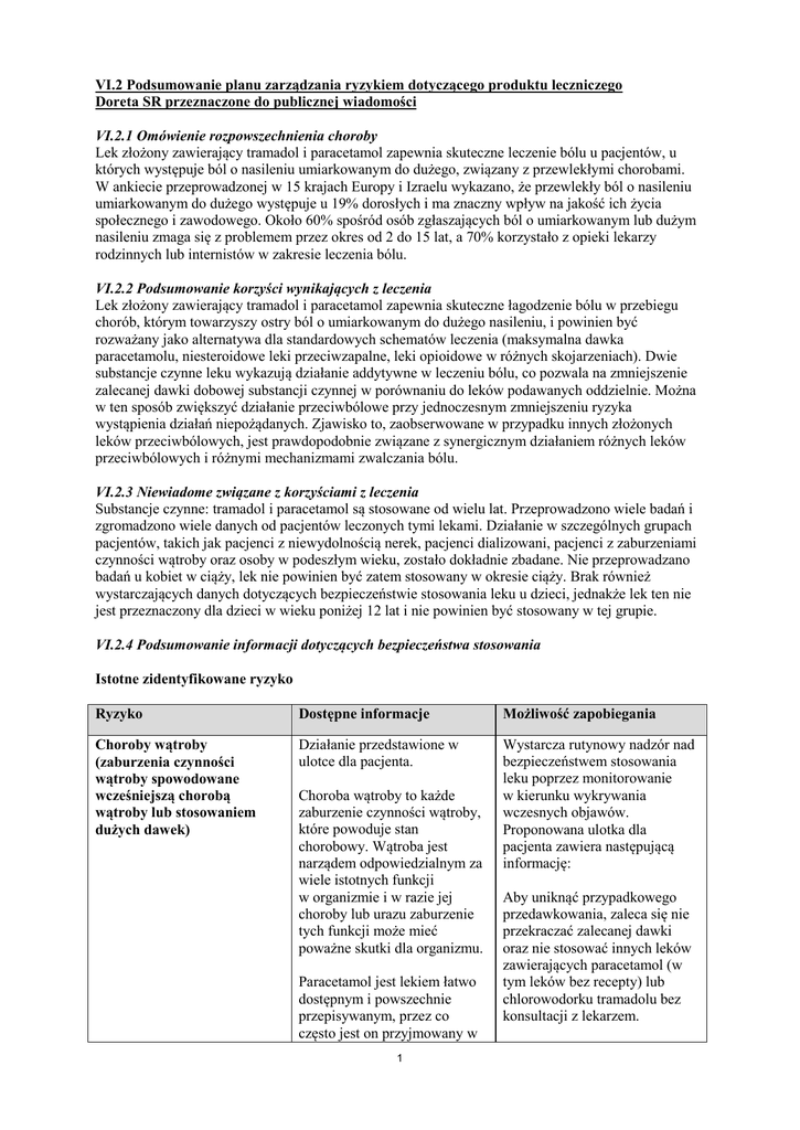 VI.2 Podsumowanie planu zarządzania ryzykiem dotyczącego produktu leczniczego Doreta SR przeznaczone do publicznej wiadomości VI.2.1 Omówienie rozpowszechnienia choroby Lek złożony zawierający tramadol i paracetamol zapewnia skuteczne leczenie bólu u pacjentów, u których występuje ból o nasileniu umiarkowanym do dużego, związany z przewlekłymi chorobami. W ankiecie przeprowadzonej w 15 krajach Europy i Izraelu wykazano, że przewlekły ból o nasileniu umiarkowanym do dużego występuje u 19% dorosłych i ma znaczny wpływ na jakość ich życia społecznego i zawodowego. Około 60% spośród osób zgłaszających ból o umiarkowanym lub dużym nasileniu zmaga się z problemem przez okres od 2 do 15 lat, a 70% korzystało z opieki lekarzy rodzinnych lub internistów w zakresie leczenia bólu. VI.2.2 Podsumowanie korzyści wynikających z leczenia Lek złożony zawierający tramadol i paracetamol zapewnia skuteczne łagodzenie bólu w przebiegu chorób, którym towarzyszy ostry ból o umiarkowanym do dużego nasileniu, i powinien być rozważany jako alternatywa dla standardowych schematów leczenia (maksymalna dawka paracetamolu, niesteroidowe leki przeciwzapalne, leki opioidowe w różnych skojarzeniach). Dwie substancje czynne leku wykazują działanie addytywne w leczeniu bólu, co pozwala na zmniejszenie zalecanej dawki dobowej substancji czynnej w porównaniu do leków podawanych oddzielnie. Można w ten sposób zwiększyć działanie przeciwbólowe przy jednoczesnym zmniejszeniu ryzyka wystąpienia działań niepożądanych. Zjawisko to, zaobserwowane w przypadku innych złożonych leków przeciwbólowych, jest prawdopodobnie związane z synergicznym działaniem różnych leków przeciwbólowych i różnymi mechanizmami zwalczania bólu. VI.2.3 Niewiadome związane z korzyściami z leczenia Substancje czynne: tramadol i paracetamol są stosowane od wielu lat. Przeprowadzono wiele badań i zgromadzono wiele danych od pacjentów leczonych tymi lekami. Działanie w szczególnych grupach pacjentów, takich jak pacjenci z niewydolnością nerek, pacjenci dializowani, pacjenci z zaburzeniami czynności wątroby oraz osoby w podeszłym wieku, zostało dokładnie zbadane. Nie przeprowadzano badań u kobiet w ciąży, lek nie powinien być zatem stosowany w okresie ciąży. Brak również wystarczających danych dotyczących bezpieczeństwie stosowania leku u dzieci, jednakże lek ten nie jest przeznaczony dla dzieci w wieku poniżej 12 lat i nie powinien być stosowany w tej grupie. VI.2.4 Podsumowanie informacji dotyczących bezpieczeństwa stosowania Istotne zidentyfikowane ryzyko Ryzyko Dostępne informacje Możliwość zapobiegania Choroby wątroby (zaburzenia czynności wątroby spowodowane wcześniejszą chorobą wątroby lub stosowaniem dużych dawek) Działanie przedstawione w ulotce dla pacjenta. Wystarcza rutynowy nadzór nad bezpieczeństwem stosowania leku poprzez monitorowanie w kierunku wykrywania wczesnych objawów. Proponowana ulotka dla pacjenta zawiera następującą informację: Choroba wątroby to każde zaburzenie czynności wątroby, które powoduje stan chorobowy. Wątroba jest narządem odpowiedzialnym za wiele istotnych funkcji w organizmie i w razie jej choroby lub urazu zaburzenie tych funkcji może mieć poważne skutki dla organizmu. Paracetamol jest lekiem łatwo dostępnym i powszechnie przepisywanym, przez co często jest on przyjmowany w 1 Aby uniknąć przypadkowego przedawkowania, zaleca się nie przekraczać zalecanej dawki oraz nie stosować innych leków zawierających paracetamol (w tym leków bez recepty) lub chlorowodorku tramadolu bez konsultacji z lekarzem. Napady padaczkowe (np. u pacjentów z nieodpowiednio kontrolowaną padaczką) zbyt dużych dawkach. Jest bardzo przydatnym lekiem przeciwbólowym (stosowanym samodzielnie i w lekach złożonych) oraz przeciwgorączkowym. Warto pamiętać, że paracetamol stosowany w dawkach terapeutycznych jest zazwyczaj bezpieczny i skuteczny. Jednakże może powodować ciężkie lub nawet śmiertelne działania niepożądane; wykazano, że dawka 4 g na dobę (lub nieco większa dawka) stosowana przez kilka dni wykazuje działanie hepatotoksyczne. Istnieje tu znaczna zmienność między pacjentami, która zależy od wieku, stanu zdrowia oraz jednocześnie stosowanych leków. Przedawkowanie paracetamolu może być przypadkowe lub celowe. Liczba przypadkowych zatruć jest większa wśród małych dzieci. Zgłaszano także przypadki nałogowych alkoholików, u których po niewielkim przedawkowaniu, a nawet stosowaniu dawek terapeutycznych doszło do niewydolności wątroby. Działanie niepożądane opisane w ulotce dla pacjenta. Padaczka to zaburzenia czynności mózgu objawiająca się nawracającymi napadami. Napady padaczkowe występują, gdy grupy komórek nerwowych, czyli neuronów, w mózgu zaczynają przesyłać nieprawidłowe sygnały. Pacjenci mogą mieć dziwne odczucia i emocje albo zachowywać się w dziwny sposób. Może dochodzić do gwałtownych skurczów mięśni lub utraty przytomności. Zaobserwowano napady padaczkowe u pacjentów stosujących standardowe dawki tramadolu. Jednak wydaje się, że są one najczęstsze u osób 2 Nie należy stosować leku Doreta SR: - u pacjentów pijących alkohol, - u pacjentów z ciężkimi chorobami wątroby. Należy zachować szczególną ostrożność stosując lek Doreta SR w przypadku chorób wątroby, alkoholowej choroby wątroby oraz wystąpienia zażółcenia skóry i białek oczu objawów, które mogą wskazywać na żółtaczkę lub chorobę dróg żółciowych. Ciężka choroba wątroby lub nerek (niewydolność)/pacjenci dializowani: Nie należy stosować leku Doreta SR u pacjentów z ciężkimi chorobami wątroby. Zastosowanie większej niż zalecana dawki leku Doreta SR W przypadku przedawkowania leku należy niezwłocznie poradzić się lekarza, nawet jeśli pacjent czuje się dobrze, ponieważ istnieje ryzyko opóźnionego, ciężk
