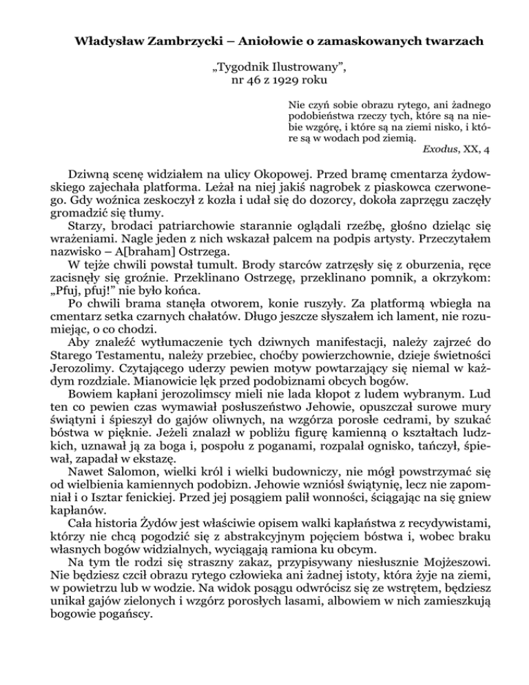Władysław Zambrzycki – Aniołowie o zamaskowanych twarzach „Tygodnik Ilustrowany”, nr 46 z 1929 roku Nie czyń sobie obrazu rytego, ani żadnego podobieństwa rzeczy tych, które są na niebie wzgórę, i które są na ziemi nisko, i które są w wodach pod ziemią. Exodus, XX, 4 Dziwną scenę widziałem na ulicy Okopowej. Przed bramę cmentarza żydowskiego zajechała platforma. Leżał na niej jakiś nagrobek z piaskowca czerwonego. Gdy woźnica zeskoczył z kozła i udał się do dozorcy, dokoła zaprzęgu zaczęły gromadzić się tłumy. Starzy, brodaci patriarchowie starannie oglądali rzeźbę, głośno dzieląc się wrażeniami. Nagle jeden z nich wskazał palcem na podpis artysty. Przeczytałem nazwisko – A[braham] Ostrzega. W tejże chwili powstał tumult. Brody starców zatrzęsły się z oburzenia, ręce zacisnęły się groźnie. Przeklinano Ostrzegę, przeklinano pomnik, a okrzykom: „Pfuj, pfuj!” nie było końca. Po chwili brama stanęła otworem, konie ruszyły. Za platformą wbiegła na cmentarz setka czarnych chałatów. Długo jeszcze słyszałem ich lament, nie rozumiejąc, o co chodzi. Aby znaleźć wytłumaczenie tych dziwnych manifestacji, należy zajrzeć do Starego Testamentu, należy przebiec, choćby powierzchownie, dzieje świetności Jerozolimy. Czytającego uderzy pewien motyw powtarzający się niemal w każdym rozdziale. Mianowicie lęk przed podobiznami obcych bogów. Bowiem kapłani jerozolimscy mieli nie lada kłopot z ludem wybranym. Lud ten co pewien czas wymawiał posłuszeństwo Jehowie, opuszczał surowe mury świątyni i śpieszył do gajów oliwnych, na wzgórza porosłe cedrami, by szukać bóstwa w pięknie. Jeżeli znalazł w pobliżu figurę kamienną o kształtach ludzkich, uznawał ją za boga i, pospołu z poganami, rozpalał ognisko, tańczył, śpiewał, zapadał w ekstazę. Nawet Salomon, wielki król i wielki budowniczy, nie mógł powstrzymać się od wielbienia kamiennych podobizn. Jehowie wzniósł świątynię, lecz nie zapomniał i o Isztar fenickiej. Przed jej posągiem palił wonności, ściągając na się gniew kapłanów. Cała historia Żydów jest właściwie opisem walki kapłaństwa z recydywistami, którzy nie chcą pogodzić się z abstrakcyjnym pojęciem bóstwa i, wobec braku własnych bogów widzialnych, wyciągają ramiona ku obcym. Na tym tle rodzi się straszny zakaz, przypisywany niesłusznie Mojżeszowi. Nie będziesz czcił obrazu rytego człowieka ani żadnej istoty, która żyje na ziemi, w powietrzu lub w wodzie. Na widok posągu odwrócisz się ze wstrętem, będziesz unikał gajów zielonych i wzgórz porosłych lasami, albowiem w nich zamieszkują bogowie pogańscy. Któż by przypuszczał, że zakaz ten przetrwa do XX wieku, że sztuce i kulturze przyniesie więcej szkód niż wędrówki plemion barbarzyńskich po upadku Imperium Rzymskiego? A jednak przetrwał. Rękami ikonoklastów zburzył sztukę bizantyjską, po upływie paru wieków ponownie dał znać o sobie, niszcząc dorobek średniowiecza. I nie łudźmy się, że dziś zwalcza tylko obrazy kościelne. Zakaz jest absolutny, żadnych nie uznaje kompromisów. Mieszkańców getta każda podobizna zgrozą przejmuje, przy czym twarz wykuta w kamieniu uchodzi za szczyt zuchwalstwa. Nic dziwnego, że w takich warunkach sztuka żydowska nigdy rozwinąć się nie mogła. Nawet w ceramice artyści musieli ograniczać się do kreślenia geometrycznych wzorów, aby, broń Boże, jaka linia nie przypominała zarysów ludzkiej sylwety. Oto dlaczego Palestyna nie pozostawiła dorobku artystycznego, dlaczego dziś jeszcze cmentarzyska żydowskie są smutne, beznadziejnie smutne. Jednak i w tej dziedzinie, jak i w każdej, trafiają się reakcje przeciw absolutyzmowi. Tęsknota ludu izraelskiego do piękna znajduje wyraz w buntach artystów, a bodaj najjaskrawszym typem zbuntowanego mistrza jest wyżej wspomniany rzeźbiarz Ostrzega, uczeń [Henryka] Kuny, twórca nagrodzonego przez warszawskie Towarzystwo Miłośników Sztuk Pięknych „Macierzyństwa”. Ostrzega ma duszę helleńską, lubuje się w kształtach. Jego kamienie żyją. Nawet rozmyślnie zdeformowany anioł zdaje się szlochać i drżeć całym ciałem. Zbuntowany Ostrzega zrobił na gruncie warszawskim pierwszy wyłom w nietykalnym zakazie. Ośmielił się zaludnić cmentarz żydowski aniołami. Zaczął od mglisto zarysowanych postaci, by stopniowo przejść do coraz wyraźniejszych sylwetek. Dziś rzeźbi już całkowite figury z rękami i nogami. Jedynie twarze wciąż jeszcze są zamaskowane. Artysta radzi sobie w najprzeróżniejszy sposób. Niektórzy aniołowie mają oblicza ukryte w dłoniach albo wtulone w przegub ręki. To znów zwisające skrzydło zakrywa twarz przed widzem albo też głowę otula zasłona. Każdy nowy pomnik Ostrzegi wywołuje burzę na cmentarzu. Fanatyczni wrogowie innowacji walczą w sposób podstępny. Niejednokrotnie artysta dowiadywał się z przerażeniem, iż w ciągu nocy oszpecono mu świeżo wzniesiony nagrobek przez polanie smołą. A wtedy musiał czekać, póki czarna warstwa nie wyschnie, by następnie szlifować kamień papierem szmerglowym. Zdarzały się i gorsze wypadki. Ostrzegę zmuszano do niszczenia najpiękniejszych pomników. Tak było z płaskorzeźbą, na której ośmielił się wykuć twarz anioła. Pod presją tłumu, przyszedł na cmentarz z młotkiem i dłutem i własnoręcznie „dorobił” na płaskorzeźbie coś w rodzaju węża okręconego dokoła głowy. Pewnego razu musiał spiłować dłonie. Innemu znów aniołowi ściosał twarz na płasko. Mimo wszystkie trudności, cmentarz żydowski w Warszawie zyskuje coraz więcej artystycznych pomników, upodabniając się do chrześcijańskich cmentarzysk. Obok mistrza zjawili się naśladowcy, a nawet bezwstydni plagiatorzy. Ostrzega początkowo protestował, raz nawet wystąpił na drogę sądową. Osta- tecznie machnął ręką na wszystko, słusznie rozumując, ż
