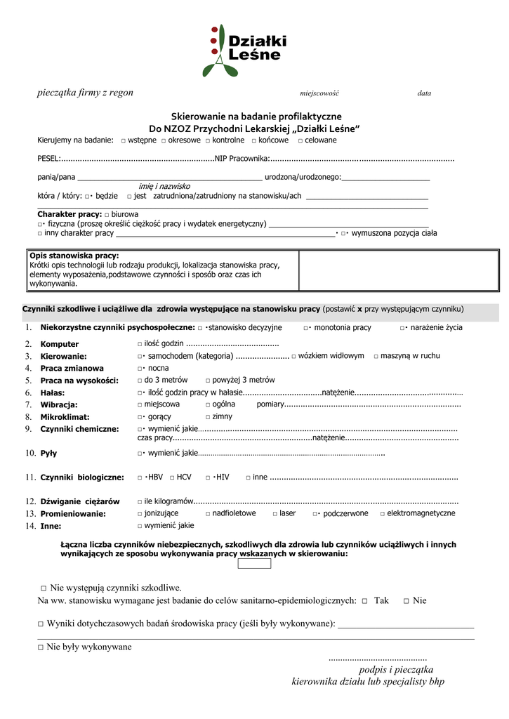pieczątka firmy z regon miejscowość data Skierowanie na badanie profilaktyczne Do NZOZ Przychodni Lekarskiej „Działki Leśne” Kierujemy na badanie: □ wstępne □ okresowe □ kontrolne □ końcowe □ celowane PESEL:..................................................................NIP Pracownika:............................................................................... panią/pana ____________________________________________ urodzoną/urodzonego:_____________________ imię i nazwisko która / który: □ □ jest zatrudniona/zatrudniony na stanowisku/ach _____________________________ _____________________________________________________________________________________________ Charakter pracy: □ biurowa □ □ inny □ Opis stanowiska pracy: Krótki opis technologii lub rodzaju produkcji, lokalizacja stanowiska pracy, elementy wyposażenia,podstawowe czynności i sposób oraz czas ich wykonywania. Czynniki szkodliwe i uciążliwe dla zdrowia występujące na stanowisku pracy (postawić x przy występującym czynniku) 1. Niekorzystne czynniki psychospołeczne: □ 2. 3. 4. 5. 6. 7. 8. 9. □ □ narażenie życia Komputer □ ilość godzin ........................................ Kierowanie: □ Praca zmianowa □ Praca na wysokości: □ do 3 metrów Hałas: □ Wibracja: □ miejscowa □ ogólna Mikroklimat: □ □ zimny Czynniki chemiczne: □ ................................................................................................... czas pracy............................................................natężenie................................................. □ wózkiem widłowym □ maszyną w ruchu □ powyżej 3 metrów ............… pomiary............................................................................ 10. Pyły □ 11. Czynniki biologiczne: □ 12. Dźwiganie ciężarów 13. Promieniowanie: 14. Inne: □ ile kilogramów.................................................................................................................. □ HCV □ jonizujące □ □ inne ................................................................................. □ nadfioletowe □ laser □ one □ elektromagnetyczne □ wymienić jakie Łączna liczba czynników niebezpiecznych, szkodliwych dla zdrowia lub czynników uciążliwych i innych wynikających ze sposobu wykonywania pracy wskazanych w skierowaniu: □ Nie występują czynniki szkodliwe. Na ww. stanowisku wymagane jest badanie do celów sanitarno-epidemiologicznych: □ Tak □ Nie □Wyniki dotychczasowych badań środowiska pracy (jeśli były wykonywane): _____________________________ _____________________________________________________________________________________________ □Nie były wykonywane .......................................... podpis i pieczątka kierownika działu lub specjalisty bhp