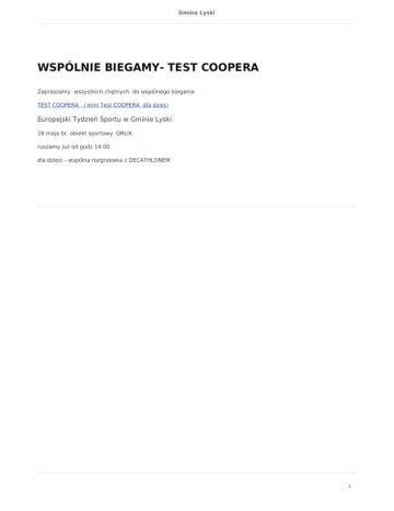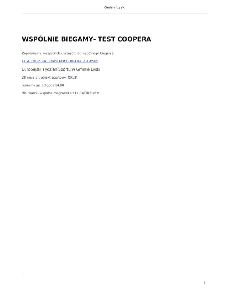 Gmina Lyski WSPÓLNIE BIEGAMY- TEST COOPERA Zapraszamy wszystkich chętnych do wspólnego biegania TEST COOPERA i mini Test COOPERA dla dzieci Europejski Tydzień Sportu w Gminie Lyski 28 maja br. obiekt sportowy ORLIK ruszamy już od godz 14.00 dla dzieci - wspólna rozgrzewka z DECATHLONEM 1