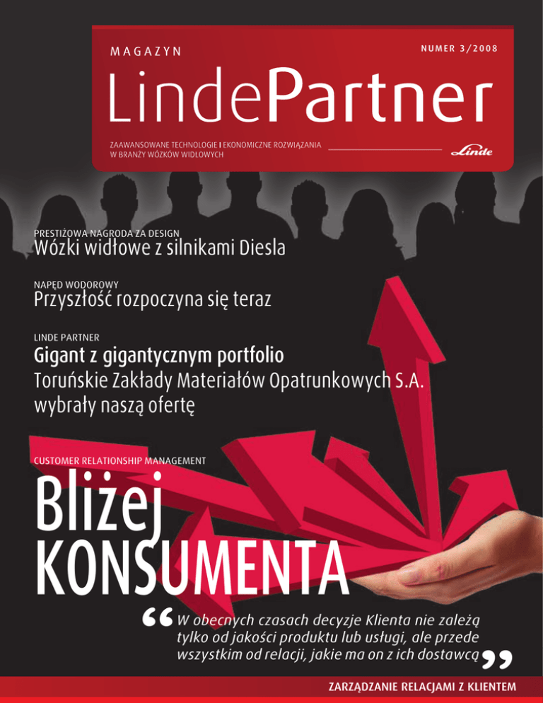 NUMER 3/2008 PRESTIŻOWA NAGRODA ZA DESIGN Wózki widłowe z silnikami Diesla NAPĘD WODOROWY Przyszłość rozpoczyna się teraz LINDE PARTNER Gigant z gigantycznym portfolio Toruńskie Zakłady Materiałów Opatrunkowych S.A. wybrały naszą ofertę Bliżej KONSUMENTA CUSTOMER RELATIONSHIP MANAGEMENT “ W obecnych czasach decyzje Klienta nie zależą tylko od jakości produktu lub usługi, ale przede wszystkim od relacji, jakie ma on z ich dostawcą ” ZARZĄDZANIE RELACJAMI Z KLIENTEM 12 PREZENTACJA PARTNERA | Toruńskie Zakłady Materiałów Opatrunkowych S.A. Toruńskie Zakłady Materiałów Opatrunkowych S.A. Nasze nowoczesne fabryki i Centra Logistyczne – w Rosji, na Ukrainie, w Indiach i w Niemczech – to przykłady największych wartościowo inwestycji polskiego kapitału w tych krajach. Dla inwestycji zrealizowanej w Niemczech nasza spółka prawa niemieckiego otrzymała, ze względu na tworzone przez nas miejsca pracy, trzykrotne dofinansowanie rządu niemieckiego. W roku 2001 Toruńskie Zakłady Materiałów Opatrunkowych S.A. wybudowały od podstaw i otworzyły swój pierwszy Niepubliczny Zakład Opieki Zdrowotnej Szpital Specjalistyczny MATOPAT. Szpital ten odpowiada najwyższym standardom europejskim i jest pierwszą i dotąd jedyną tego typu placówką w regionie. Szpital nie tylko świadczy usługi medyczne, ale także pełni funkcję ośrodka badawczo-rozwojowego i centrum szkoleniowego. W marcu 2004 roku szpital uzyskał certyfikat zgodności systemu zarządzania jakością z wymaganiami normy ISO 9001:2000. Jest to jedyna placówka w regionie kujawsko – pomorskim, która uzyskała certyfikat zgodności systemu zarządzania jakością z normą ISO 9001:2000 w pełnym zakresie usług medycznych, włącznie z hospitalizacją. 26 marca 2008 roku weszło w życie Rozporządzenie Rady Ministrów z dnia 4 marca 2008 r. zmieniające rozporządzenie w sprawie Pomorskiej Specjalnej Strefy Ekonomicznej. Tym samym, teren o powierzchni 7,8218 ha, zlokalizowany we Frydrychowie, w gminie Kowalewo Pomorskie, należący do Toruńskich Zakładów Materiałów Opatrunkowych S.A., został włączony do obszaru PSSE. W roku 2007 na terenie szpitala otwarta została nowowybudowana przychodnia specjalistyczna. Szpital Specjalistyczny Matopat uplasował się na III miejscu w rankingu prywatnych placówek medycznych w Polsce opublikowanym w Tygodniku WPROST, w dniu 27 stycznia 2008 roku. Pozostały obszar podstrefy będzie wykorzystany na inwestycje z udziałem kapitału japońskiego. W roku 2001 Toruńskie Zakłady Materiałów Opatrunkowych S.A. uruchomiły w Łodzi, w roku 2004 – w Bydgoszczy i Krakowie – a w roku 2006 – w Szczecinie – Centra Usług Sterylizacji, świadczące usługi szpitalom i gabinetom regionów łódzkiego, bydgosko-toruńskiego i krakowskiego. Są to najnowocześniejsze sterylizatornie w Europie. Trwa proces dalszej rozbudowy sieci Centralnych Sterylizatorni. Bella Line Wellness Centrum 30 września 2006 roku odbyło się oficjalne otwarcie największego w regionie i jednego z największych w Polsce klubów fitness&wellenss pod nazwą Bella Line Wellness Centrum. Chcemy promować zdrowy, aktywny styl życia. Dlatego inwestujemy w przedsięwzięcia, które bezpośrednio wpływają na kreowanie takiego właśnie modelu spędzania wolnego czasu. LindePartner 3/2008 W ramach inwestycji realizowanej przez Plastica Sp. z o.o.- jedną ze spółek Grupy Kapitałowej TZMO - obszar objęty inwestycją wyniesie 3,2000 ha, co stanowi 40% powierzchni podstrefy. W ciągu 36 miesięcy powstaną tam nowoczesne obiekty, spełniające najwyższe standardy, a zatrudnienie znajdzie w nich 150 osób. Z tytułu realizacji nowej inwestycji Grupa Kapitałowa TZMO S.A. otrzymała pierwszy raz w historii swej działalności w Polsce (od 1991) wsparcie w formie zwolnień podatkowych. Rynek wyrobów higienicznych tradycyjnie opanowany jest przez amerykańskie koncerny. TZMO S.A. są jedną z nielicznych firm europejskich – firmą polską, która, sprzedając produkty pod własnymi markami, z sukcesem konkuruje z potężnymi koncernami międzynarodowymi, które podzieliły rynek światowy: Procter & Gamble, Kimberly Clark, Johnson & Johnson. Udział rynkowy wyrobów ze znakiem Bella w polskim rynku wynosi 60%. Bella na strategicznie ważnych rynkach – w Rosji i na Ukrainie - jest liderem. Wyroby ze znakami SENI (wyroby dla osób z problemami urologicznymi) i MATOPAT (wyroby medyczne) znajdują coraz więcej nabywców na rynkach Europy – w Niemczech, Francji, Danii, Finlandii, Belgii, Norwegii, Szwajcarii. Wyroby Toruńskich Zakładów Materiałów Opatrunkowych docierają do coraz bardziej odległych miejsc na świecie. TZMO S.A. w Federacji Rosyjskiej TZMO S.A. działalność handlową w Rosji rozpoczęły w roku 1994. Dziś posiadamy na terenie Rosji 6 spółek handlowych – w Moskwie, Sankt Petersburgu, Rostowie nad Donem, Nowosybirsku, Jekaterynburgu i Niżnym Nowgorodzie, a sprzedaż prowadzimy poprzez własną sieć sprzedaży. Od 2002 roku prowadzimy na terenie Federacji Rosyjskiej także działalność inwestycyjną. W roku 2003 zakończyliśmy w Jegoriewsku, oddalonym o 80 km od Moskwy, budowę fabryki, dwukrotnie do dziś rozbudowywanej. Kolejny etap inwestycji – uruchomienie najnowocześniejszego w Europie ciągu produkcyjnego do produkcji wyrobów higienicznych dla kobiet, wkrótce zostanie zakończony. Na terenie fabryki powstało nowoczesne Centrum Logistyczne – ważne dla sprawnej organizacji dostaw naszych wyrobów do najbardziej odległych miejsc Rosji, do których dziś docieramy. Podobne centra logistyczne budujemy w tym roku w Sankt Petersburgu i Nowosybirsku. TZMO S.A. w Indiach W 2002 roku wraz z Premier Group, TZMO S.A. powołały firmę BellaPremier Happy Hygienecare PL, w stanie Tamilnadu w Indiach. Spółka JVC zainwestowała w fabrykę w Dindigul około 4,5 miliona dolarów. Jest to jedna z największych inwestycji polskich w Indiach. W 2004 r