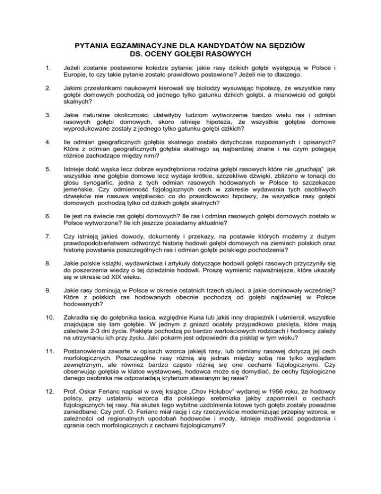 PYTANIA EGZAMINACYJNE DLA KANDYDATÓW NA SĘDZIÓW DS. OCENY GOŁĘBI RASOWYCH 1. Jeżeli zostanie postawione koledze pytanie: jakie rasy dzikich gołębi występują w Polsce i Europie, to czy takie pytanie zostało prawidłowo postawione? Jeżeli nie to dlaczego. 2. Jakimi przesłankami naukowymi kierowali się biolodzy wysuwając hipotezę, że wszystkie rasy gołębi domowych pochodzą od jednego tylko gatunku dzikich gołębi, a mianowicie od gołębi skalnych? 3. Jakie naturalne okoliczności ułatwiłyby ludziom wytworzenie bardzo wielu ras i odmian rasowych gołębi domowych, skoro istnieje hipoteza, że wszystkie gołębie domowe wyprodukowane zostały z jednego tylko gatunku gołębi dzikich? 4. Ile odmian geograficznych gołębia skalnego zostało dotychczas rozpoznanych i opisanych? Które z odmian geograficznych gołębia skalnego są najbardziej znane i na czym polegają różnice zachodzące między nimi? 5. Istnieje dość wąska lecz dobrze wyodrębniona rodzina gołębi rasowych które nie „gruchają” jak wszystkie inne gołębie domowe lecz wydaje krótkie, szczekliwe dźwięki, zbliżone w tonacji do głosu synogarlic, jedna z tych odmian rasowych hodowanych w Polsce to szczekacze jemeńskie. Czy odmienność fizjologicznych cech w zakresie wydawania tych osobliwych dźwięków nie nasuwa wątpliwości co do prawidłowości hipotezy, że wszystkie rasy gołębi domowych pochodzą tylko od dzikich gołębi skalnych? 6. Ile jest na świecie ras gołębi domowych? Ile ras i odmian rasowych gołębi domowych zostało w Polsce wytworzone? Ile ich jeszcze posiadamy aktualnie? 7. Czy istnieją jakieś dowody, dokumenty i przekazy, na postawie których możemy z dużym prawdopodobieństwem odtworzyć historię hodowli gołębi domowych na ziemiach polskich oraz historię powstania poszczególnych ras i odmian gołębi polskiego pochodzenia? 8. Jakie polskie książki, wydawnictwa i artykuły dotyczące hodowli gołębi rasowych przyczyniły się do poszerzenia wiedzy o tej dziedzinie hodowli. Proszę wymienić najważniejsze, które ukazały się w okresie od XIX wieku. 9. Jakie rasy dominują w Polsce w okresie ostatnich trzech stuleci, a jakie dominowały wcześniej? Które z polskich ras hodowanych obecnie pochodzą od gołębi najdawniej w Polsce hodowanych? 10. Zakradła się do gołębnika łasica, względnie Kuna lub jakiś inny drapieżnik i uśmiercił, wszystkie znajdujące się tam gołębie. W jednym z gniazd ocalały przypadkowo pisklęta, które mają zaledwie 2-3 dni życia. Pisklęta pochodzą po bardzo wartościowych rodzicach i hodowcy zależy na utrzymaniu ich przy życiu. Jaki pokarm jest odpowiedni dla piskląt w tym wieku? 11. Postanowienia zawarte w opisach wzorca jakiejś rasy, lub odmiany rasowej dotyczą jej cech morfologicznych. Poszczególne rasy różnią się jednak między sobą nie tylko wyglądem zewnętrznym, ale również bardzo często różnią się one cechami fizjologicznymi. Czy obserwując gołębia w klatce wystawowej, hodowca może się domyślać, że cechy fizjologiczne danego osobnika nie odpowiadają kryterium stawianym tej rasie? 12. Prof. Oskar Ferianc napisał w swej książce „Chov Holubov” wydanej w 1956 roku, że hodowcy polscy, przy ustalaniu wzorca dla polskiego srebrniaka jakby zapomnieli o cechach fizjologicznych tej rasy. Na skutek tego wybitne uzdolnienia lotowe tych gołębi zostały poważnie zaniedbane. Czy prof. O. Ferianc miał rację i czy rzeczywiście modernizując przepisy wzorca, w zależności od regionalnych upodobań hodowców i mody, istnieje możliwość pogodzenia i zgrania cech morfologicznych z cechami fizjologicznymi? 13. Zdziczałe gołębie domowe we Włoszech posiadają identyczny wygląd jak takie same gołębie w Krakowie, Warszawie i innych miastach polskich. Czy świadczy to o tym, że gołębie te były kiedyś w minionych wiekach, sprowadzone do Polski z Włoch? 14. Dwa gołębie rasowe Ryś i Krakus odłączyły się od stada hodowlanego. Przyłączyły się do zdziczałych gołębi miejskich. Które pokolenie gołębi: a) po Rysiu i b) po Krakusie, upodobni się do wszystkich pozostałych gołębi domowych, które zdziczały ? 15. Jaka jest różnica między chowem w bliskim pokrewieństwie a chowem w dalszym pokrewieństwie? Jakie dodatnie, i jakie ujemne strony, posiada chów prowadzony w bliskim pokrewieństwie? 16. Czy w amatorskiej hodowli typu mięsnego, jak rysie lub kingi, ukierunkowanej na pozyskiwanie gołębi o wybitnym pokroju wzorcowym, hodowca może wpłynąć na wzrost, wielkość i użytkowość tych gołębi nadając im odpowiednio skomponowaną karmę? 17. Dlaczego w hodowli gospodarczej, ukierunkowanej wyłącznie na pozyskiwanie odpowiedniego materiału rzeźnego, należy posługiwać się mieszańcami uzyskanymi w dodatku z krzyżówek ”międzygatunkowych” ? Czy gołębie takie można utuczyć taką samą metodą, jaka stosowana jest przy tuczeniu np. gęsi czy indyków? 18. Hodowcy gołębi posługują się własnym językiem, w którym wiele określeń nie odpowiada terminologii naukowej. Jaka jest różnica między: a) brwią, b) ramieniem, c) kolanem, w nazewnictwie stosowanym przez hodowców i nazewnictwie naukowym? 19. Zjawisko zmienności osobniczej zostało wykorzystane przez ludzi do wytworzenia u gołębi domowych ras znacznie większych, jak również ras wyraźnie mniejszych, od gołębia skalnego. Czy miniaturyzacja gołębi domowych oparta jest na odmiennej metodzie i zabiegach hodowlanych, odwrotnych od tych jakie stosowane są w hodowli gołębi olbrzymich i użytkowych? 20. Często w rozmowach potocznych prowadzonych przez hodowców słyszy się o „niezgodności krwi” gołębi przynależnych do tej samej rasy. Co kryje się pod tym pojęciem i jakie mogą być przyczyny niezgodności? 21. „Silna krew” i „Słaba Krew” co oznaczają te pojęcia, stosowane często w języku gwarowym hodowców? 22. Jaka jest przeciętna szybkość 