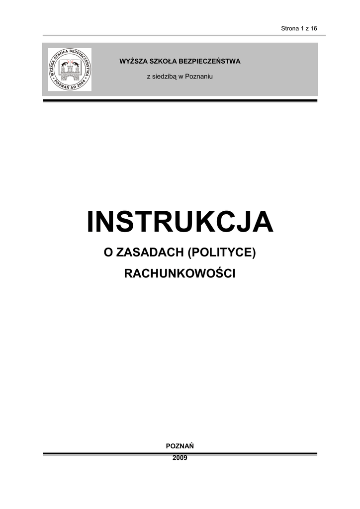 Strona 1 z 16 WYśSZA SZKOŁA BEZPIECZEŃSTWA z siedzibą w Poznaniu INSTRUKCJA O ZASADACH (POLITYCE) RACHUNKOWOŚCI POZNAŃ 2009 Strona 2 z 16 SPIS TREŚCI: Rozdział 1 Wprowadzenie............................................................................................................................ strona 3 Rozdział 2 Ogólne zasady prowadzenia ksiąg rachunkowych.................................................................... 4 Rozdział 3 Obowiązujące metody wyceny aktywów i pasywów oraz ustalanie wyniku finansowego ......... 8 Rozdział 4 Zasady rozliczania kosztów i przychodów………....................................................................... 14 Rozdział 5 System Ochrony Danych ........................................................................................................... 15 Strona 3 z 16 Rozdział 1 WPROWADZENIE § 1. 1. WyŜsza Bezpieczeństwa w Poznaniu (zwana dalej: Uczelnią) jako niepaństwowa szkoła wyŜsza prowadzi rachunkowość według zasad stosowanych przez podmioty gospodarcze, określonych w ustawie o rachunkowości z dnia 29 września 1994 r. (Dz. U. z 2002 r. nr 76 poz. 694 ze zm.). 2. Prowadząc księgi rachunkowe Uczelnia uwzględnia dotyczące jej specyficzne warunki działalności szkół wyŜszych określone przepisami rozporządzenia w sprawie zasad gospodarki finansowej uczelni i przepisami ustawy z dnia 27 lipca 2005 r. Prawo o szkolnictwie wyŜszym (Dz. U. Nr 64 poz. 1365 z późn. zm.). § 2. 1. Działalność uczelni jest finansowana z dotacji z budŜetu państwa na zadania ustawowo określone, z przychodów własnych, z przychodów z tytułu darowizn, dziedziczenia, zapisów oraz ofiarności publicznej, środków pochodzących ze źródeł zagranicznych. 2. Uczelnia tworzy fundusze: 1) Fundusz zasadniczy, 2) Fundusz pomocy materialnej dla studentów i doktorantów, 3) Inne fundusze, których utworzenie przewidują odrębne przepisy. 0. Uczelnia moŜe teŜ tworzyć fundusze: 1) 2) 3) 4) Własny fundusz stypendialny, Uczelniany fundusz nagród, Fundusz wdroŜeniowy, Zakładowy Fundusz Świadczeń Socjalnych. § 3. 1. Uczelnia stosuje w pełni nadrzędne zasady rachunkowości określone ustawą o rachunkowości (art. 4-8), tj.: zasadę rzetelnego obrazu, zasadę przewagi treści nad formą, zasadę ciągłości, zasadę kontynuacji, zasadę memoriału, zasadę współmierności przychodów i kosztów, zasadę ostroŜności, zasadę indywidualnej wyceny i zasadę istotności, a takŜe przepisy dotyczące prowadzenia ksiąg rachunkowych, dowodów księgowych, inwentaryzacji oraz wyceny aktywów i pasywów. 2. Odpowiedzialnym za prowadzenie ksiąg rachunkowych jest Rektor jako kierownik Uczelni. 3. Rektor zapewnia sporządzenie rocznego sprawozdania finansowego nie później niŜ w ciągu 3 miesięcy od dnia bilansowego. § 4. 1. Uczelnia sporządza sprawozdanie finansowe wymagane ustawą (art. 45) na dzień zamknięcia ksiąg rachunkowych, ze szczegółowością określoną w załączniku nr 1 do ustawy o Rachunkowości. 2. Uczelnia moŜe sporządzić sprawozdanie finansowe w formie uproszczonej wykazując informacje w zakresie ustalonym w załączniku nr 1 literami i cyframi rzymskimi, jeŜeli w roku obrotowym, za który sporządza sprawozdanie finansowe oraz w roku poprzedzającym ten rok obrotowy nie osiągnęła dwóch z następujących trzech wielkości: 1) średnioroczne zatrudnienie w przeliczeniu na pełne etaty wyniosło nie więcej niŜ 50 osób, Strona 4 z 16 2) suma aktywów bilansu na koniec roku obrotowego w walucie polskiej nie przekraczała równowartości 2.000.000 euro, 3) przychody netto ze sprzedaŜy produktów i towarów oraz operacji finansowych walucie polskiej nie przekraczały równowartości 4.000.000 euro. 3. WyraŜone wyŜej wielkości w euro przelicza się na walutę polską po średnim kursie, ustalonym przez Narodowy Bank Polski, na dzień bilansowy (por. art. 3 ust. 2 ustawy o rachunkowości). 4. Sprawozdanie finansowe podpisuje Rektor jako kierownik jednostki oraz osoba, której powierzono prowadzenie ksiąg rachunkowych. 5. Roczne sprawozdanie finansowe podlega zatwierdzeniu przez Kierownika Jednostki, nie później niŜ 6 miesięcy od dnia bilansowego. Roczne sprawozdanie finansowe podlega badaniu przez biegłego rewidenta, jeŜeli w poprzedzającym roku obrotowym, za który sporządzono sprawozdanie finansowe spełniły, co najmniej dwa z następujących warunków: 1) średnioroczne zatrudnienie w przeliczeniu na pełne etaty wyniosło co najmniej 50 osób, 2) suma aktywów bilansu na koniec roku obrotowego stanowiła równowartość w walucie polskiej co najmniej 2.500.000 euro, 3) przychody netto ze sprzedaŜy towarów i produktów oraz operacji finansowych za rok obrotowy stanowiły równowartość w walucie polskiej co najmniej 5.000.000 euro. 6. WyraŜone wyŜej wielkości w euro przelicza się na walutę polską po średnim kursie, ustalonym przez Narodowy Bank Polski, na dzień bilansowy (por. art. 3 ust. 2 ustawy o rachunkowości). 7. Podział i pokrycie wyniku finansowego netto moŜe nastąpić po zatwierdzeniu sprawozdania. § 5. Zasady (polityka) rachunkowości mają na celu przedstawienie obowiązujących w WyŜszej Szkole Bezpieczeństwa w Poznaniu: 1) ogólnych zasad prowadzenia ksiąg rachunkowych, 2) metod wyceny aktywów i pasywów oraz ustalania wyniku finansowego, 3) sposobu prowadzenia ksiąg rachunkowych, w tym: a) Zakładowego Planu Kont, b) wykazu zbiorów danych tworzących księgi rachunkowe na komputerowych nośnikach danych, 4) opisu systemu przetwarzania danych (systemu informatycznego), 5) zasad rozliczania kosztów i przychodów, 6) systemu słuŜącego ochronie danych (w tym dowodów księgowych, ksiąg rachunkowych i innych dokumentów stanowiących podstawę dokonanych w nich zapisów). Rozdział 2 OGÓLNE ZASADY PROWADZENIA KSIĄG RACHUNKOWYCH § 6. W WyŜszej Szkole Bezpieczeństwa obowiązują następujące ogólne zasady prowadzenia Strona 5 z 1