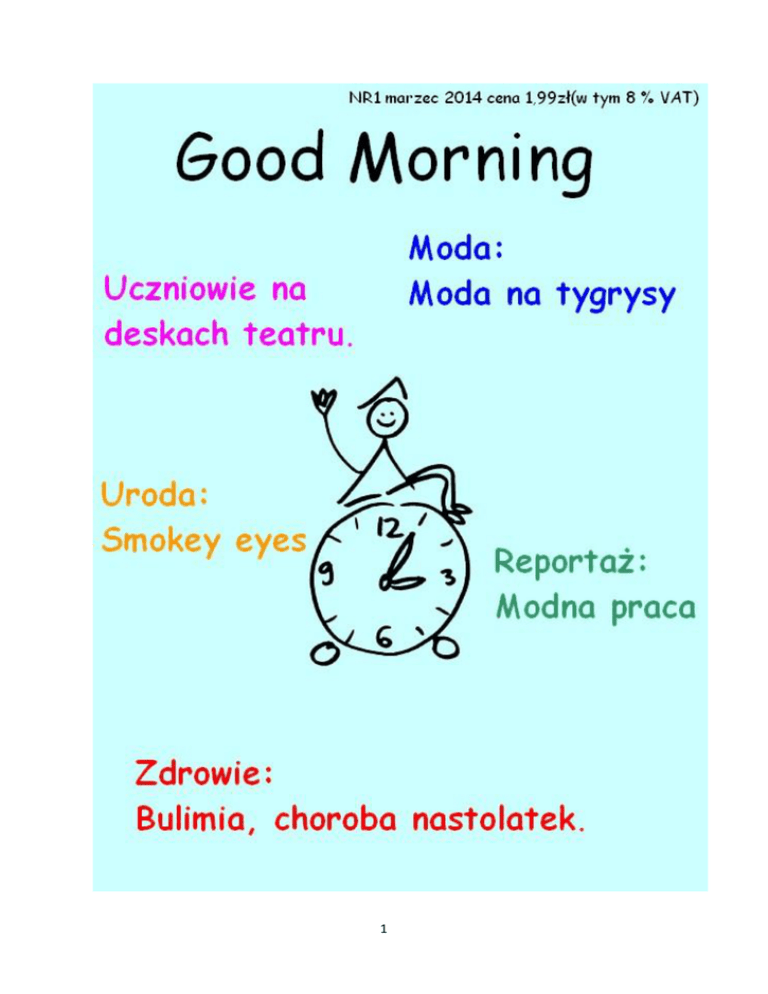 1 Spis treści Informacje 3 Uczniowie na deskach teatru. Zdrowie 4 Bulimia, choroba nastolatek. Moda 6 Moda na tygrysy. Uroda 11 Smoky eyes zawsze w modzie Reportaż 8 Modna praca. Wywiad 12 Wywiad z panią Beatą Kozdroń Portret 15 Wielka Improwizacja Konrada- portret psychologiczny. Felieton 17 Portret przeciętnego absolwenta. 2 wspomnianego liceum, Uczniowie wspierająca aktorów. na deskach Justyna Niezgoda. Osoby Wokalistów do występu świetnie przygotowała Pani biorące udział w przedstawieniu odznaczyły się ogromną teatru. dojrzałością. Widzowie, wedle późniejszych dyskusji, podziwiali perfekcyjnie dobrane Dnia 20 listopada 2013r. odbyła stroje do epoki i urywki nagrań, się premiera spektaklu pt. które zostały w idealny sposób "Zaginął bez wieści" grupy włączone do spektaklu. artystyczno-wokalnej "4art", w której w skład wchodzą uczniowie XXIII Liceum Ogólnokształcącego im. Nauczycieli Tajnego Nauczania w Lublinie. Przedstawienie miało miejsce w Teatrze Starym na ul. Jezuickiej. Ukazuje ono historię trzech rodzin, których losy do końca spektaklu nie są jasne. Akcja rozgrywa się w przedwojennym i wojennym Lublinie. Autorką scenariusza opartego na faktach jest Pani Agnieszka Agnieszka Kowalska Beata Kozdroń, anglistka 3 Bulimia, choroba nastolatek. Należy do najczęstszych zaburzeń odżywania. Bulimia (żarłoczność psychiczna) polega na występowaniu napadów głodu, podczas których osoba chora spożywa różnego rodzaju produkty w ogromnych ilościach, a następnie pozbywa się nadmiaru jedzenia prowokując wymioty, zażywając środki przeczyszczające, wykonując lewatywy itd. Często towarzyszy innemu zaburzeniu odżywiania – anoreksji, czasem jednak występuje u osób o prawidłowej masie ciała i sprawiających pozory zupełnie zdrowych. anoreksja, a jego powodem jest brak samoakceptacji, problemy rodzinne, silny stres, brak akceptacji ze strony otoczenia. Źródeł problemu można doszukiwać się także w zaniedbaniach emocjonalnych w okresie dzieciństwa oraz braku ukształtowania odpowiednich mechanizmów samokontroli. Udowodniono także, że występowanie bulimii może być wywołane złym funkcjonowaniem ośrodka sytości w mózgu, a także pewnymi czynnikami genetycznymi. Ryzyko zachorowania wzrasta więc, jeżeli w rodzinie są osoby otyłe lub cierpiące na depresję. Przyczyny bulimii Objawy bulimii O żarłoczności psychicznej możemy mówić, gdy napady głodu występują co najmniej dwa razy w tygodniu przez minimum trzy miesiące. Zaburzenie to pojawia się cztery razy częściej niż Osoby chore mają świadomość utraty kontroli nad swoim odżywianiem. Często napady głodu wyzwala stres, przygnębienie, niepowodzenie w pracy. W takim momencie 4 spożywają one bardzo duże ilości pokarmu, niekiedy nie mającego żadnych walorów smakowych np. masło, mąka. Następnie następują czynności kompensacyjne. W jednym przypadku (typ przeczyszczający) będzie to zwrócenie zjedzonego pożywienia poprzez wywołanie wymiotów czy biegunki, w drugim (typ nieprzeczyszczający) osoba chora skupi się na intensywnych ćwiczeniach fizycznych oraz drastycznej diecie. wspomagających odchudzanie. Jak walczyć z bulimią? Bulimia, jak większość zaburzeń odżywiania, jest chorobą głównie o podłożu psychicznym. Dlatego najlepsze skutki daje psychoterapia. Istnieje wiele ośrodków prowadzących indywidualne i grupowe zajęcia, pomagające osobom w takim stanie. Lekarz pomoże w dobraniu odpowiednich zajęć, dostosowanych do stanu i preferencji pacjenta. Oprócz terapii dobrze sprawdza się leczenie fluoksetyną, która jest w stanie zredukować znacznie intensywność napadów głodu. W niektórych przypadkach konieczne okazuje się równoczesne leczenie antydepresyjne. Ogromnie ważne jest wsparcie rodziny lub bliskich osób podczas walki z bulimią. Także likwidacja przyczyn jej wystąpienia (konflikty rodzinne, stresująca praca) może przyczynić się do znacznych postępów w szybkim powrocie do zdrowia. Wkrótce pojawiają się objawy wycieńczenia organizmu, takie jak: niedobory pokarmowe, wycieńczenie, zaparcia, odwodnienie, zaburzenia miesiączkowania, zaburzenia funkcjonowania układu pokarmowego, sucha skóra. Do tego dochodzą dolegliwości natury psychicznej: zły nastrój, stany depresyjne, poczucie wstydu i upokorzenia, uzależnienie od środków przeczyszczających i Radosław Gruszczyk 5 Współczesne Safari Motyw zwierzęcej panterki. Wygoda, ponadczasowość, elegancja teraz w całkiem nowym wydaniu. Sprawdzi się nie tylko na wieczór. Nasza propozycja: Kombinezon, Tom Martinx, 179,99zł, torebka, Milosso, 99,99zł, zegarek, O’clock, 599,99zł, bransoletka, Ring, 299,99zł 6 Panterkowe wariacje Spodnie, Denis, 159,99zł, buty, Ładny bucik, 59,99azł, lakier do paznokci, Lee Meer, 19,99zł, szorty, Denis,79,99zł, tunika, Joko, 99,99zł, baleriny, Ładny bucik, 89,99zł, tort, Cukiernia Dekoracyjna, 159,99zł, spódnica, Foloow, 59,99zł Anna Dziurawiec 7 wcześniejsze uczęszczanie do Liceum Plastycznego w Lublinie. - Zawsze marzyłam o tym, aby projektować ubrania, chciałam robić to, co kocham – wspomina. – Robiąc domowe projekty zawsze chciałam, aby ktoś je zrealizował. Dlatego już od najmłodszych lat starałam się robić to, co sprawia, że chyląc się nad kartką, z ołówkiem w ręku, mam uśmiech na twarzy. Kasia szybko zaklimatyzowała się w nowym miejscu, często spotykała się z nowymi znajomymi. Nowe otoczenie sprzyjało jej i pozwalało na to, że miała coraz więcej inspiracji do projektowania. Inspirowało ją praktycznie wszystko, stara kamizelka pani, która siedziała obok niej w tramwaju, czy też kołnierz marynarki przystojnego bruneta, który mijał ją na przejściu nieopodal ulubionej kawiarni. Starała się sama tworzyć ubrania, które projektuje, jednak nie miała ona zmysłu do tego, aby przy pomocy maszyny przenieść swoje projekty z kartki na tka