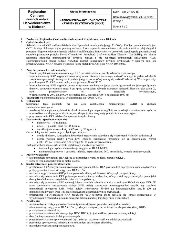 Regionalne Centrum Krwiodawstwa i Krwiolecznictwa w Kielcach Ulotka informacyjna SOP – Exp 2.15/A-16 Data obowiązywania: 21.04.2014r NAPROMIENIOWANY KONCENTRAT KRWINEK PŁYTKOWYCH (NKKP) Wersja 1 Strona 1 z 2 1. 2. Producent: Regionalne Centrum Krwiodawstwa i Krwiolecznictwa w Kielcach Opis składnika krwi: Składnik stanowi KKP poddany działaniu dawki promieniowania jonizującego 25÷50 Gy. Źródłem promieniowania jest Cs137. Zabiegu dokonuje się za pomocą radiatora, który zapewnia równomierne rozłożenie dawki w całej objętości preparatu. Napromieniowanie hamuje zdolność proliferacyjną limfocytów, co umożliwia zapobieganie potransfuzyjnej chorobie przeszczep przeciw biorcy (Transfusion Associated Graft-versus-Host Disease - TA-GvHD), nie obniża natomiast zdolności immunogennych krwinek białych i nie zapobiega immunizacji antygenami HLA. Napromieniowaniu można poddać wszystkie rodzaje koncentratów krwinek płytkowych w każdym dniu ich przechowywania. NKKP zawiera wyjściową liczbę płytek krwi. Objętość NKKP 250-340ml. 3. Przechowywanie i termin ważności: Termin przydatności napromieniowanego KKP pozostaje taki sam, jak dla składnika wyjściowego. Napromieniowany KKP wyprodukowany w systemie otwartym zachowuje ważność w ciągu 6 godzin od chwili zakończenia preparatyki (na etykiecie podana jest godzina, w której kończy się ważność składnika). W razie potrzeby przechowywać Zl. KKP w mieszadle, w temperaturze 20 do 24° C. Napromieniowany KKP wyprodukowany w systemie zamkniętym (przy użyciu zgrzewarki do jałowego łączenia drenów), zachowuje ważność przez 5 dni (przy czym dzień pobrania najstarszej jednostki liczy się jako dzień 0), jeżeli przechowywany jest w mieszadle horyzontalnym, w temperaturze od 20°C do 24°C, w pojemniku tzw. „oddychającym" o pojemności 1000 ml. Transport: w pojemniku z izolacją, w temperaturze od +20 do +24 C. Wskazania: Stosowanie tego preparatu ma na celu zapobieganie potransfuzyjnej GvHD u chorych z małopłytkowością oraz: wrodzoną lub nabytą niewydolnością układu immunologicznego szczególnie do transfuzji wewnątrzmacicznych i u noworodków z niską wagą urodzeniową oraz dla pacjentów otrzymujących leki immunosupresyjne, przy przetaczaniu KKP od dawców spokrewnionych z biorcą. Dawkowanie i sposób przetaczania: niemowlęta – 10 ml/kg m.c. dzieci – 1 j. około 60ml /10÷15 kg m.c. dorośli – jednorazowo 4÷6 j. KKP (ok. 1 j./10 kg m.c.) Ocena efektywności przetaczanych płytek opiera się na: ocenie klinicznej, tj. ustąpieniu krwawień i zaprzestaniu pojawiania się wybroczyn i wylewów podskórnych ocenie wzrostu liczby płytek krwi chorego (najczęściej przyjmuje się za zadawalający wzrost o 10×109/l po 1 godz., albo o 5x109/l po 20÷24 godz. od przetoczenia). Brak potransfuzyjnego efektu wzrostu płytek może wynikać z przyczyn: immunologicznych – allolmunizacja antygenami HLA lub HPA nieimmunologicznych – gorączka, infekcja, hypersplenizm, DIC, krwawienie, leczenie amfoterycyną B. Przeciwwskazania: alloimunizacja antygenami HLA (chyba że napromieniowaniu poddany zostanie UKKP), różnego typu nadwrażliwości na białka osocza. Środki ostrożności podczas stosowania: przetaczanie KKP chorym zimmunizowanym antygenami HLA / HPA powinno być poprzedzone doborem dawców i próbą zgodności w zakresie antygenów HLA / HPA, nie zaleca się przetaczania KKP pobranego metodą aferezy od dawców, którzy są krewnymi biorcy, nie zaleca się przetaczania KKP pobranego metodą aferezy od dawców, którzy zostali wytypowani jako potencjalni dawcy komórek macierzystych lub szpiku dla danego biorcy, nie zaleca się przetaczania RhD ujemnej dziewczynce lub kobiecie w wieku rozrodczym RhD dodatniego KKP. W razie konieczności zastosowania takiego KKP, należy zastosować immunoglobulinę anty-D, aby zapobiec immunizacji antygenem RhD. Podać należy jednorazowo 50÷100 µg immunoglobuliny anty-D (20 µg immunoglobuliny anty-D na 1 ml przetoczonych Rh dodatnich krwinek czerwonych), przetoczenie Rh(D)-dodatnich KKP pacjentom Rh(D)-ujemnym może odbywać się jedynie sporadycznie, w wyjątkowych wypadkach a pisemne polecenie dokonania takiej transfuzji musi wydać lekarz. Powikłania: niehemolityczne reakcje poprzetoczeniowe (głównie dreszcze, gorączka, pokrzywka - rzadko). alloimmunizacja antygenami HLA i HPA (ryzyko jest mniejsze, jeśli zastosuje się ubogoleukocytarny KKP), przeniesienie zakażenia kiłą, przeniesienie zakażenia wirusowego (np. HCV, HIV itp.) - jest możliwe, pomimo starannej selekcji dawców i wykonywania badań przesiewowych, przeniesienie zakażenia pierwotniakami (np. malarią) - może wystąpić w rzadkich przypadkach, posocznica spowodowana mimowolnym zakażeniem bakteryjnym składnika, małopłytkowa plamica poprzetoczeniowa, 4. 5. 6. 7. 8. 9. Regionalne Centrum Krwiodawstwa i Krwiolecznictwa w Kielcach Ulotka informacyjna SOP – Exp 2.15/A-16 Data obowiązywania: 21.04.2014r NAPROMIENIOWANY KONCENTRAT KRWINEK PŁYTKOWYCH (NKKP) Wersja 1 Strona 2 z 2 poprzetoczeniowa ostra niewydolność oddechowa (TRALI), przeniesienie zakażenia innymi czynnikami zakaźnymi, które nie są badane lub rozpoznane, 10.. Oznakowanie: zgodnie z międzynarodowym standardem ISBT 128