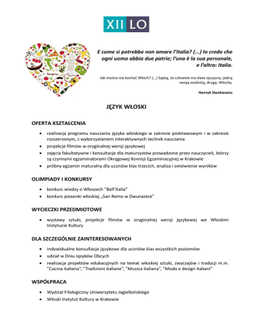 E come si potrebbe non amare l’Italia? (...) Io credo che ogni uomo abbia due patrie; l’una è la sua personale, e l’altra: Italia. Jak można nie kochać Włoch? (…) Sądzę, że człowiek ma dwie ojczyzny; jedną swoją osobistą, drugą: Włochy. Henryk Sienkiewicz JĘZYK WŁOSKI OFERTA KSZTAŁCENIA realizacja programu nauczania języka włoskiego w zakresie podstawowym i w zakresie rozszerzonym, z wykorzystaniem interaktywnych technik nauczania projekcje filmów w oryginalnej wersji językowej zajęcia fakultatywne i konsultacje dla maturzystów prowadzone przez nauczycieli, którzy są czynnymi egzaminatorami Okręgowej Komisji Egzaminacyjnej w Krakowie próbny egzamin maturalny dla uczniów klas trzecich, analiza i omówienie wyników OLIMPIADY I KONKURSY konkurs wiedzy o Włoszech ”Bell’Italia” konkurs piosenki włoskiej „San Remo w Dwunastce” WYCIECZKI PRZEDMIOTOWE wystawy sztuki, projekcje filmów w oryginalnej wersji językowej we Włoskim Instytucie Kultury DLA SZCZEGÓLNIE ZAINTERESOWANYCH indywidualne konsultacje językowe dla uczniów klas wszystkich poziomów udział w Dniu Języków Obcych realizacja projektów edukacyjnych na temat włoskiej sztuki, zwyczajów i tradycji m.in. ”Cucina italiana”, ”Tradizioni italiane”, ”Musica italiana”, ”Moda e design italiani” WSPÓŁPRACA Wydział Filologiczny Uniwersytetu Jagiellońskiego Włoski Instytut Kultury w Krakowie