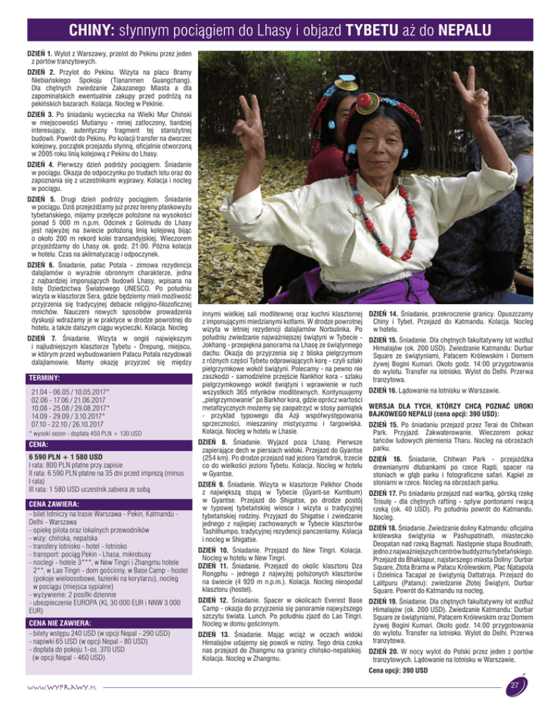 CHINY: słynnym pociągiem do Lhasy i objazd TYBETU aż do NEPALU DZIEŃ 1. Wylot z Warszawy, przelot do Pekinu przez jeden z portów tranzytowych. DZIEŃ 2. Przylot do Pekinu. Wizyta na placu Bramy Niebiańskiego Spokoju (Tiananmen Guangchang). Dla chętnych zwiedzanie Zakazanego Miasta a dla zapominalskich ewentualnie zakupy przed podróżą na pekińskich bazarach. Kolacja. Nocleg w Pekinie. DZIEŃ 3. Po śniadaniu wycieczka na Wielki Mur Chiński w miejscowości Mutianyu - mniej zatłoczony, bardziej interesujący, autentyczny fragment tej starożytnej budowli. Powrót do Pekinu. Po kolacji transfer na dworzec kolejowy, początek przejazdu słynną, oficjalnie otworzoną w 2005 roku linią kolejową z Pekinu do Lhasy. DZIEŃ 4. Pierwszy dzień podróży pociągiem. Śniadanie w pociągu. Okazja do odpoczynku po trudach lotu oraz do zapoznania się z uczestnikami wyprawy. Kolacja i nocleg w pociągu. DZIEŃ 5. Drugi dzień podróży pociągiem. Śniadanie w pociągu. Dziś przejeżdżamy już przez tereny płaskowyżu tybetańskiego, mijamy przełęcze położone na wysokości ponad 5 000 m n.p.m. Odcinek z Golmudu do Lhasy jest najwyżej na świecie położoną linią kolejową bijąc o około 200 m rekord kolei transandyjskiej. Wieczorem przyjeżdżamy do Lhasy ok. godz. 21:00. Późna kolacja w hotelu. Czas na aklimatyzację i odpoczynek. DZIEŃ 6. Śniadanie, pałac Potala - zimowa rezydencja dalajlamów o wyraźnie obronnym charakterze, jedna z najbardziej imponujących budowli Lhasy, wpisana na listę Dziedzictwa Światowego UNESCO. Po południu wizyta w klasztorze Sera, gdzie będziemy mieli możliwość przyjrzenia się tradycyjnej debacie religijno-filozoficznej mnichów. Nauczeni nowych sposobów prowadzenia dyskusji wdrażamy je w praktyce w drodze powrotnej do hotelu, a także dalszym ciągu wycieczki. Kolacja. Nocleg DZIEŃ 7. Śniadanie. Wizyta w ongiś największym i najludniejszym klasztorze Tybetu - Drepung, miejscu, w którym przed wybudowaniem Pałacu Potala rezydowali dalajlamowie. Mamy okazję przyjrzeć się między TERMINY: 21.04 - 06.05 / 10.05.2017* 02.06 - 17.06 / 21.06.2017 10.08 - 25.08 / 29.08.2017* 14.09 - 29.09 / 3.10.2017* 07.10 - 22.10 / 26.10.2017 * wysoki sezon - dopłata 450 PLN + 130 USD CENA: 6 590 PLN + 1 580 USD I rata: 800 PLN płatne przy zapisie II rata: 6 590 PLN płatne na 35 dni przed imprezą (minus I rata) III rata: 1 580 USD uczestnik zabiera ze sobą CENA ZAWIERA: - bilet lotniczy na trasie Warszawa - Pekin, Katmandu Delhi - Warszawa - opiekę pilota oraz lokalnych przewodników - wizy: chińska, nepalska - transfery lotnisko - hotel - lotnisko - transport: pociąg Pekin - Lhasa, mikrobusy - noclegi - hotele 3***, w New Tingri i Zhangmu hotele 2**, w Lao Tingri - dom gościnny, w Base Camp - hostel (pokoje wieloosobowe, łazienki na korytarzu), nocleg w pociągu (miejsca sypialne) - wyżywienie: 2 posiłki dziennie - ubezpieczenie EUROPA (KL 30 000 EUR i NNW 3 000 EUR) CENA NIE ZAWIERA: - bilety wstępu 240 USD (w opcji Nepal - 290 USD) - napiwki 65 USD (w opcji Nepal - 80 USD) - dopłata do pokoju 1-os. 370 USD (w opcji Nepal - 460 USD) innymi wielkiej sali modlitewnej oraz kuchni klasztornej z imponującymi miedzianymi kotłami. W drodze powrotnej wizyta w letniej rezydencji dalajlamów Norbulinka. Po południu zwiedzanie najważniejszej świątyni w Tybecie Jokhang - przepiękna panorama na Lhasę ze świątynnego dachu. Okazja do przyjrzenia się z bliska pielgrzymom z różnych części Tybetu odprawiających korę - czyli szlaki pielgrzymkowe wokół świątyni. Polecamy - na pewno nie zaszkodzi - samodzielne przejście Nankhor kora - szlaku pielgrzymkowego wokół świątyni i wprawienie w ruch wszystkich 365 młynków modlitewnych. Kontynuujemy „pielgrzymowanie” po Barkhor kora, gdzie oprócz wartości metafizycznych możemy się zaopatrzyć w stosy pamiątek - przykład typowego dla Azji współwystępowania sprzeczności, mieszaniny mistycyzmu i targowiska. Kolacja. Nocleg w hotelu w Lhasie. DZIEŃ 14. Śniadanie, przekroczenie granicy. Opuszczamy Chiny i Tybet. Przejazd do Katmandu. Kolacja. Nocleg w hotelu. DZIEŃ 15. Śniadanie. Dla chętnych fakultatywny lot wzdłuż Himalajów (ok. 200 USD). Zwiedzanie Katmandu: Durbar Square ze świątyniami, Pałacem Królewskim i Domem żywej Bogini Kumari. Około godz. 14:00 przygotowania do wylotu. Transfer na lotnisko. Wylot do Delhi. Przerwa tranzytowa. DZIEŃ 16. Lądowanie na lotnisku w Warszawie. WERSJA DLA TYCH, KTÓRZY CHCĄ POZNAĆ UROKI BAJKOWEGO NEPALU (cena opcji: 390 USD): DZIEŃ 15. Po śniadaniu przejazd przez Terai do Chitwan Park. Przyjazd. Zakwaterowanie. Wieczorem pokaz tańców ludowych plemienia Tharu. Nocleg na obrzeżach DZIEŃ 8. Śniadanie. Wyjazd poza Lhasę. Pierwsze parku. zapierające dech w piersiach widoki. Przejazd do Gyantse (254 km). Po drodze przejazd nad jezioro Yamdrok, trzecie DZIEŃ 16. Śniadanie, Chitwan Park - przejażdżka co do wielkości jezioro Tybetu. Kolacja. Nocleg w hotelu drewnianymi dłubankami po rzece Rapti, spacer na w Gyantse. słoniach w głąb parku i fotograficzne safari. Kąpiel ze słoniami w rzece. Nocleg na obrzeżach parku. DZIEŃ 9. Śniadanie. Wizyta w klasztorze Pelkhor Chode z największą stupą w Tybecie (Gyant-se Kumbum) DZIEŃ 17. Po śniadaniu przejazd nad wartką, górską rzekę w Gyantse. Przejazd do Shigatse, po drodze postój Trisulę - dla chętnych rafting - spływ pontonami rwącą w typowej tybetańskiej wiosce i wizyta u tradycyjnej rzeką (ok. 40 USD). Po południu powrót do Katmandu. tybetańskiej rodziny. Przyjazd do Shigatse i zwiedzanie Nocleg. jednego z najlepiej zachowanych w Tybecie klasztorów DZIEŃ 18. Śniadanie. Zwiedzanie doliny Katmandu: oficjalna Tashilhumpo, tradycyjnej rezydencji panczenlamy. Kolacja królewska świątynia w Pashupatinath, miasteczko i nocleg w Shigatse. Deopatan nad rzeką Bagmati. Następnie stupa Boudinath, DZIEŃ 10. Śniadanie. Przejazd do New Tingri. Kolacj