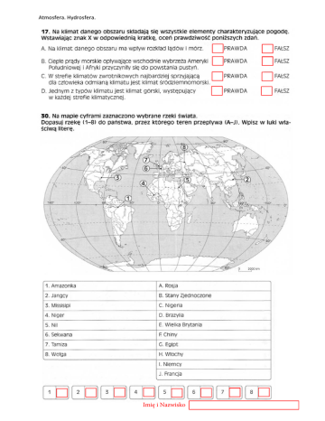 Atmosfeera. Hydrosfeera. 17. Na klimat danego obsza ru sk ladają się wSzystkie elementy Charakteryzujące znak X w odpowiednią kratkę , oceli prawdziwość pon iż szyc h zdań. PogOdę . Wstawiając A. Na kli mat danego obsza ru ma wplyw rozklad lądÓw i mórz. B. Cieple prądy morskie oplywające wschodnie wybr.,eia Ameryki Poludniowej i Afryki przyczynily się do powstania pustyr'l. C. W strefie klimatów zwrotnikowych najbardziej sprzyjającą dla czlowleka Od m ianą klimatu jest klimat śródziemnomorski . D. Jednym z typów klimatu j est klimat górski. wystl,puJący w kaidej strefie klimatYCznej. 30. Na mapie cyframi zaznaczono wybrane rzeki Dopasuj rzekę 11-8) do państwa . D PRAWDA D PRAWDA D PRAWDA D PRAWDA D FAŁSZ D FAŁSZ D FAŁSZ D FAŁSZ świata . przez którego teren przeplywa IA-JI. Wpisz w luki wla- ~ciwą literę . 1. Amazonka A. Rosja 2. Jangcy B. Stany ZjednOCzone 3. Missisipi C. Nigeria 4. Niger D. Brazylia 5. Nil E. Wielka Brytania 6. Sekwana F. Chiny 7. Tam iza G. Egipt 8. Wołga H. WIOchy I. Niemcy J. Francja Imię i Nazwisko 15. Wstawiając znak X w odpowiednią kratkę . oceń praw dz iwosć poniższych zdań . D PRAWDA D PRAWDA D PRAWDA D PRAWDA A. Klimat Jest związany z dlugoscią geog"'ficzn• . bo od nieJ za l eży kąt padania promieni słonec z nych . B. Klimat zależy od wysokośc i danego miejsca nad poziomem morza. C. Na klimat danegO obszaru w pływa O dleg lOSć Od mórz i oceanów. D. Czynn ikami klimatotwOrczym i są przebieg i temperatura p rądÓw morskich. D FAŁSZ D FAŁSZ D FAŁSZ D FAŁSZ Zadanie 2. Oceń, które zdania są prawdziwe, o które fałszywe, wpisując x w odpowiedniej kolumnie. Fał sz Prawda 1. Niż baryczny to 2. Kondensacjo to ukłod izobar, przejście 3 . Jeziora rel iktowe to 4. W okresie jury no w którym wody ze slonu ciek/ego pozosiałości materiału w ku środkow i . gazowy. po dawnych morzach. świecie dominowały 5. W wyn iku aku mulacj i ciśnienie rośnie dinozaury. skalnego powstają kanion y. Zadanie 20 . cie ~ły • • /\ /\ chłodny ZjClwiska meteorologiczne: o deszcz 9 mżowko V opad pr:zelotny * śnieg R bur:z(l = mg lo Obszar opadów ciągłych : Wielkoś~ zachmur:zen io: (! 4/ 10 101 7_8/ 10 (tS/ lO 0 9/l0 . 10/1 0 Wiatr i jego ~rędkości : 0-' 0,5 m/s Q-, l m/ s o-, o--l - 2,5 m/ s 5 m/ s kierunek wiatru Na podstawie mapy synoptycznej odpowiedz no pyta nia. A. Jak nazywa się układ ciśnien i a nad środkowym Bohykiem? B. Jaka jest wartość ciśnienia w Helsinkach? Imię i Nazwisko Imię i Nazwisko Imię i Nazwisko