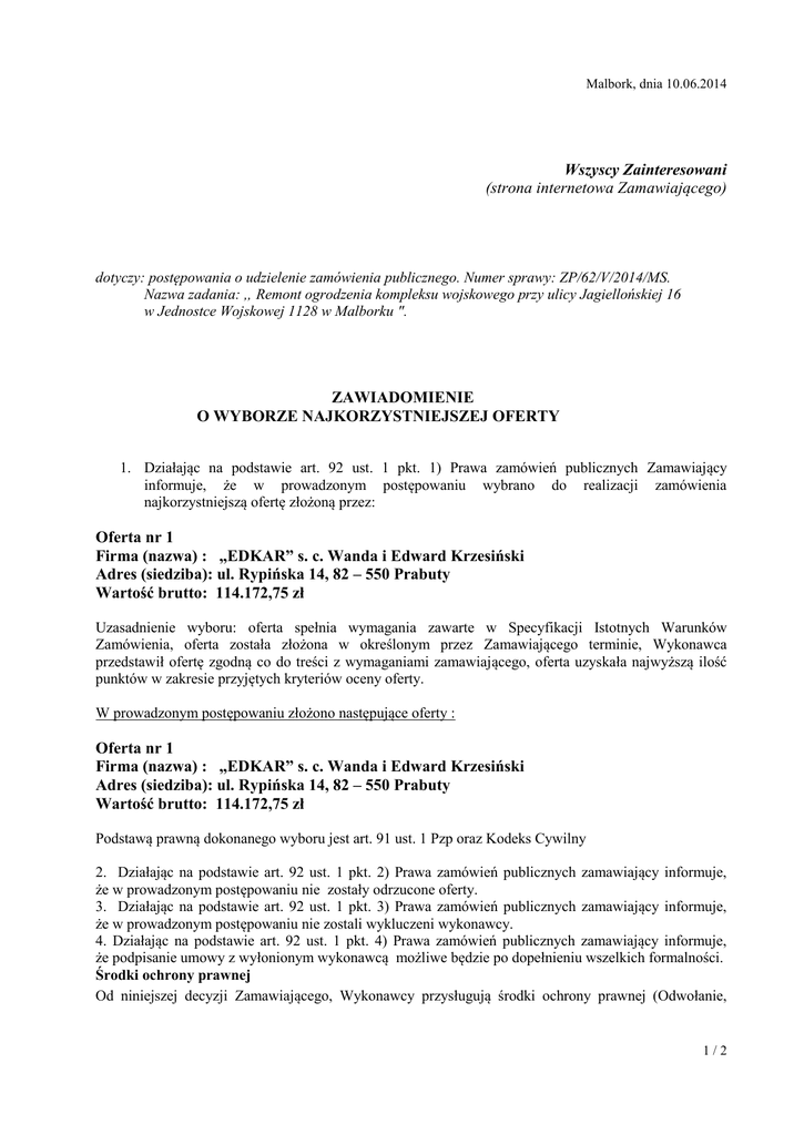 Malbork, dnia 10.06.2014 Wszyscy Zainteresowani (strona internetowa Zamawiającego) dotyczy: postępowania o udzielenie zamówienia publicznego. Numer sprawy: ZP/62/V/2014/MS. Nazwa zadania: ,, Remont ogrodzenia kompleksu wojskowego przy ulicy Jagiellońskiej 16 w Jednostce Wojskowej 1128 w Malborku ". ZAWIADOMIENIE O WYBORZE NAJKORZYSTNIEJSZEJ OFERTY 1. Działając na podstawie art. 92 ust. 1 pkt. 1) Prawa zamówień publicznych Zamawiający informuje, że w prowadzonym postępowaniu wybrano do realizacji zamówienia najkorzystniejszą ofertę złożoną przez: Oferta nr 1 Firma (nazwa) : „EDKAR” s. c. Wanda i Edward Krzesiński Adres (siedziba): ul. Rypińska 14, 82 – 550 Prabuty Wartość brutto: 114.172,75 zł Uzasadnienie wyboru: oferta spełnia wymagania zawarte w Specyfikacji Istotnych Warunków Zamówienia, oferta została złożona w określonym przez Zamawiającego terminie, Wykonawca przedstawił ofertę zgodną co do treści z wymaganiami zamawiającego, oferta uzyskała najwyższą ilość punktów w zakresie przyjętych kryteriów oceny oferty. W prowadzonym postępowaniu złożono następujące oferty : Oferta nr 1 Firma (nazwa) : „EDKAR” s. c. Wanda i Edward Krzesiński Adres (siedziba): ul. Rypińska 14, 82 – 550 Prabuty Wartość brutto: 114.172,75 zł Podstawą prawną dokonanego wyboru jest art. 91 ust. 1 Pzp oraz Kodeks Cywilny 2. Działając na podstawie art. 92 ust. 1 pkt. 2) Prawa zamówień publicznych zamawiający informuje, że w prowadzonym postępowaniu nie zostały odrzucone oferty. 3. Działając na podstawie art. 92 ust. 1 pkt. 3) Prawa zamówień publicznych zamawiający informuje, że w prowadzonym postępowaniu nie zostali wykluczeni wykonawcy. 4. Działając na podstawie art. 92 ust. 1 pkt. 4) Prawa zamówień publicznych zamawiający informuje, że podpisanie umowy z wyłonionym wykonawcą możliwe będzie po dopełnieniu wszelkich formalności. Środki ochrony prawnej Od niniejszej decyzji Zamawiającego, Wykonawcy przysługują środki ochrony prawnej (Odwołanie, 1/2 Skarga do Sądu) wobec czynności: 1) wykluczenia wykonawcy z postępowania o udzielenie zamówienia; 2) odrzucenia oferty wykonawcy W pozostałych przypadkach odwołanie nie przysługuje. Wykonawca może w terminie przewidzianym do wniesienia odwołania poinformować Zamawiającego o: 1) niezgodnej z przepisami ustawy czynności podjętej przez Zamawiającego w niniejszym postępowaniu, lub 2) zaniechania czynności, do której Zamawiający jest zobowiązany na podstawie ustawy, na które nie przysługuje w niniejszym postępowaniu odwołanie. Termin wniesienia odwołania: 5 dni od dnia przesłania niniejszego zawiadomienia faksem lub drogą elektroniczną, lub 10 dni od dnia przesłania niniejszego zawiadomienia, jeżeli zostało ono przesłane pisemnie. Informacje dotyczące środków ochrony prawnej znajdują się Specyfikacji istotnych warunków zamówienia oraz w Dziale VI Prawa zamówień publicznych „Środki ochrony prawnej", art. od 179 do 198g (t. j. Dz. U. z 2013 r. poz. 907 z p. zm.). DOWÓDCA Sprawdził: J. Narloch Wykonano w 3 egz.: Egz. nr 1 – ad acta (T:13/10) Egz. nr 2 – adresat Egz. nr 3 – Kancelaria jawna Wyk.: M. Sikorska ( tel. 55 620 67 89) Dostęp do dokumentu: Sekcja Zamówień Publicznych 2/2