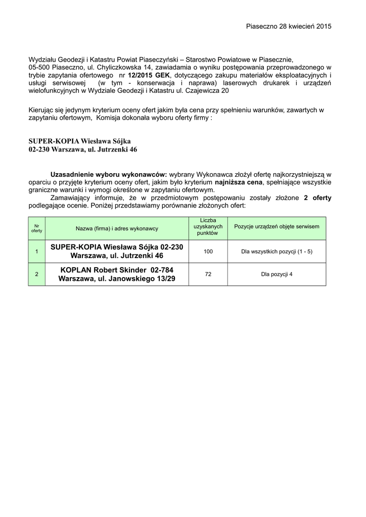 Piaseczno 28 kwiecień 2015 Wydziału Geodezji i Katastru Powiat Piaseczyński – Starostwo Powiatowe w Piasecznie, 05-500 Piaseczno, ul. Chyliczkowska 14, zawiadamia o wyniku postępowania przeprowadzonego w trybie zapytania ofertowego nr 12/2015 GEK, dotyczącego zakupu materiałów eksploatacyjnych i usługi serwisowej (w tym - konserwacja i naprawa) laserowych drukarek i urządzeń wielofunkcyjnych w Wydziale Geodezji i Katastru ul. Czajewicza 20 Kierując się jedynym kryterium oceny ofert jakim była cena przy spełnieniu warunków, zawartych w zapytaniu ofertowym, Komisja dokonała wyboru oferty firmy : SUPER-KOPIA Wiesława Sójka 02-230 Warszawa, ul. Jutrzenki 46 Uzasadnienie wyboru wykonawców: wybrany Wykonawca złożył ofertę najkorzystniejszą w oparciu o przyjęte kryterium oceny ofert, jakim było kryterium najniższa cena, spełniające wszystkie graniczne warunki i wymogi określone w zapytaniu ofertowym. Zamawiający informuje, że w przedmiotowym postępowaniu zostały złożone 2 oferty podlegające ocenie. Poniżej przedstawiamy porównanie złożonych ofert: Nr oferty Nazwa (firma) i adres wykonawcy Liczba uzyskanych punktów Pozycje urządzeń objęte serwisem 1 SUPER-KOPIA Wiesława Sójka 02-230 Warszawa, ul. Jutrzenki 46 100 Dla wszystkich pozycji (1 - 5) 2 KOPLAN Robert Skinder 02-784 Warszawa, ul. Janowskiego 13/29 72 Dla pozycji 4