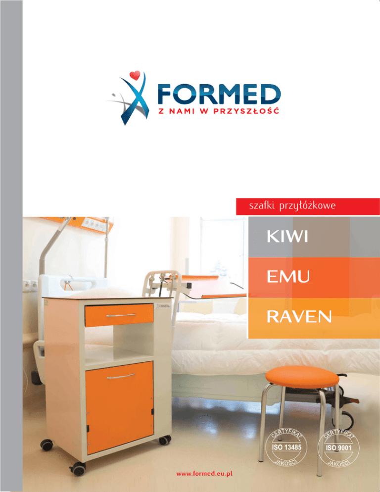 KIWI, KIWI PLUS Szafka przyłóżkowa KIWI oraz KIWI PLUS stanowi podstawowe wyposażenie sal chorych lub domów opieki. Jest bardzo prosta w obsłudze a dodatkowy blat boczny (KIWI PLUS) znacznie zwiększa komfort i wygodę użytkowania. Szafka KIWI posiada możliwość doposażenia jej w blat boczny już w trakcie użytkowania w prosty, niewymagający specjalistycznych narzędzi sposób. Blat boczny można przekładać na prawą lub lewą stronę szafki. W celu zwiększenia funkcjonalności blat boczny posiada funkcję bezstopniowej regulacji wysokości oraz regulację przechyłu bocznego realizowaną stopniowo do 30° lub do 60°. Konstrukcja szafki wykonana jest z blachy ocynkowanej stalowej, rurek metalowych i profili stalowych pokrytych lakierem proszkowym epoksydowym, odpornym na mycie, dezynfekcję szpitalną oraz promieniowanie UV. Blaty szafki wykonane są z płyty meblowej a opcjonalnie z płyty HPL. Szuflada posiada wysuw na prowadnicach rolkowych i jest wyposażona w dzielony wkład tworzywowy z możliwością jego wyjęcia do mycia i dezynfekcji, a drzwiczki posiadają mechanizm domykający z magnetycznym zatrzaskiem. Do otwierania drzwiczek oraz szuflady służą tworzywowe lub chromowane, zaokrąglone uchwyty. Szafka jest mobilna dzięki czterem podwójnym, tworzywowym kołom niebrudzącym podłoża, z których dwa posiadają blokadę. Dodatkowe piąte koło (KIWI PLUS) zwiększa mobilność i stabilność szafki przy rozłożonym blacie bocznym. Na tylnej ściance znajdują się haczyki do zawieszania ręczników. W opcji szafka może posiadać dolną półkę przeznaczoną na, obuwie lub inne podręczne rzeczy pacjenta oraz kosz na butelki montowany z boku szafki. Istnieje możliwość wyboru kolorystyki lakieru drzwiczek i czoła szuflad z wzornika kolorystyki FORMED. KIWI PLUS DANE TECHNICZNE: Szerokość całkowita szafki: 420 mm Szerokość całkowita szafki z podporą pod blat: 630 mm (KIWI PLUS) Głębokość całkowita: 430 mm Szerokość x głębokość blatu bocznego: 530 x 340 mm (KIWI PLUS) Wysokość: 820 mm Regulacja wysokości blatu bocznego: 800 do 1200 mm (KIWI PLUS) Średnica kół jezdnych: 50 mm Zastrzega się możliwość modyfikacji wyrobu w wyniku postępu technicznego i indywidualnych wymagań klienta. Wyrób medyczny spełnia wymogi bezpieczeństwa zgodnie z Dyrektywą Europejską 93/42/EEC oraz Ustawą o wyrobach medycznych. KIWI PLUS KIWI Kolorystyka (szafki Emu, Emu Plus, Kiwi, Kiwi Plus) Elementy metalowe szafek pokryte są standardowo lakierem proszkowym w kolorze RAL 9002. Czoła drzwiczek i szuflad lakierowane są według standardowej, podanej niżej kolorystyki. Biały Granatowy Szary Beżowy Seledynowy Łososiowy Niebieski Turkusowy Kolory prezentowane w katalogu mogą nieznacznie odbiegać od rzeczywistości z przyczyn drukarsko-technicznnych. 22 www.formed.eu.pl EMU, EMU PLUS Szafka przyłóżkowa EMU oraz EMU PLUS przeznaczona jest do przechowywania rzeczy osobistych pacjentów na wszystkich oddziałach szpitalnych. Zastosowane rozwiązania konstrukcyjne w postaci dwustronnie wysuwanej szuflady oraz podwójnych drzwiczek stanowią o jej uniwersalności i umożliwiają ustawianie z lewej lub prawej strony łóżka. Konstrukcja szafki wykonana jest z profili stalowych i blachy stalowej ocynkowanej pokrytych lakierem proszkowym epoksydowym odpornym na mycie, dezynfekcję szpitalną oraz promieniowanie UV. Szafka EMU PLUS posiada dodatkowy blat boczny z bezstopniową regulacją wysokości realizowaną przy pomocy sprężyny gazowej oraz funkcję przechyłu bocznego do 30° lub do 60°. Blat boczny jest składany do wnęki z boku szafki dzięki czemu nie wystaje poza gabaryty zewnętrzne szafki. Blaty szafki wykonane są z płyty HPL lub termoformowanego tworzywa ABS. Szafka EMU nie posiada blatu bocznego – za to posiada wnękę z tworzywowym dwupoziomowym wkładem i zabezpieczeniem poprzez pręty przed wypadaniem przedmiotów. Wkład ten służy do przechowywania butelek, gazet lub innych podręcznych rzeczy pacjenta. Drzwiczki szafki wyposażone są w zawiasy z funkcją samodomykania. Blaty szafki wykonane są z płyty HPL odpornej na mycie i dezynfekcję. Opcjonalnie mogą być wykonane z tworzywa ABS. Szuflada szafki wyposażona jest w tworzywowy dzielony wkład z możliwością jego wyjęcia do mycia i dezynfekcji. Szafka jest mobilna dzięki czterem, tworzywowym, podwójnym kołom, niebrudzącym podłoża, z których dwa posiadają blokadę. Do otwierania drzwiczek lub szuflady służą chromowane zaokrąglone uchwyty. W opcji szafka może posiadać dolną półkę na obuwie lub inne podręczne rzeczy pacjenta, kosz na butelki montowany z boku szafki oraz poziomą wyjmowaną półkę dzielącą wnętrze na dwie części. Istnieje możliwość wyboru kolorystyki lakieru drzwiczek i czoła szuflad z wzornika kolorystyki FORMED. EMU PLUS EMU DANE TECHNICZNE: Szerokość całkowita: 510 mm Głębokość całkowita: 400 mm Szerokość x głębokość blatu bocznego: 590 x 340 mm (EMU PLUS) Regulacja wysokości blatu bocznego: 740 do 1040 mm (EMU PLUS) Wysokość szafki : 840 mm Obciążenie blatu stałego: 20 kg Obciążenie blatu bocznego: 5 kg (EMU PLUS) Średnica kół jezdnych: 50 mm EMU Zastrzega się możliwość modyfikacji wyrobu w wyniku postępu technicznego i indywidualnych wymagań klienta. Wyrób medyczny spełnia wymogi bezpieczeństwa zgodnie z Dyrektywą Europejską 93/42/EEC oraz Ustawą o wyrobach medycznych. www.formed.eu.pl 33 RAVEN, RAVEN PLUS Szafka przyłóżkowa RAVEN wykonana jest z płyty meblowej i przeznaczona jest do wyposażania domów opieki lub zakładów opiekuńczo-leczniczych. Szafka RAVEN PLUS posiada blat boczny z bezstopniową regulacją wysokości realizowaną przy pomocy sprężyny gazowej oraz funkcją przechyłu bocznego do 30° lub do 60°. Blat ten może być złożony do wnęki z boku szafki dzięki czemu nie wystaje poza gabaryty zewnętrzne szafki. Szafka RAVEN nie posiada blatu bocznego, z