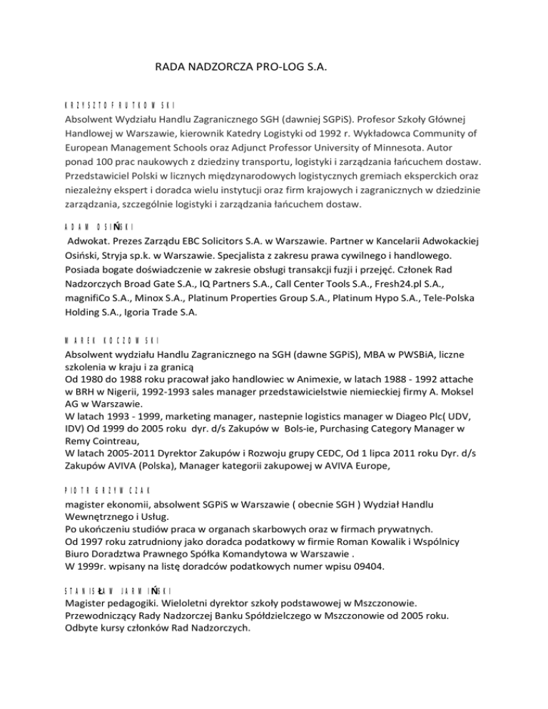 RADA NADZORCZA PRO-LOG S.A. KRZYSZTOF RUTKOWSKI Absolwent Wydziału Handlu Zagranicznego SGH (dawniej SGPiS). Profesor Szkoły Głównej Handlowej w Warszawie, kierownik Katedry Logistyki od 1992 r. Wykładowca Community of European Management Schools oraz Adjunct Professor University of Minnesota. Autor ponad 100 prac naukowych z dziedziny transportu, logistyki i zarządzania łańcuchem dostaw. Przedstawiciel Polski w licznych międzynarodowych logistycznych gremiach eksperckich oraz niezależny ekspert i doradca wielu instytucji oraz firm krajowych i zagranicznych w dziedzinie zarządzania, szczególnie logistyki i zarządzania łańcuchem dostaw. ADAM OSIŃSKI Adwokat. Prezes Zarządu EBC Solicitors S.A. w Warszawie. Partner w Kancelarii Adwokackiej Osiński, Stryja sp.k. w Warszawie. Specjalista z zakresu prawa cywilnego i handlowego. Posiada bogate doświadczenie w zakresie obsługi transakcji fuzji i przejęć. Członek Rad Nadzorczych Broad Gate S.A., IQ Partners S.A., Call Center Tools S.A., Fresh24.pl S.A., magnifiCo S.A., Minox S.A., Platinum Properties Group S.A., Platinum Hypo S.A., Tele-Polska Holding S.A., Igoria Trade S.A. MAREK KOCZOWSKI Absolwent wydziału Handlu Zagranicznego na SGH (dawne SGPiS), MBA w PWSBiA, liczne szkolenia w kraju i za granicą Od 1980 do 1988 roku pracował jako handlowiec w Animexie, w latach 1988 - 1992 attache w BRH w Nigerii, 1992-1993 sales manager przedstawicielstwie niemieckiej firmy A. Moksel AG w Warszawie. W latach 1993 - 1999, marketing manager, nastepnie logistics manager w Diageo Plc( UDV, IDV) Od 1999 do 2005 roku dyr. d/s Zakupów w Bols-ie, Purchasing Category Manager w Remy Cointreau, W latach 2005-2011 Dyrektor Zakupów i Rozwoju grupy CEDC, Od 1 lipca 2011 roku Dyr. d/s Zakupów AVIVA (Polska), Manager kategorii zakupowej w AVIVA Europe, PIOTR GRZYWCZAK magister ekonomii, absolwent SGPiS w Warszawie ( obecnie SGH ) Wydział Handlu Wewnętrznego i Usług. Po ukończeniu studiów praca w organach skarbowych oraz w firmach prywatnych. Od 1997 roku zatrudniony jako doradca podatkowy w firmie Roman Kowalik i Wspólnicy Biuro Doradztwa Prawnego Spółka Komandytowa w Warszawie . W 1999r. wpisany na listę doradców podatkowych numer wpisu 09404. STANISŁAW JARMIŃSKI Magister pedagogiki. Wieloletni dyrektor szkoły podstawowej w Mszczonowie. Przewodniczący Rady Nadzorczej Banku Spółdzielczego w Mszczonowie od 2005 roku. Odbyte kursy członków Rad Nadzorczych.