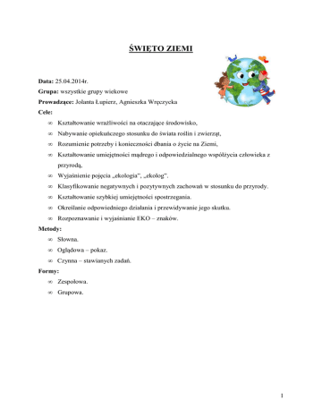 ŚWIĘTO ZIEMI Data: 25.04.2014r. Grupa: wszystkie grupy wiekowe Prowadzące: Jolanta Łupierz, Agnieszka Wręczycka Cele: • Kształtowanie wrażliwości na otaczające środowisko, • Nabywanie opiekuńczego stosunku do świata roślin i zwierząt, • Rozumienie potrzeby i konieczności dbania o życie na Ziemi, • Kształtowanie umiejętności mądrego i odpowiedzialnego współżycia człowieka z przyrodą, • Wyjaśnienie pojęcia „ekologia”, „ekolog”. • Klasyfikowanie negatywnych i pozytywnych zachowań w stosunku do przyrody. • Kształtowanie szybkiej umiejętności spostrzegania. • Określanie odpowiedniego działania i przewidywanie jego skutku. • Rozpoznawanie i wyjaśnianie EKO – znaków. Metody: • Słowna. • Oglądowa – pokaz. • Czynna – stawianych zadań. Formy: • Zespołowa. • Grupowa. 1 Przebieg 1. Powitanie wszystkich uczestników za pomocą zabawy: „Witam, tych którzy……. • Cieszą się z nadejściem wiosny, hip, hip – hura, • Bardzo kochają zwierzęta, • Szanują zieleń, • Nie łamią drzew i krzewów, • Nie hałasują w lesie, • Nie niszczą roślin, • Nie śmiecą wokoło, • Kochają przyrodę. 2. Wyjaśnienie, iż Ziemi też ma swoje święto. Co roku 22 kwietnia, na całym świecie obchodzony jest Międzynarodowy Dzień Ziemi. Tego dnia szczególnie powinniśmy pomyśleć o tym, jak chronić nasz wspólny dom – ZIEMIĘ! Warto zastanowić się, jak pomóc naszej planecie, aby ten wspólny dom był zdrowy, piękny i czysty. 3. „Pokaz Mody” – prezentacja strojów ekologicznych przez dzieci. 4. „List od Ziemi” – odczytanie listu, analiza jego treści. „KOCHANE DZIECI ! Piszę do Was i bardzo proszę , abyście z uwagą wysłuchali mojego listu. Właśnie trwa wiosna i po zimowym odpoczynku cała przyroda budzi się do życia. Niestety, są na świecie tacy ludzie, którzy o mnie nie dbają. Niszczą rośliny i zwierzęta, wycinają lasy, zatruwają powietrze, wodę i glebę, śmiecą i hałasują. Drzewa i ptaki skarżą się na zatrute powietrze, a ryby na brudną wodę. Każdy wyrzuca ogromne ilości śmieci. Trafiają one na olbrzymie śmietniska. Większość z nich rozkłada się kilkaset lat. To wszystko sprawia, że ja – Ziemia jestem coraz bardziej zanieczyszczona i chora. A czy wy, mali przyrodnicy potraficie o mnie dbać? Dzisiaj czeka na was specjalne zadanie. Będziecie odpowiadać na pytania jak o mnie dbać każdego dnia. Abym ja Ziemia miała powody do radości dbajcie o mnie dziennie tu, tam i wszędzie bezustannie. Pozdrawiam Was Wasza planeta Ziemia. 2 5. Wyjaśnienie słowa „EKOLOGIA” i „EKOLOG” Ekologia – mądre słowo, To nauka o zwierzętach, Lasach, rzekach i o ptakach. Wszystko co fruwa i co śpiewa, I to co pływa, rośnie i dojrzewa, Słońce, powietrze, ziemia, woda, to wszystko To jest nasze środowisko. Eko, eko, ekologia To higiena i biologia To ochrona czystej wody To działania dla przyrody. O te działania moi drodzy Zabiegają ekolodzy. 6. „Jakie to zwierzę” – każda z grup otrzymuje planszę pod którą ukryte jest zwierzątko. Nauczyciel kolejno odsłania fragmenty planszy, a zadaniem dzieci jest jak najszybciej odgadnąć jakie to zwierzę. 7. „Prawda, czy fałsz?” – jeśli zdanie jest prawdziwe to dzieci klaszczą, jeśli zdanie jest fałszywe wtedy dzieci buczą buzią. W lesie głośno krzyczymy, F Śmieci wyrzucamy, tam gdzie nam wygodnie, F Pojazd, który zanieczyszcza powietrze to rower, F Makulatura to stare gazety i niepotrzebne papiery, P Recykling to ponowne przetwarzanie zużytych rzeczy np. puszek, butelek, P Z przetworzonej makulatury powstają leki i buty, F Odpady to rzeczy do wyrzucenia, P 8. „TAK czy NIE”. Wspólne określanie pozytywnych i negatywnych zachowań dzieci na podstawie kolorowych ilustracji pokazywanych przez nauczyciela. Zadaniem dzieci jest przyporządkowanie pozytywnego zachowania do napisu „TAK”, negatywnego do napisu „NIE”. 9. „Teraz i później”. Omawianie odpowiedniego działania i przewidywanie jego skutku na podstawnie ilustracji (np. rozpalanie ogniska w lesie – pożar; kaleczenie drzew – drzewo usycha itp.). 3 10. „Słońce, wiatr, deszcz” – zabawa ruchowa. Kiedy nauczyciel wypowiada słowo: „słońce” – wszystkie dzieci unoszą ręce w górę i naśladują wkręcanie żarówki, „wiatr – dzieci unoszą ręce w górę i delikatnie wymachują w prawo i w lewo, „deszcz” – dzieci delikatnie uderzają palcami o podłogę. 11. „Znaki ekologiczne”. Nauczyciel pokazuje ilustracje najbardziej popularnych EKO – znaków, a zadaniem dzieci jest określenie ich znaczenia. 12. Rozwiązywanie zagadek o treści przyrodniczej. Czarno-biały fraczek, buciki czerwone, umykają żaby, gdy idzie w ich stronę. (BOCIAN) Choć nie jest kowalem, umie kuć wytrwale, choć nie jest doktorem, leczy drzewa chore. (DZIĘCIOŁ) Rudą kitką się chlubi, orzeszka bardzo lubi. (WIEWIÓRKA) Kradnie kury wprost z kurnika, potem chyłkiem się przemyka, zagonkami, polną drogą, czasem mignie rudy ogon. (LIS) Ma króciutkie nóżki i maleńki ryjek, chociaż igły nosi nigdy nic nie szyje. (JEŻ) 13. Przedstawienie i omówienie plakatów o tematyce ekologicznej przez każdą z grup. 14. Wspólne śpiewanie piosenki „KOCHAM ŚWIAT” 1. Pojedziemy dziś do lasu, zaśpiewamy kwiatom, drzewom, że kochamy je nad życie, nie zabraknie im niczego! Ref.: Bo choć mamy mało lat, kochamy tak bardzo świat i jeśli ma pięknie być, to musimy o to dbać, to musimy o to dbać, to musimy dobrzy być! 2. Posprzątamy dookoła, pozbieramy wszystkie śmieci, posadzimy więcej drzewek, niech im słońce mocno świeci. 4 Ref.: Bo choć mamy mało lat... 15. Złożenie przez dzieci „Ekologicznego ślubowania” Dzieci unoszą prawą rękę i ślubują powtarzając za nauczycielem: DZIŚ EKOLOGIA – MODNE SŁOWO PRZYRODĘ WSZYSCY CHCEMY MIEĆ ZDROWĄ JEJ PRZYJACIÓŁMI SIĘ OGŁASZAMY I OD 