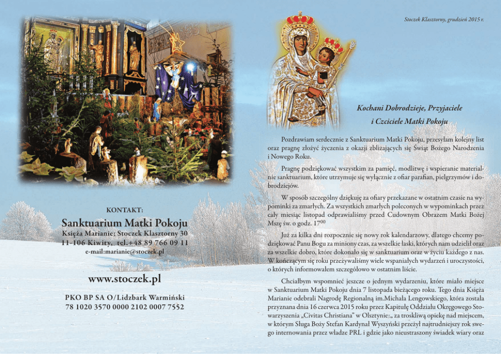Stoczek Klasztorny, grudzień 2015 r. Kochani Dobrodzieje, Przyjaciele i Czciciele Matki Pokoju Pozdrawiam serdecznie z Sanktuarium Matki Pokoju, przesyłam kolejny list oraz pragnę złożyć życzenia z okazji zbliżających się Świąt Bożego Narodzenia i Nowego Roku. Pragnę podziękować wszystkim za pamięć, modlitwę i wspieranie materialnie sanktuarium, które utrzymuje się wyłącznie z ofiar parafian, pielgrzymów i dobrodziejów. KONTAKT: Sanktuarium Matki Pokoju Księża Marianie; Stoczek Klasztorny 30 11-106 Kiwity, tel.+48 89 766 09 11 e-mail:[email protected] www.stoczek.pl PKO BP SA O/Lidzbark Warmiński 78 1020 3570 0000 2102 0007 7552 W sposób szczególny dziękuję za ofiary przekazane w ostatnim czasie na wypominki za zmarłych. Za wszystkich zmarłych poleconych w wypominkach przez cały miesiąc listopad odprawialiśmy przed Cudownym Obrazem Matki Bożej Mszę św. o godz. 1700 Już za kilka dni rozpocznie się nowy rok kalendarzowy, dlatego chcemy podziękować Panu Bogu za miniony czas, za wszelkie łaski, których nam udzielił oraz za wszelkie dobro, które dokonało się w sanktuarium oraz w życiu każdego z nas. W kończącym się roku przeżywaliśmy wiele wspaniałych wydarzeń i uroczystości, o których informowałem szczegółowo w ostatnim liście. Chciałbym wspomnieć jeszcze o jednym wydarzeniu, które miało miejsce w Sanktuarium Matki Pokoju dnia 7 listopada bieżącego roku. Tego dnia Księża Marianie odebrali Nagrodę Regionalną im.Michała Lengowskiego, która została przyznana dnia 16 czerwca 2015 roku przez Kapitułę Oddziału Okręgowego Stowarzyszenia „Civitas Christiana” w Olsztynie:„ za troskliwą opiekę nad miejscem, w którym Sługa Boży Stefan Kardynał Wyszyński przeżył najtrudniejszy rok swego internowania przez władze PRL i gdzie jako nieustraszony świadek wiary oraz gorący patriota, nieświadom faktu, że znajduje się pod czułym okiem Stoczkowskiej Matki Pokoju oddał się w Macierzyńską Niewolę Maryi, co było pierwszym krokiem w przygotowaniach Polski do obchodów Wielkiego Millenium Narodu Polskiego oraz za otwarcie na rodziny w duchu hasła Wielkiego Prymasa „Rodzina Bogiem silna”. Cieszymy się z przyznania nagrody, która jeszcze bardziej mobilizuje nas do troski o sanktuarium oraz propagowanie postaci i nauczania Prymasa Tysiąclecia. W ubiegłym roku, w liście przed Bożym Narodzeniem informowałem, że w tym roku planujemy wykonać dwie inwestycje: odnowienie balustrady wokół głównego ołtarza w bazylice oraz uzupełnienie elewacji zewnętrznej klasztoru. Cieszę się bardzo, że zaplanowane wcześniej remonty udało się w tym roku zrealizować. W ten sposób zostały zakończone dwie bardzo ważne inwestycje w sanktuarium: odnowienie elewacji budynku oraz odnowienie głównego ołtarza w stoczkowskiej bazylice. Chciałbym podziękować wszystkim dobrodziejom za wsparcie materialne na ten cel, bez którego nie bylibyśmy w stanie kontynuować i zakończyć rozpoczętych inwestycji. Chcielibyśmy jednak dalej kontynuować konieczne remonty i w przyszłym roku zaplanowaliśmy odnowić: dom pielgrzyma, który znajduje się w klasztorze na drugim piętrze i ławki w kościele. Podjęliśmy decyzję, aby jeszcze przed sezonem pielgrzymkowym odnowić wszystkie pokoje. Podłoga w każdym pokoju zostanie wycyklinowana, do każdego pokoju zostaną zakupione stoliki i krzesła, zainstalowany wieszak, lusterko i szafka na ubrania, zużyta i zniszczona pościel zostanie wymieniona i zakupione zostaną ręczniki. Uważam, że jest to inwestycja priorytetowa, gdyż chcemy godnie przyjąć pielgrzymów, którzy nawiedzają sanktuarium. Dlatego zwracam się do wszystkich przyjaciół i dobrodziejów sanktuarium z prośbą o wsparcie materialne na ten cel.Za każdą przysłaną ofiarę na renowację domu pielgrzyma będę bardzo wdzięczny i składam serdeczne podziękowanie. Na odnowienie ławek w bazylice będę prosił o materialną pomoc parafian i mam nadzieję, że wspólnymi siłami uda się w przyszłym roku dokonać tego dzieła. Moi Drodzy dnia 29 listopada rozpoczął się nowy rok liturgiczny, którego hasło brzmi: „Nowe życie w Chrystusie” i przypomina nam o łasce chrztu świętego i wielkiej godności dzieci Bożych, którą zostaliśmy obdarowani. Będzie to wyjątkowy rok w życiu Kościoła w naszej Ojczyźnie, ponieważ świętować będziemy 1050. rocznicę chrztu Polski, przeżywać Światowe Dni Młodzieży i papieską pielgrzymkę do Polski oraz czas Nadzwyczajnego Jubileuszu Miłosierdzia. Przed nami zatem: „rok liturgiczny pełen duchowych wyzwań. Niech będzie on dla każdej i każdego z nas rokiem prawdziwie błogosławionym. Niech będzie czasem wdzięczności wobec Boga za wspaniałą, ponad tysiącletnią tradycję chrześcijańską naszego narodu, czasem odnowienia przymierza z miłosiernym Bogiem i poddania się powszechnemu panowaniu Chrystusa Króla Wszechświata. Niech stanie się okazją do pogłębienia synowskich więzi z Bogarodzicą, Matką Kościoła i naszą Matką. Niech będzie czasem radosnej nadziei dla młodych, którzy podczas Światowych Dni Młodzieży w Krakowie spotkają się z Ojcem Świętym Franciszkiem” (List Pasterski Episkopatu Polski na Jubileusz 1050. lecia Chrztu Polski). Z okazji zbliżających się Świat Bożego Narodzenia i Nowego Roku wszystkim Dobrodziejom i Czcicielom Matki Pokoju składam serdeczne życzenia. Niech Chrystus, który przychodzi na świat obdarza wszystkich obfitym błogosławieństwem, a Matka Pokoju wyprasza potrzebne łaski. Do życzeń dołączam w darze Stoczkowski Kalendarz Matki Pokoju na 2016 rok. Do korespondencji załączam również druki z okazji Nowenny Eucharystycznej o Pokój odprawianej w sanktuarium od 1 do 9 stycznia 2016 roku. Przysłane intencje będziemy polecać Matce Pokoju podczas Mszy św. odprawianych w sanktuarium. Zapewniam wszystkich o mojej pamięci i modlitwie każdego dnia przed 