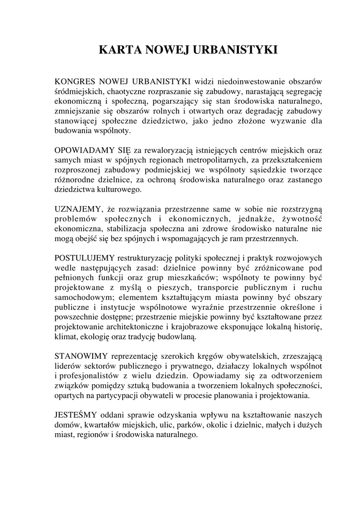 KARTA NOWEJ URBANISTYKI KONGRES NOWEJ URBANISTYKI widzi niedoinwestowanie obszarów śródmiejskich, chaotyczne rozpraszanie się zabudowy, narastającą segregację ekonomiczną i społeczną, pogarszający się stan środowiska naturalnego, zmniejszanie się obszarów rolnych i otwartych oraz degradację zabudowy stanowiącej społeczne dziedzictwo, jako jedno złożone wyzwanie dla budowania wspólnoty. OPOWIADAMY SIĘ za rewaloryzacją istniejących centrów miejskich oraz samych miast w spójnych regionach metropolitarnych, za przekształceniem rozproszonej zabudowy podmiejskiej we wspólnoty sąsiedzkie tworzące różnorodne dzielnice, za ochroną środowiska naturalnego oraz zastanego dziedzictwa kulturowego. UZNAJEMY, że rozwiązania przestrzenne same w sobie nie rozstrzygną problemów społecznych i ekonomicznych, jednakże, żywotność ekonomiczna, stabilizacja społeczna ani zdrowe środowisko naturalne nie mogą obejść się bez spójnych i wspomagających je ram przestrzennych. POSTULUJEMY restrukturyzację polityki społecznej i praktyk rozwojowych wedle następujących zasad: dzielnice powinny być zróżnicowane pod pełnionych funkcji oraz grup mieszkańców; wspólnoty te powinny być projektowane z myślą o pieszych, transporcie publicznym i ruchu samochodowym; elementem kształtującym miasta powinny być obszary publiczne i instytucje wspólnotowe wyraźnie przestrzennie określone i powszechnie dostępne; przestrzenie miejskie powinny być kształtowane przez projektowanie architektoniczne i krajobrazowe eksponujące lokalną historię, klimat, ekologię oraz tradycję budowlaną. STANOWIMY reprezentację szerokich kręgów obywatelskich, zrzeszającą liderów sektorów publicznego i prywatnego, działaczy lokalnych wspólnot i profesjonalistów z wielu dziedzin. Opowiadamy się za odtworzeniem związków pomiędzy sztuką budowania a tworzeniem lokalnych społeczności, opartych na partycypacji obywateli w procesie planowania i projektowania. JESTEŚMY oddani sprawie odzyskania wpływu na kształtowanie naszych domów, kwartałów miejskich, ulic, parków, okolic i dzielnic, małych i dużych miast, regionów i środowiska naturalnego. Domagamy się, aby polityka społeczna, praktyka deweloperska, planowanie urbanistyczne oraz procesy projektowe kierowały się następującymi zasadami: Region: Metropolia, duże i małe miasta 1. Regiony metropolitalne to obszary o granicach geograficznych wynikających z topografii, działów wodnych, linii brzegowych, obszarów rolniczych, parków regionalnych i zlewni rzek. Metropolia składa się z wielu ośrodków, którymi są duże i małe miasta oraz wsie, z których każdy posiada własne czytelne centrum i wyraźne granice. 2. Region metropolitalny jest podstawową jednostkę ekonomiczną współczesnego świata. Współpraca rządowa, polityka społeczna, planowanie przestrzenne i strategie ekonomiczne muszą odzwierciedlać tę nową rzeczywistość. 3. Metropolia posiada niezbędne a zarazem delikatne powiązania ze swym zapleczem rolniczym i naturalnym krajobrazem. Powiązania te mają charakter środowiskowy, gospodarczy i kulturowy. Obszary rolnicze i środowisko przyrodnicze są tak samo ważne dla metropolii jak ogród dla domu. 4. Struktury nowej zabudowy nie powinny zacierać ani likwidować granic metropolii. Rozwój wewnątrz istniejących obszarów zurbanizowanych chroni zasoby środowiska naturalnego, zainwestowanie gospodarcze i tkankę społeczną, jednocześnie odzyskując obszary obrzeżne i opuszczone. Regiony metropolitalne powinny wdrażać strategie zachęcające do wewnętrznego rozwoju, a nie ekspansji peryferii. 5. Nowa zabudowa na odpowiednio wybranych terenach na granicach miejskich, powinna być zorganizowana w formie dzielnic zintegrowanych z istniejącą tkanką urbanistyczną. Tereny zabudowywane bez styczności z obszarami zurbanizowanymi, powinny być organizowane jako małe miasta lub osady w wyraźnych granicach, projektowane z zachowaniem równowagi funkcji zamieszkania i pracy, a nie jako podmiejskie sypialnie. 6. Rozwój i przekształcanie małych i dużych miast powinno szanować ich historyczne tkankę, założenia oraz granice. 7. Miasta powinny skupiać szerokie spektrum funkcji publicznych i prywatnych w celu wsparcia gospodarki regionalnej i zaspokojenia potrzeb mieszkańców o różnych dochodach. Dostępne budownictwo mieszkaniowe powinno być tak rozmieszczone w relacji do rynku pracy, aby uniknąć skupisk ubóstwa. 8. Przestrzenna organizacja regionu powinna być wspomagana alternatywnymi rozwiązaniami transportowymi. Transport publiczny, ruch pieszy i rowerowy powinny maksymalizować dostępność i mobilność w regionie, redukując uzależnienie od samochodu. 9. Dochody i zasoby mogą być dzielone pomiędzy gminy i ośrodki wewnątrz regionów w sposób skoordynowany tak, aby uniknąć destruktywnej konkurencji o dochody podatkowe, a także w celu racjonalnej koordynacji transportu, rekreacji, usług, mieszkalnictwa i instytucji komunalnych. Dzielnica (”neighborhood”), strefa („district”) i arteria („corridor”)* 10. Dzielnica, strefa i arteria to podstawowe elementy rozwoju i przekształcania metropolii. Stanowią one czytelne obszary zachęcające mieszkańców do brania odpowiedzialno_ci za ich utrzymanie i rozwój. 11. Dzielnice powinny być zwarte, przyjazne pieszym, o mieszanych funkcjach. Strefy, które z reguły są monofunkcyjne, w miarę możliwości powinny być projektowane według zasad właściwych dla dzielnic. Arterie są w regionie łącznikami między dzielnicami i strefami; pojęcie arterii zawiera w sobie zarówno bulwary i linie kolejowe jak rzeki i pasma drogowe. 12. Wiele czynności dnia codziennego powinno odbywać się w zasięgu ruchu pieszego, dając niezależność tym, którzy nie używają samochodu, tj. osobom starszym i młodzieży. Należy projektować połączone siatki ulic, zachęcające do chodzenia pieszo, w celu 