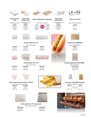 Papier siarczan biały Papier biały foliowany PE Papier brązowy do burgerów Papier biały foliowany PE Odcinacz (na blat) Sulfate paper white Wrapping paper with PE white Brown paper for burgers Wrapping paper with PE white Paper roll cutter (table-top) PRK001 PRK005 11142 11142 PRK006 H9010N 70 x 110 cm 30 x 40 cm 30 x 40 cm 45 x 60 cm rolka szer.40 cm szer. 50 cm 40 gsm, 30+10 gsm 38 gsm 38 gsm 40+15 gsm 27,55 x 43,3 in 11,8 x 15,75 in 11,8 x 15,75 in 17 x 23 in roll width 15,75 in width 19,7 in 10 kg 10 kg 1000 szt 1000 szt 10 kg 1 szt. / psc Koperta pap. BRĄZOWA Koperta papierowa + PE Paper + PE envelope Paper envelope KRAFT RK010PE RK011PE RK013PE RKPB16 130 x 130 155 x 160 80 x 200 160 x 170 5,1 x 5,1 in 6,1 x 6,3 in 3,15 x 7,85 in 6,3 x 6,7 in 200 szt. / psc 200 szt. / psc 200 szt. / psc 1000 szt. / psc Koperta papierowa + PE Torebka papierowa POPCORN Paper + PE envelope Paper bag POPCORN RK010PEH RK012PEK RK013PEH 130 x 130 170 x 170 80 x 200 140 x 50 x 220 5,1 x 5,1 in 6,5 x 6,7 in 3,15 x 7,85 in 5,5 x 1,97 x 8,66 in 200 szt. / psc 200 szt. / psc 200 szt. / psc 2000 szt. / psc Rożek papierowy uniwersalny "FRYTKI" TFB14522POP Torba pap. (HOT-DOG francuski) Paper envelope "FRENCH FRIES" Paper bag (FRENCH HOT-DOG) RKPP008F RKPP009F GDP17B 100 g 200 g 0,22 Ib 0,44 Ib 200 szt. / psc 200 szt. / psc GDP17S 100 x 170 mm 3,95 x 6,7 in 2000 szt. / psc 2000 szt. / psc Torba papierowa + PE na kurczaka Paper bag +PE for chicken TPB2623KUR TPB2630KUR 260 x 230 mm 260 x 300 mm 10,24 x 9,06 in 10,24 x 11,81 in 2000 szt. / psc 2000 szt. / psc strona/page 31 Opakowanie perg. z folią na kanapkę "SNACK BAG" Snack Bag greaseproof + PET film for sandwich 1002283 1002254 1002241 150x65/60x100 mm 40gsm +PET 180x70/50x130 mm 40gsm +PET 215x75/50/130 mm 40gsm +PET 5,91 x 2,56/2,36 x 3,94 in 7,1 x 2,75/1,95 x 5,1 in 8,45 x 3,15/1,95 x 5,1 in 1000 szt. / psc 1000 szt. / psc 1000 szt. / psc Opakowanie perg. z folią na kanapkę "SNACK BAG" Snack Bag greaseproof + PET film for sandwich 1002243 1002284 280x75/60x130 mm 40gsm +PET 330x85/70x130 mm 40gsm +PET 11 x 2,95/2,35 x 5,1 in 12,99 x 3,35/2,76 x 5,12 in 1000 szt. / psc 500 szt. / psc Opakowanie perg. z folią na kanapkę "SNACK BAG" Opakowanie pap. z folią PANO RAZOR "BON APPETIT" XXL Snack Bag greaseproof + PET film for sandwich Paper packaging with film PANO RAZOR "Bon Appetit" XXL 1002255 1002242 1002839 180x70/50x130 mm 40gsm +PET 215x75/50/130 mm 40gsm +PET 120 x 50 x 300 mm 7,1 x 2,75/1,95 x 5,1 in 8,45 x 3,15/1,95 x 5,1 in 4,72 x 1,95 x 11,81 in 1000 szt. / psc 1000 szt. / psc 1000 szt. / psc Opakowanie perg. na kanapkę "SNACK BAG" Snack Bag greaseproof for sandwich 1002275 1002267 1002276 180x70/50x130 mm 40gsm 215x60/60/130 mm 40gsm 330x85/70x130 mm 40gsm 7,1 x 2,75/1,95 x 5,1 in 8,45 x 2,35/2,35 x 5,1 in 12,99 x 3,35/2,76 x 5,12 in 1000 szt. / psc 1000 szt. / psc 500 szt. / psc Opakowanie perg. na burgera "SNACK BAG" Opakowanie termiczne na kanapkę "SNACK BAG THERMO" Opakowanie pap. z folią LOC BAG RAZO "BON APPETIT" Snack Bag greaseproof for burger "Thermo" Snack Bag Paper packaging with film LOC BAG RAZO "Bon Appetit" 1002560 1002301 1002621 150 x 85/85x165 mm, 40gsm 215 x 85/50x130 mm, 45gsm + 30 gsm 170 x 245 mm 5,91 x 3,35/3,35 x 6,5 in 8,46 x 3,35/1,97 x 5,12 in 500 szt. / psc 1000 szt. / psc 1000 szt. / psc strona/page 32 6,7 x 9,64 in Bagietka - z folią BAGIETKA z papierem powlekanym Baguette with paper Baguette with film 010 010R 048 048K 1000 szt. / psc 1000 szt. / psc 1000 szt. / psc 1000 szt. / psc Bagietka z folią perforowaną i z opaską 168 Baguette collar with perforated film 168E 1000 szt. / psc 1000 szt. / psc KANAPKA z papierem powlekanym PANINI z papierem powlekanym Panini with paper 002 002G 1000 szt. / psc 1000 szt. / psc Kanapka kwadratowa - z folią Square Sandwich with paper Square Sandwich/Bap with film 045M 044 159 159J 1000 szt. / psc 1000 szt. / psc 1000 szt. / psc 1000 szt. / psc Kanapka boczna - z folią Kanapka klasyczna - z folią Stack Bloomer with Film Bloomer with film 263 263K 154 154W 500 szt. / psc 500 szt. / psc 1000 szt. / psc 1000 szt. / psc Kanapka boczna - z folią BAJGIEL z papierem powlekanym Bagel with paper Stack Sandwich with film 032 032T 238 238A 1000 szt. / psc 1000 szt. / psc 800 szt. / psc 800 szt. / psc strona/page 33 Opakowanie z tektury falistej z folią do GORĄCEJ KANAPKI Opakowanie z tektury falistej z folią perforowaną do GORĄCEJ KANAPKI HOT RAP - Hot Bap/Sandwich with film HOT RAP - Hot Pastry Savoury with perforated film Opakowanie z tektury falistej z folią do GORĄCEJ PRZEKĄSKI 159FPAM 159FPA HOT RAP - Hot Sausage Roll perforated film 237 800 szt. / psc 800 szt. / psc 1200 szt. / psc Opakowanie pap.z okienkiem do trójkątnej kanapki (1-dniowej) Standard Fill Day Fresh Sandwich Wedge 5303AA 5303AB 60 mm 60 mm 5301AA 72 mm 5301AB 72 mm 2,35 in 2,35 in 2,85 in 2,85 in 500 szt. / psc 500 szt. / psc 500 szt. / psc 500 szt. / psc Opakowanie pap.z okienkiem do trójkątnej kanapki (3-dniowej) Freshpack Long Life Sandwich Wedge 3107WH-LHS 3107KR-LHS 3010WH-LHS 3010KR-LHS 63 mm 63 mm 78 mm 78 mm 2,5 in 2,5 in 3,1 in 3,1 in 650 szt. / psc 650 szt. / psc 650 szt. / psc 650 szt. / psc Opakowanie pap.z okienkiem na kanapkę Kartonik na tortille Bloomer box Tortilla Wrap Box 5000AA - 500 szt. / psc 500 szt. / psc Tortilla/bajgiel/bułka - z folią Długa Tortilla - z folią Deli Pouch (tortilla) with film Long Tortilla with film 177 177H 293B 293C 1000 szt. / psc 1000 szt. / psc 800 szt. / psc 800 szt. / psc strona/page 34 Pojemnik pap.z okienkiem na sałatkę Short Life Food Tray 6005WH 6006WH 6005KR 6006KR 6007AA 120 x 120 x 45 mm 190 x 140 x 45 mm 75 x 75 x 108 mm 4,72 x 4,72 x 1,77 in 7,48 x 5,51 x 1,77 in 2,95 x 2,95 x 4,25 in 360 szt. / psc 360 szt. / psc 400 szt. / psc Pojemnik do dań gorących / zimnych Opakowanie papierowe MULTI burger Food box Multi RAP 6023WH 6022WH 329A 420szt. / psc 280 szt. / psc 500 szt. / psc strona/page 35 Opakowanie papierowe PleatPak Paper