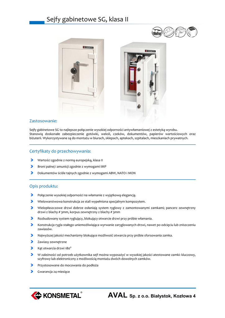 Sejfy gabinetowe SG, klasa II Zastosowanie: Sejfy gabinetowe SG to najlepsze połączenie wysokiej odporności antywłamaniowej z estetyką wyrobu. Stanowią doskonałe zabezpieczenie gotówki, weksli, czeków, dokumentów, papierów wartościowych oraz biżuterii. Wykorzystywane są do montażu w biurach, sklepach, aptekach, szpitalach, mieszkaniach prywatnych. Certyfikaty do przechowywania: Wartości zgodnie z normą europejską, klasa II Broni palnej i amunicji zgodnie z wymogami IMP Dokumentów ściśle tajnych zgodnie z wymogami ABW, NATO i MON Opis produktu: Połączenie wysokiej odporności na włamanie z wyjątkową elegancją. Wielowarstwowa konstrukcja ze stali wypełniona specjalnym kompozytem. Wielopłaszczowe drzwi dobrze osłaniają system ryglowy z zamontowanymi zamkami; pancerz zewnętrzny drzwi z blachy # 3mm, korpus zewnętrzny z blachy # 3mm Rozbudowany system ryglujący, blokujący otwarcie drzwi przy próbie włamania. Konstrukcja rygla stałego uniemożliwiająca wyrwanie zaryglowanych drzwi, nawet po odcięciu lub zniszczeniu zawiasów. Najwyższej jakości mechanizmy blokujące możliwość otwarcia przy próbie sforsowania zamka. Zawiasy zewnętrzne Kąt otwarcia drzwi 1800 W zależności od potrzeb użytkownika sejf można wyposażyć w wysokiej jakości atestowane zamki: kluczowy, szyfrowy lub elektroniczny z możliwością montażu dwóch dowolnych zamków. Przystosowane do mocowania do podłoża Gwarancja 24 miesiące AVAL Sp. z o.o. Białystok, Kozłowa 4 Sejfy gabinetowe SG, klasa II Wyposażenie podstawowe: Zamek kluczowy kl. A z dwoma kluczami Półki z regulacją wysokości zawieszenia; maksymalne obciążenie półki 50 kg Kotwienie: 2 otwory w dnie sejfu, kotwa M12 x 210 mm (śruba rozporowa osadzona w podłożu na głębokość min 130 mm w betonie B20) Wyposażenie dodatkowe: Trzeci klucz do zamka kluczowego Wyprowadzenie przewodów do podłączenia instalacji alarmowej Czujniki wstrząsowe – przekazują impuls do systemu alarmowego przy próbie włamania Czujnik położenia rygli - przekazuje impuls do systemu alarmowego o stanie otwarcia drzwi Wrzutnie bębnowe (WBX) do deponowania banknotów lub bezpiecznych kopert Wewnętrzne skrytki indywidualnie zamykane - dodatkowe zabezpieczenie Dodatkowe półki Rodzaje zamków: kluczowy szyfrowy elektroniczny Standardowe kolory: Jasnoszary RAL 7035 (domyślny przy zamówieniu, jeśli nie zaznaczono koloru) Jasnoszary RAL 9002 (należy zaznaczyć w zamówieniu, bezpłatny) Czarny RAL 9005 (należy zaznaczyć w zamówieniu, bezpłatny) *Na indywidualne zamówienie wszystkie kolory z palety RAL (lakier proszkowy) AVAL Sp. z o.o. Białystok, Kozłowa 4 Sejfy gabinetowe SG, klasa II Dane techniczne: Wymiary zewnętrzne [mm] Wymiary wewnętrzne [mm] W S G W S G Waga [kg] 550 480 480 395 360 300 88 43 SG 65 650 480 480 495 360 300 110 53 SG 70 700 480 480 545 360 300 112 59 SG 90 900 480 480 745 360 300 138 80 SG 100 1000 510 480 845 390 300 157 99 SG 120 1200 510 480 1045 390 300 185 122 SG 140 1400 510 500 1245 390 320 230 155 SG 160 1600 510 500 1445 390 320 246 180 SG 180 1800 510 500 1645 390 320 279 205 SGP 140 1400 730 730 1245 610 550 360 418 Model SG 55 Pojemność [l] SGP 160 1600 730 730 1445 610 550 390 485 SGP 180 1800 730 730 1645 610 550 447 552 Półki [szt.] Skrytka* SG 55 1 Nie Kombinacja dwóch zamków* Nie SG 65, SG 70 1 Tak Tak SG 90, SG 100 2 Tak Tak SG 120, SG 140, SGP 140 3 Tak Tak SG 160, SG 180, SGP 160, SGP 180 4 Tak Tak Model *Możliwość zastosowania jako wyposażenia dodatkowego Skrytka* Wymiary zewnętrzne [mm] Światło drzwi [mm] W S G W S 240 360 240 190 220 SG 100 - SG 120 240 390 240 190 250 SG 140 - SG 180 290 390 260 240 250 SGP 140 - SGP 180 290 610 490 240 470 SG 55 - SG 90 *Skrytka indywidualnie zamykana na zamek kluczowy bębenkowy (oznaczenie - T np. SG 70T) AVAL Sp. z o.o. Białystok, Kozłowa 4 Sejfy gabinetowe SG, klasa II Prześwit drzwi [mm] Promień otwarcia drzwi R [mm] W S 415 395 360 SG 65 415 495 360 SG 70 415 545 360 SG 90 415 745 360 SG 100 445 845 390 SG 120 445 1045 390 SG 140 445 1245 390 SG 160 445 1445 390 SG 180 445 1645 390 SGP 140 665 1245 610 Model SG 55 SGP 160 665 1445 610 SGP 180 665 1645 610 AVAL Sp. z o.o. Białystok, Kozłowa 4 Sejfy gabinetowe SG, klasa II Eksploatacja: Użytkowanie wyrobów winno odbywać się w pomieszczeniach zabezpieczonych przed działaniem czynników atmosferycznych z dala od substancji działających korodująco na metale. Wilgotność względna w pomieszczeniu do 75%. Urządzenie może pracować w pomieszczeniach, w których temperatura mieści się w granicach od +5°C do +40°C. Zamykając lub otwierając wyrób należy zwracać uwagę na ruchome elementy np.: szufladę, drzwi. Niewłaściwie eksploatowane mogą doprowadzić do uszkodzenia ciała np.: palców, jeśli zostaną między szufladą a korpusem lub drzwiami a korpusem. Należy zwracać uwagę na położenie rygli podczas zamykania drzwi, rygle bezwzględnie muszą być schowane w przeciwnym przypadku możemy trwale uszkodzić mechanizmy. Zamontowanych zamków i mechanizmów nie wolno przerabiać pod groźbą utraty gwarancji. Montować zamki i mechanizmy w okresie gwarancji może autoryzowany serwis lub użytkownik posiadający pisemne zezwolenie serwisu. W razie konieczności zmiany kluczy zaleca się wymianę całego zamka. Należy zwrócić uwagę na posadowienie sejfu w taki sposób, aby drzwi nie uderzały bezpośrednio o przeszkody. Mechanizmy ryglujące oraz zamki powinny pracować płynnie i bez zacięć, gdy zaistnieje jakiekolwiek zastrzeżenie, co do pracy wymienionych podzespołów należy ten fakt zgłosić do serwisu KONSMETAL. Gdy zaistnieją jakiekolwiek zastrzeżenia, co do dostarczonego wyrobu należy zgłaszać je do serwisu KONSMETAL. Nie zaleca się dokonywania przeróbek bez wiedzy producenta nawet po zakończeniu okresu gwarancji. Konserwacja: Drzwi: Zaleca się przesmarowanie zawias w miarę potrzeb, nie rzadziej jednak jak raz na 