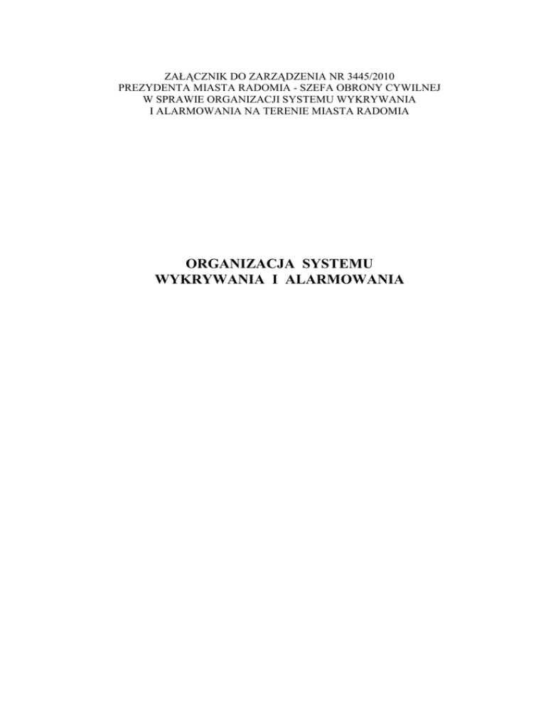 ZAŁĄCZNIK DO ZARZĄDZENIA NR 3445/2010 PREZYDENTA MIASTA RADOMIA - SZEFA OBRONY CYWILNEJ W SPRAWIE ORGANIZACJI SYSTEMU WYKRYWANIA I ALARMOWANIA NA TERENIE MIASTA RADOMIA ORGANIZACJA SYSTEMU WYKRYWANIA I ALARMOWANIA I.ZADANIA SWA. Do podstawowych zadań jednostek organizacyjnych SWA naleŜy: 1. Wykrywanie i rozpoznanie skaŜeń promieniotwórczych, biologicznych i chemicznych (w tym toksycznymi środkami przemysłowymi) oraz innych nadzwyczajnych zagroŜeń ludzi i środowiska. 2. Wykrywanie i określanie parametrów uderzeń Bronią Masowego RaŜenia (NBC). 3. Pobieranie próbek i określanie rodzaju i stopnia skaŜenia, zakaŜenia produktów Ŝywnościowych, płodów rolnych, roślinności, pasz, wody pitnej, wód powierzchniowych oraz gleby i powietrza. 4. Oznaczanie stref niebezpiecznych. 5. Wstępne określanie skutków nadzwyczajnych zagroŜeń. 6. Przekazywanie danych o uŜyciu broni NBC, skaŜeniach, zakaŜeniach i innych nadzwyczajnych zagroŜeniach ludzi i środowiska do jednostek nadrzędnych, współdziałających i podległych. 7. Zbieranie i opracowywanie, analizowanie danych na podstawie informacji otrzymywanych z jednostek wykrywania oraz innych źródeł. 8. Określanie skali i skutków skaŜeń, zakaŜeń oraz innych nadzwyczajnych zagroŜeń dla ludzi i środowiska oraz prognozowanie rozwoju wydarzeń. 9. Powiadamianie organów decyzyjnych, instytucji, organizacji i formacji, ekspertów, które mają obowiązek zareagowania na niebezpieczne zdarzenia, o jego wystąpieniu lub groźbie wystąpienia. 10. Ostrzeganie i alarmowanie zagroŜonej ludności, a takŜe informowanie o zaleconych sposobach postępowania w zaistniałej sytuacji. 11. Opracowywanie wniosków i propozycji dla właściwych organów kierowania OC. 12. Koordynowanie działań jednostek organizacyjnych wykrywania zagroŜeń. 13. Wymiana informacji dotyczących nadzwyczajnych zagroŜeń ludzi i środowiska z odpowiednimi jednostkami organizacyjnymi OC sąsiednich powiatów oraz innymi jednostkami organizacyjnymi zgodnie z zaleceniami i obowiązującymi procedurami postępowania. 14. Prowadzenie nasłuchu w radiowej sieci ostrzegania (szczegółowe zadania zostaną określone odrębnymi wytycznymi); 2 II. ZASADY TWORZENIA JEDNOSTEK ORGANIZACYJNYCH SWA Na szczeblu powiatu tworzy się: 1. POWIATOWY OŚRODEK ANALIZY DANYCH I ALARMOWANIA. 2. POWIATOWY OŚRODEK ANALIZ LABORATORYJNYCH. POWIATOWY OŚRODEK ANALIZY DANYCH I ALARMOWANIA powołuje Szef OC Miasta na bazie Urzędu Miejskiego poprzez nadanie przydziałów organizacyjnomobilizacyjnych obsadzie osobowej ośrodka. Przydziały organizacyjno-mobilizacyjne POADA przygotowuje kierownik komórki organizacyjnej właściwej w sprawach obrony cywilnej (zarządzania kryzysowego) Urzędu Miejskiego. POWIATOWY OŚRODEK ANALIZ LABORATORYJNYCH powołuje Szef OC Miasta poprzez nadanie przydziału organizacyjno - mobilizacyjnego Kierownikowi Powiatowej Stacji Sanitarno-Epidemiologicznej na funkcje komendanta ośrodka, a Kierownikowi Powiatowego Inspektoratu Weterynarii i Kierownikowi Terenowej Stacji Ochrony Roślin i Nasiennictwa na stanowiska komendantów sekcji. Komendant ośrodka w porozumieniu z kierownikiem komórki organizacyjnej właściwej w sprawach obrony cywilnej( zarządzania kryzysowego) Urzędu Miejskiego określa szczegółową strukturę organizacyjną i skład ośrodka, a następnie nadaje pracownikom PSSE, PIWet i TSORiN przydziały organizacyjno-mobilizacyjne. W przypadku, gdy PSSE nie posiada laboratorium, w skład powiatowej sekcji sanitarno-epidemiologicznej naleŜy włączyć zakładowe druŜyny laboratoryjne zakładów pracy wytypowanych przez Powiatowego Inspektora Sanitarnego. III. ORGANIZACJA ŁĄCZNOŚCI, OSTRZEGANIE I ALARMOWANIE W SWA 1. Łączność w SWA na terenie miasta Radomia jest organizowana przy wykorzystaniu technicznych środków łączności przewodowej i bezprzewodowej. 2. Zasadniczą (podstawową) siecią łączności w SWA jest Sieć Radiowa Zarządzania Wojewody Mazowieckiego. Pozostałe systemy łączności naleŜy traktować jako rozwiązania wspomagające i dublujące. 3. Zasady pracy w Sieci Zarządzania Wojewody Mazowieckiego zostały określone w „REGULAMINIE PRACY SIECI RADIOWEJ ZARZĄDZANIA WOJEWODY MAZOWIECKIEGO”. 4. Do ostrzegania i alarmowania ludności wykorzystuje się : - scentralizowane systemy alarmowe sterowane radiowo ; pojedyncze syreny alarmowe nie wchodzące w skład scentralizowanych systemów alarmowych; rozgłośnie radiowe i ośrodki telewizyjne; urządzenia nagłaśniające stacjonarne i na pojazdach; inne dostępne urządzenie mogące słuŜyć temu celowi. 5. Urządzenia alarmowe sterowane radiowo utrzymuje się w stałej gotowości do działania. 6. Za utrzymanie, sprawność i konserwację urządzeń alarmowych odpowiedzialny jest Dyrektor Wydziału Bezpieczeństwa i Zarządzania Kryzysowego (WBiZK). 3 IV. ZASADY WSPÓŁDZIAŁANIA I OBIEGU INFORMACJI System wykrywania i alarmowania współdziała ze słuŜbami i systemami, które mogą stanowić źródło informacji o zagroŜeniach dla ludności ( Jednostki MON, PSP, Policji, meteorologiczne, itp.). Współdziałanie to powinno polegać na wzajemnej wymianie informacji, uzyskiwanych w ramach własnej działalności, a mających bezpośredni lub pośredni związek z występowaniem zagroŜenia dla ludności i środowiska. 1. Ustala się następujące zasady przekazywania informacji w systemie wykrywania i alarmowania do jednostek nadrzędnych i współdziałających: Natychmiast przekazuje się informacje dotyczące awarii, katastrof, skaŜeń, zakaŜeń, uŜycia NBC i innych zagroŜeń dla ludzi i środowiska oraz wzrostu mocy dawki tła promieniowania gamma powyŜej dwukrotnej dopuszczalnej wartości oraz ponownego jej wzrostu o dowolną wartość; Okresowo przekazuje się informacje pomiarów mocy dawki promieniowania gamma, kontroli napromieniowania ludności, skaŜeń komponentów środowiska i Ŝywności oraz warunków meteorologicznych; 