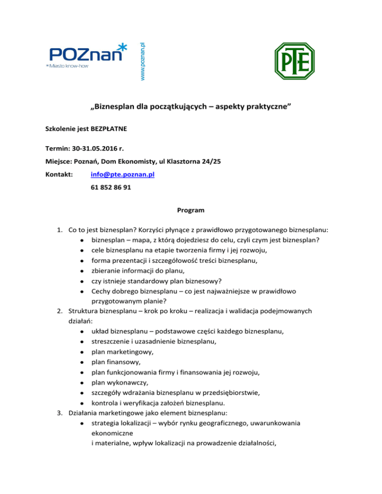 „Biznesplan dla początkujących – aspekty praktyczne” Szkolenie jest BEZPŁATNE Termin: 30-31.05.2016 r. Miejsce: Poznao, Dom Ekonomisty, ul Klasztorna 24/25 Kontakt: [email protected] 61 852 86 91 Program 1. Co to jest biznesplan? Korzyści płynące z prawidłowo przygotowanego biznesplanu: biznesplan – mapa, z którą dojedziesz do celu, czyli czym jest biznesplan? cele biznesplanu na etapie tworzenia firmy i jej rozwoju, forma prezentacji i szczegółowośd treści biznesplanu, zbieranie informacji do planu, czy istnieje standardowy plan biznesowy? Cechy dobrego biznesplanu – co jest najważniejsze w prawidłowo przygotowanym planie? 2. Struktura biznesplanu – krok po kroku – realizacja i walidacja podejmowanych działao: układ biznesplanu – podstawowe części każdego biznesplanu, streszczenie i uzasadnienie biznesplanu, plan marketingowy, plan finansowy, plan funkcjonowania firmy i finansowania jej rozwoju, plan wykonawczy, szczegóły wdrażania biznesplanu w przedsiębiorstwie, kontrola i weryfikacja założeo biznesplanu. 3. Działania marketingowe jako element biznesplanu: strategia lokalizacji – wybór rynku geograficznego, uwarunkowania ekonomiczne i materialne, wpływ lokalizacji na prowadzenie działalności, narzędzia kształtowania produktu – wybór strategii produktowej, kształtowanie marki, planowanie strategii cenowych, wybór kanałów dystrybucji – maksymalne pokrycie sieci przy możliwie najniższych kosztach, strategie promocji i reklamy, strategie budowania przewagi konkurencyjnej – konkurencja – szanse i zagrożenia dla rozwoju, ocena głównych konkurentów, strategie marketingu MIX jako podstawa pozycjonowania firmy na rynku, public relations – jak kształtowad wizerunek firmy. 4. Aspekty finansowe biznesplanu: czym jest plan finansowy – cele planu finansowego na etapie tworzenia firmy i jej rozwoju, zarządzanie ryzykiem finansowym, Kalkulowanie kosztów inwestycyjnych na etapie tworzenia firmy i na etapie wdrażania inwestycji rozwojowych – szacownie zapotrzebowania na kapitał obrotowy i inwestycyjny, założenia marketingowe w planowaniu finansowym, planowanie poziomu przychodów i kosztów – miesięczne i roczne planowania sprzedaży, cen, przychodów, zastosowanie arkusza kalkulacyjnego EXCEL do planowania finansowego – tworzenia sprawozdao finansowych i analiz wskaźników. 5. Ocena ryzyka – biznesplan jako metoda minimalizacji ryzyka związanego z prowadzeniem własnej firmy: biznesplan a finansowanie przedsięwzięcia, budowa sprawozdao finansowych (bilansu, rachunku zysków i strat oraz rachunku przepływów pieniężnych – cash flow), wskaźniki operacyjne i finansowe, ocena opłacalności przedsięwzięcia – analiza struktury kosztów, aktywów i pasywów, statystyczne i dynamiczne metody oceny projektów (PB, DPB, ARR, NPV, IRR) – planowanie wskaźników efektywności ekonomicznej – wskaźnik zadłużenia, płynności finansowej, NPV, FIRR, jak czytad wyniki firmy – analiza wskaźników ekonomicznych, analiza finansowa – jej zakres i funkcje w różnych wzorach biznesplanów, analiza SWOT – szanse, zagrożenia, słabe i mocne strony – analiza jako element planu i narzędzie minimalizacji ryzyka działalności gospodarczej. 6. Praktyczne problemy związane z opracowaniem biznesplanu – case study: struktura biznesplanu obowiązująca przy ubieganiu się o finansowanie komercyjne: kredyty inwestycyjne i obrotowe, finansowanie leasingiem i factoringiem, omówienie najczęściej popełnianych błędów w biznesplanie – studium przypadku, analiza przykładowych biznesplanów – studium przypadku.