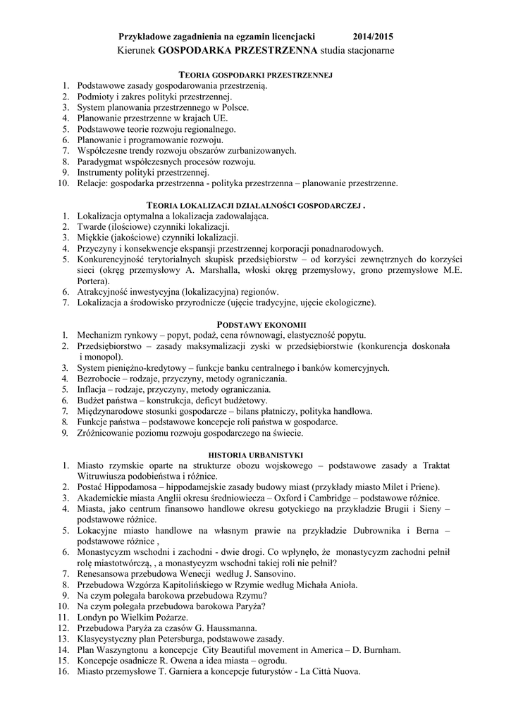 Przykładowe zagadnienia na egzamin licencjacki 2014/2015 Kierunek GOSPODARKA PRZESTRZENNA studia stacjonarne 1. 2. 3. 4. 5. 6. 7. 8. 9. 10. TEORIA GOSPODARKI PRZESTRZENNEJ Podstawowe zasady gospodarowania przestrzenią. Podmioty i zakres polityki przestrzennej. System planowania przestrzennego w Polsce. Planowanie przestrzenne w krajach UE. Podstawowe teorie rozwoju regionalnego. Planowanie i programowanie rozwoju. Współczesne trendy rozwoju obszarów zurbanizowanych. Paradygmat współczesnych procesów rozwoju. Instrumenty polityki przestrzennej. Relacje: gospodarka przestrzenna - polityka przestrzenna – planowanie przestrzenne. TEORIA LOKALIZACJI DZIAŁALNOŚCI GOSPODARCZEJ . Lokalizacja optymalna a lokalizacja zadowalająca. Twarde (ilościowe) czynniki lokalizacji. Miękkie (jakościowe) czynniki lokalizacji. Przyczyny i konsekwencje ekspansji przestrzennej korporacji ponadnarodowych. Konkurencyjność terytorialnych skupisk przedsiębiorstw – od korzyści zewnętrznych do korzyści sieci (okręg przemysłowy A. Marshalla, włoski okręg przemysłowy, grono przemysłowe M.E. Portera). 6. Atrakcyjność inwestycyjna (lokalizacyjna) regionów. 7. Lokalizacja a środowisko przyrodnicze (ujęcie tradycyjne, ujęcie ekologiczne). 1. 2. 3. 4. 5. PODSTAWY EKONOMII 1. Mechanizm rynkowy – popyt, podaż, cena równowagi, elastyczność popytu. 2. Przedsiębiorstwo – zasady maksymalizacji zyski w przedsiębiorstwie (konkurencja doskonała i monopol). 3. System pieniężno-kredytowy – funkcje banku centralnego i banków komercyjnych. 4. Bezrobocie – rodzaje, przyczyny, metody ograniczania. 5. Inflacja – rodzaje, przyczyny, metody ograniczania. 6. Budżet państwa – konstrukcja, deficyt budżetowy. 7. Międzynarodowe stosunki gospodarcze – bilans płatniczy, polityka handlowa. 8. Funkcje państwa – podstawowe koncepcje roli państwa w gospodarce. 9. Zróżnicowanie poziomu rozwoju gospodarczego na świecie. HISTORIA URBANISTYKI 1. Miasto rzymskie oparte na strukturze obozu wojskowego – podstawowe zasady a Traktat Witruwiusza podobieństwa i różnice. 2. Postać Hippodamosa – hippodamejskie zasady budowy miast (przykłady miasto Milet i Priene). 3. Akademickie miasta Anglii okresu średniowiecza – Oxford i Cambridge – podstawowe różnice. 4. Miasta, jako centrum finansowo handlowe okresu gotyckiego na przykładzie Brugii i Sieny – podstawowe różnice. 5. Lokacyjne miasto handlowe na własnym prawie na przykładzie Dubrownika i Berna – podstawowe różnice , 6. Monastycyzm wschodni i zachodni - dwie drogi. Co wpłynęło, że monastycyzm zachodni pełnił rolę miastotwórczą, , a monastycyzm wschodni takiej roli nie pełnił? 7. Renesansowa przebudowa Wenecji według J. Sansovino. 8. Przebudowa Wzgórza Kapitolińskiego w Rzymie według Michała Anioła. 9. Na czym polegała barokowa przebudowa Rzymu? 10. Na czym polegała przebudowa barokowa Paryża? 11. Londyn po Wielkim Pożarze. 12. Przebudowa Paryża za czasów G. Haussmanna. 13. Klasycystyczny plan Petersburga, podstawowe zasady. 14. Plan Waszyngtonu a koncepcje City Beautiful movement in America – D. Burnham. 15. Koncepcje osadnicze R. Owena a idea miasta – ogrodu. 16. Miasto przemysłowe T. Garniera a koncepcje futurystów - La Città Nuova. TEORIA URBANISTYKI 1. Omów rolę, jaką może odgrywać kompozycja przestrzenna w funkcjonowaniu miasta, na przykładzie wskazanego elementu kompozycji urbanistycznej. 2. Scharakteryzuj wpływ wskazanego elementu krajobrazu miasta na postrzeganie przestrzeni miejskiej przez obserwatora. 3. Opisz, posługując się przykładami, zasadę oddziaływania na krajobraz miasta i sposób wykorzystania w projektowaniu urbanistycznym „elementu krystalizującego plan”. 4. W jaki sposób ustala się odległość projektowanej zabudowy od granic działki budowlanej? 5. W jaki sposób ustala się odległość projektowanej zabudowy od zabudowy sąsiadującej? 6. Opisz zasadę i sposoby realizacji hierarchicznego układu komunikacji drogowej. 7. Omów miejsce i rolę samochodu w kształtowaniu osiedli mieszkaniowych. 8. Scharakteryzuj wpływ potrzeb komunikacji pieszej na kształtowanie przestrzeni miejskiej. 9. Jednostka sąsiedzka Clarence'a Perry'ego i jej stosowanie we współczesnej urbanistyce. 10. Jakie cele można osiągnąć stosując niską intensywną zabudowę mieszkaniową? 11. Wpływ idei zrównoważonego rozwoju na strukturę funkcjonalno-przestrzenną miasta. 12. Omów cechy charakterystyczne śródmieścia oraz procesy zachodzące w nim współcześnie. 13. Czym jest centrum funkcjonalne w mieście, jakie są jego rodzaje i współczesne tendencje kształtowania? 14. Jak wpływa koncentryczno-falowy rozwój miast na ich strukturę funkcjonalno-przestrzenną? 15. Scharakteryzuj idee Nowego Urbanizmu i źródła ich powstania. 16. Omów wskazane prawo z teorii rozwoju systemów ilustrując jego działanie przykładami z rozwoju przestrzeni miejskiej. GEOGRAFIA EKONOMICZNA Przedmiot i metody geografii ekonomicznej. Ogólnodostępne bazy danych. Role człowieka w gospodarce i społeczeństwie. Przyrost naturalny a rozwój społeczny i gospodarczy. Przyczyny i skutki migracji oraz ich wpływ na rozwój społeczeństwa i gospodarki. Kapitał ludzki i kapitał społeczny w procesach rozwoju. Modele przestrzenne w gospodarce. Zróżnicowanie rolnictwa i jego związki z poziomem rozwoju gospodarczego. Rozwój przemysłu i jego przemiany (XVIII-XXI w.) Klasyczne teorie Waltera Christallera i Augusta Löscha – ich znaczenie i aktualność.Koncepcja biegunów wzrostu i jej zastosowanie. 10. Współczesne teorie rozwoju gospodarczego. 1. 2. 3. 4. 5. 6. 7. 8. 9. TEORIA REGIONU SPOŁECZNO-EKONOMICZNEGO I POLITYKA REGIONALNA 1. Omów teorię rozwoju spolaryzowanego J. Friedmanna 2. Scharakteryzuj trzy typy regionów wyróżnione przez K. Dziewońskiego 3. Omów cechy regionu ekonomicznego i podaj przykłady zastosowania tej koncepcji w badaniach gospodarki przestrze