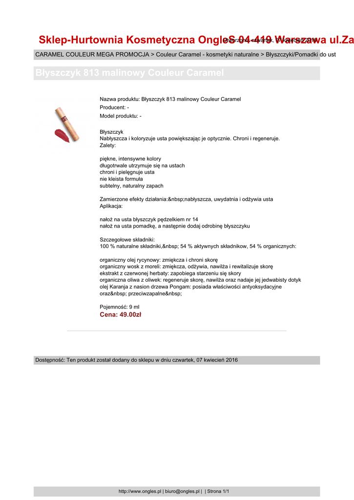 Utworzono: czwartek, Warszawa 07 kwiecień 2016 Sklep-Hurtownia Kosmetyczna OngleS 04-419 ul.Za CARAMEL COULEUR MEGA PROMOCJA > Couleur Caramel - kosmetyki naturalne > Błyszczyki/Pomadki do ust Błyszczyk 813 malinowy Couleur Caramel Nazwa produktu: Błyszczyk 813 malinowy Couleur Caramel Producent: Model produktu: Błyszczyk Nabłyszcza i koloryzuje usta powiększając je optycznie. Chroni i regeneruje. Zalety: piękne, intensywne kolory długotrwale utrzymuje się na ustach chroni i pielęgnuje usta nie kleista formuła subtelny, naturalny zapach Zamierzone efekty działania: nabłyszcza, uwydatnia i odżywia usta Aplikacja: nałoż na usta błyszczyk pędzelkiem nr 14 nałoż na usta pomadkę, a następnie dodaj odrobinę błyszczyku Szczegołowe składniki: 100 % naturalne składniki, 54 % aktywnych składnikow, 54 % organicznych: organiczny olej rycynowy: zmiękcza i chroni skorę organiczny wosk z moreli: zmiękcza, odżywia, nawilża i rewitalizuje skorę ekstrakt z czerwonej herbaty: zapobiega starzeniu się skory organiczna oliwa z oliwek: regeneruje skorę, nawilża oraz nadaje jej jedwabisty dotyk olej Karanja z nasion drzewa Pongam: posiada właściwości antyoksydacyjne oraz przeciwzapalne Pojemność: 9 ml Cena: 49.00zł Dostępność: Ten produkt został dodany do sklepu w dniu czwartek, 07 kwiecień 2016 http://www.ongles.pl | [email protected] | | Strona 1/1