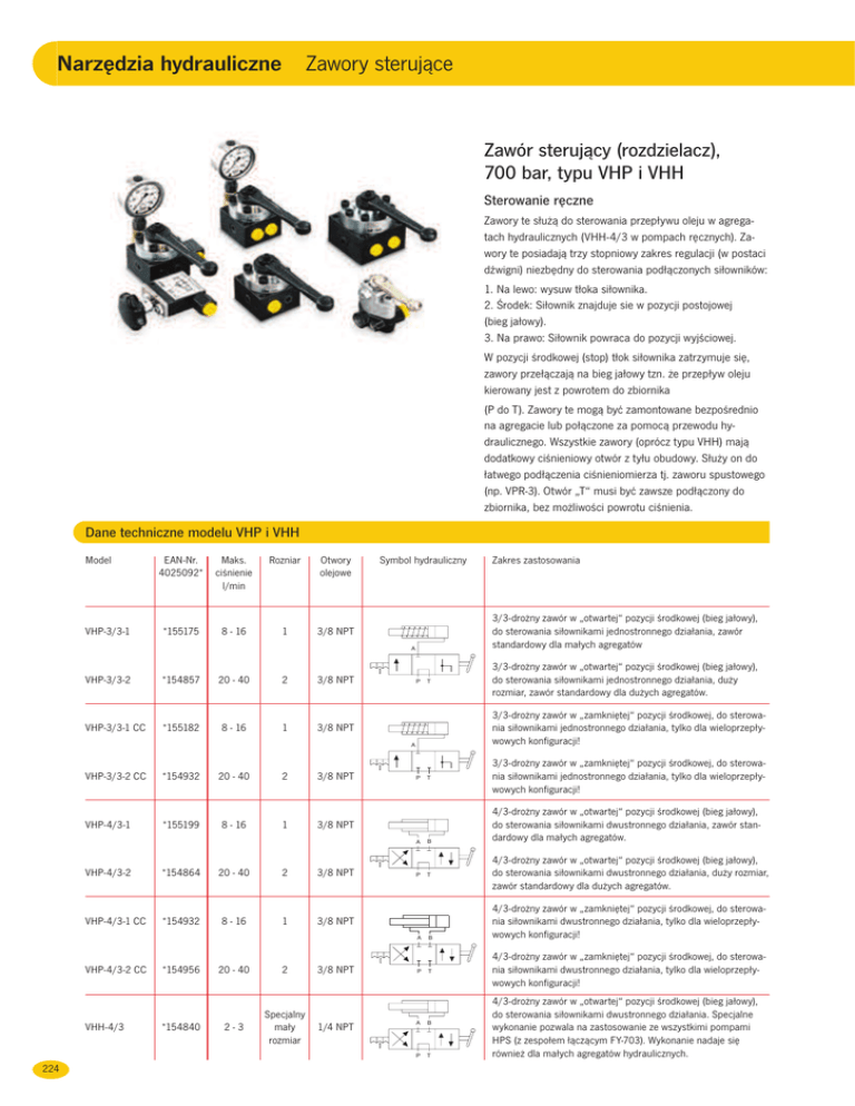 Zawory sterujące Narzędzia hydrauliczne Zawór sterujący (rozdzielacz), 700 bar, typu VHP i VHH Sterowanie ręczne Zawory te służą do sterowania przepływu oleju w agregatach hydraulicznych (VHH-4/3 w pompach ręcznych). Zawory te posiadają trzy stopniowy zakres regulacji (w postaci dźwigni) niezbędny do sterowania podłączonych siłowników: 1. Na lewo: wysuw tłoka siłownika. 2. Środek: Siłownik znajduje sie w pozycji postojowej (bieg jałowy). 3. Na prawo: Siłownik powraca do pozycji wyjściowej. W pozycji środkowej (stop) tłok siłownika zatrzymuje się, zawory przełączają na bieg jałowy tzn. że przepływ oleju kierowany jest z powrotem do zbiornika (P do T). Zawory te mogą być zamontowane bezpośrednio na agregacie lub połączone za pomocą przewodu hydraulicznego. Wszystkie zawory (oprócz typu VHH) mają dodatkowy ciśnieniowy otwór z tyłu obudowy. Służy on do łatwego podłączenia ciśnieniomierza tj. zaworu spustowego (np. VPR-3). Otwór „T“ musi być zawsze podłączony do zbiornika, bez możliwości powrotu ciśnienia. Dane techniczne modelu VHP i VHH Model VHP-3/3-1 EAN-Nr. 4025092* Maks. ciśnienie l/min Rozniar Otwory olejowe *155175 8 - 16 1 3/8 NPT Symbol hydrauliczny 3/3-drożny zawór w „otwartej“ pozycji środkowej (bieg jałowy), do sterowania siłownikami jednostronnego działania, zawór standardowy dla małych agregatów A VHP-3/3-2 *154857 20 - 40 2 3/8 NPT VHP-3/3-1 CC *155182 8 - 16 1 3/8 NPT P T *154932 20 - 40 2 3/8 NPT VHP-4/3-1 *155199 8 - 16 1 3/8 NPT VHP-4/3-2 *154864 20 - 40 2 3/8 NPT VHP-4/3-1 CC *154932 8 - 16 1 3/8 NPT VHP-4/3-2 CC VHH-4/3 224 *154956 *154840 20 - 40 2 2-3 Specjalny mały rozmiar 3/8 NPT 1/4 NPT 3/3-drożny zawór w „otwartej“ pozycji środkowej (bieg jałowy), do sterowania siłownikami jednostronnego działania, duży rozmiar, zawór standardowy dla dużych agregatów. 3/3-drożny zawór w „zamkniętej“ pozycji środkowej, do sterowania siłownikami jednostronnego działania, tylko dla wieloprzepływowych konfiguracji! A VHP-3/3-2 CC Zakres zastosowania P T A B P T A B P T A B P T 3/3-drożny zawór w „zamkniętej“ pozycji środkowej, do sterowania siłownikami jednostronnego działania, tylko dla wieloprzepływowych konfiguracji! 4/3-drożny zawór w „otwartej“ pozycji środkowej (bieg jałowy), do sterowania siłownikami dwustronnego działania, zawór standardowy dla małych agregatów. 4/3-drożny zawór w „otwartej“ pozycji środkowej (bieg jałowy), do sterowania siłownikami dwustronnego działania, duży rozmiar, zawór standardowy dla dużych agregatów. 4/3-drożny zawór w „zamkniętej“ pozycji środkowej, do sterowania siłownikami dwustronnego działania, tylko dla wieloprzepływowych konfiguracji! 4/3-drożny zawór w „zamkniętej“ pozycji środkowej, do sterowania siłownikami dwustronnego działania, tylko dla wieloprzepływowych konfiguracji! 4/3-drożny zawór w „otwartej“ pozycji środkowej (bieg jałowy), do sterowania siłownikami dwustronnego działania. Specjalne wykonanie pozwala na zastosowanie ze wszystkimi pompami HPS (z zespołem łączącym FY-703). Wykonanie nadaje się również dla małych agregatów hydraulicznych.